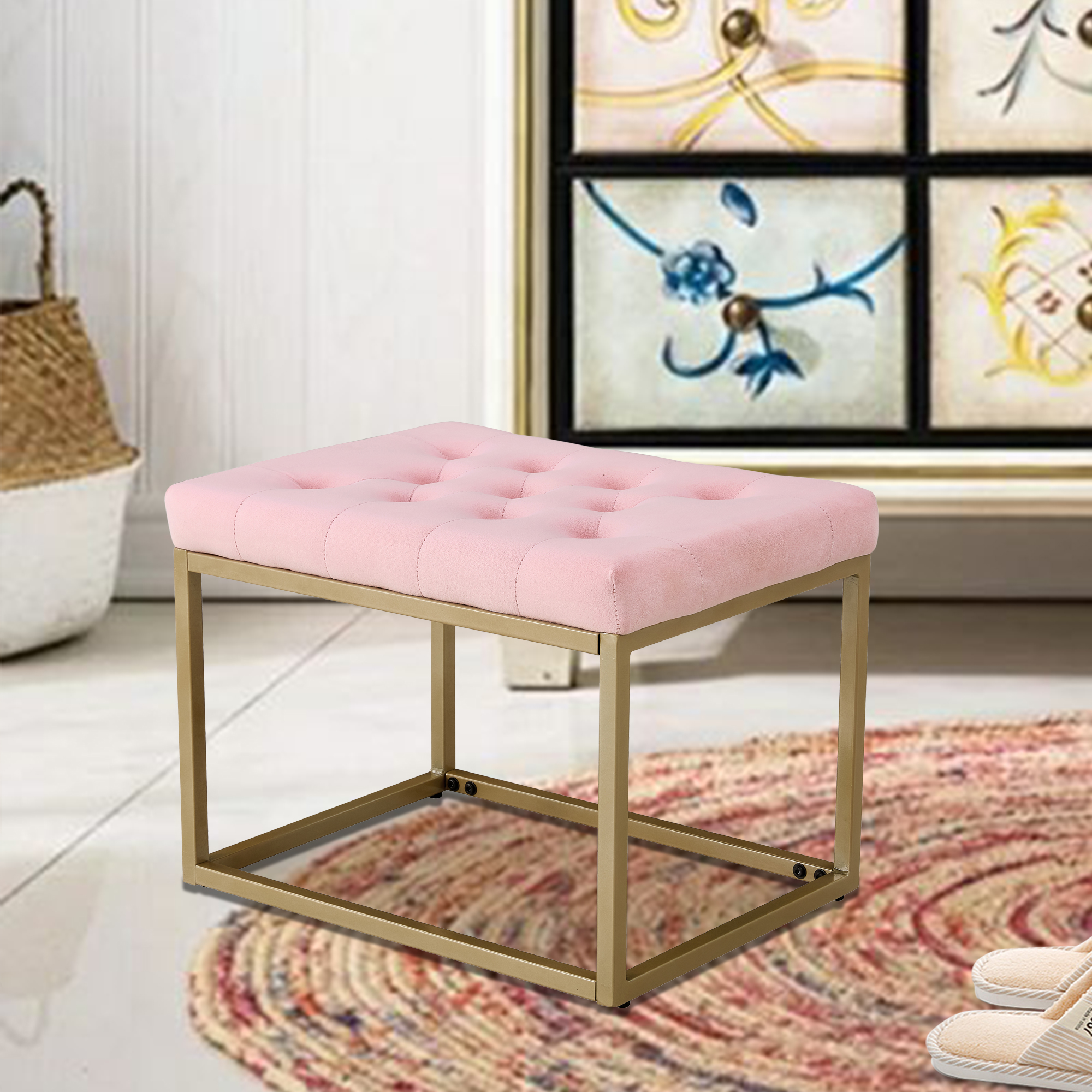 Velvet Shoe Changing Stool, Footstool, Square Cushion Foot Stool, Sofa stool, Rest stool,Low Stool .Step Stool, Small Footrest .Suitable for Clothes Shop,Living Room, Porch, Fitting Room.Pink Bench
