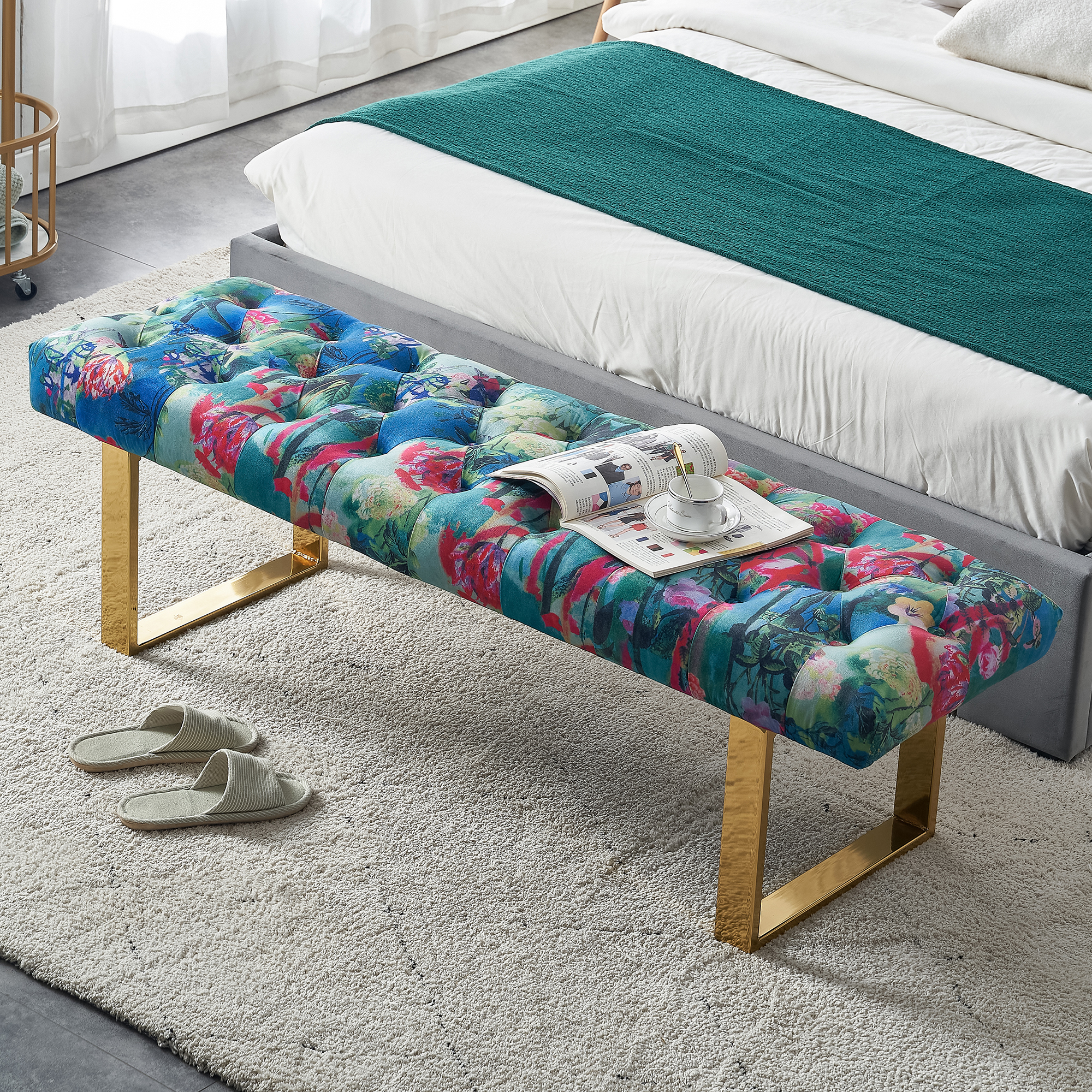 Bench Fabric Upholstered Bench flower color Gold Metal Legs .Shoe Changing Bench Sofa Bench Dining Chair .for to Bedroom Fitting Room, Store, Dining Room and Living Room.