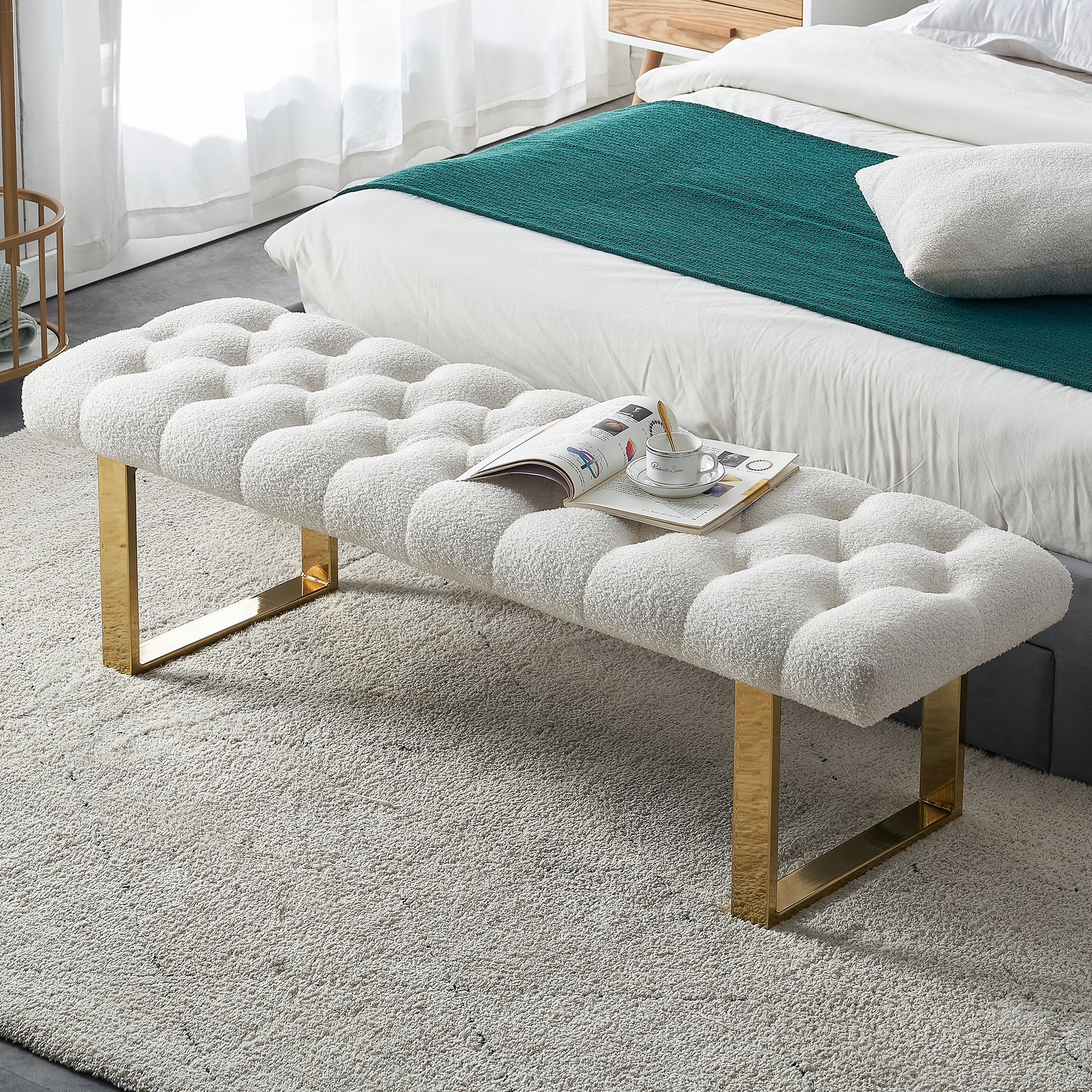 New Boucle Fabric Loveseat Ottoman Footstool Bedroom Bench Shoe Bench With Gold Metal Legs,Ivory White