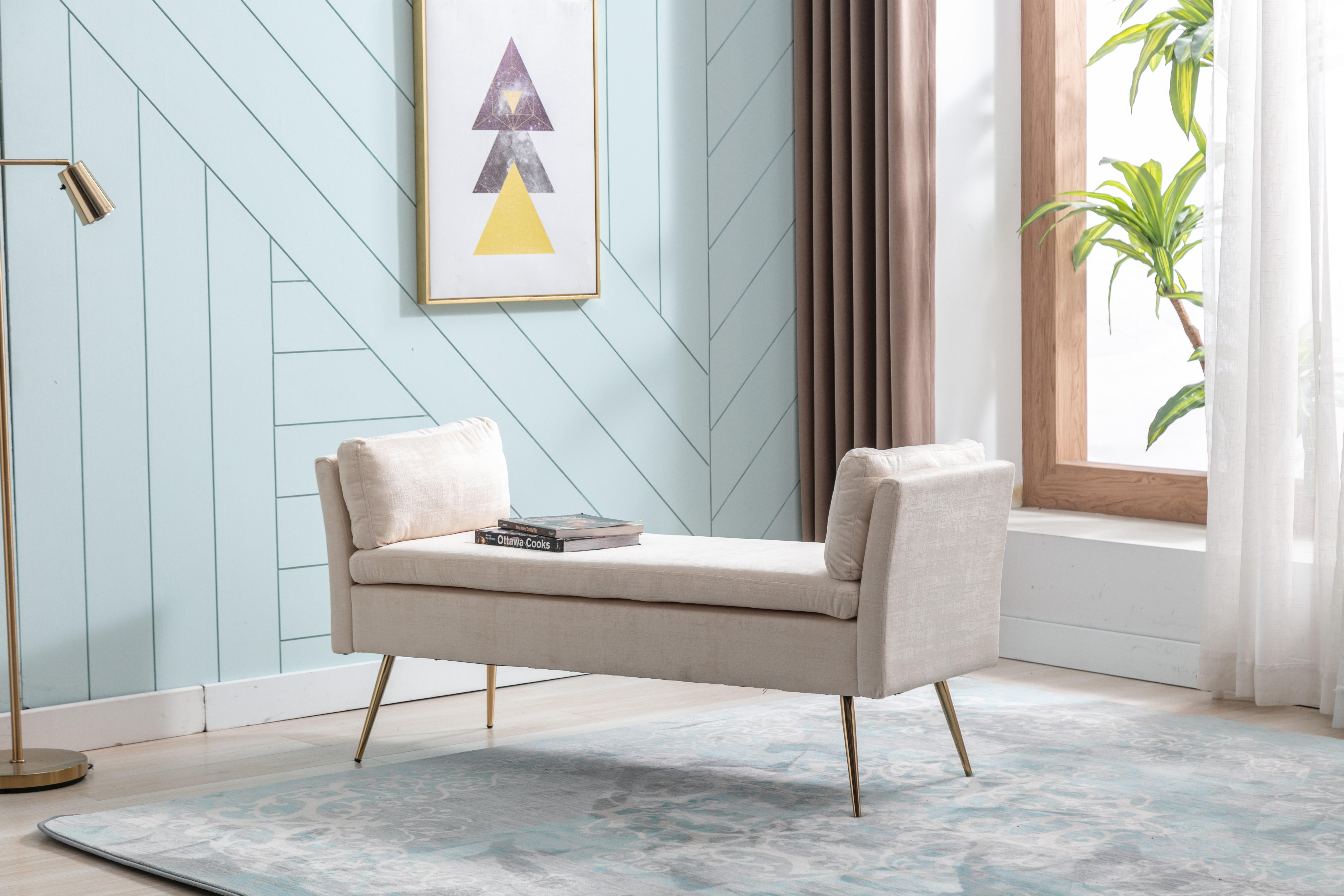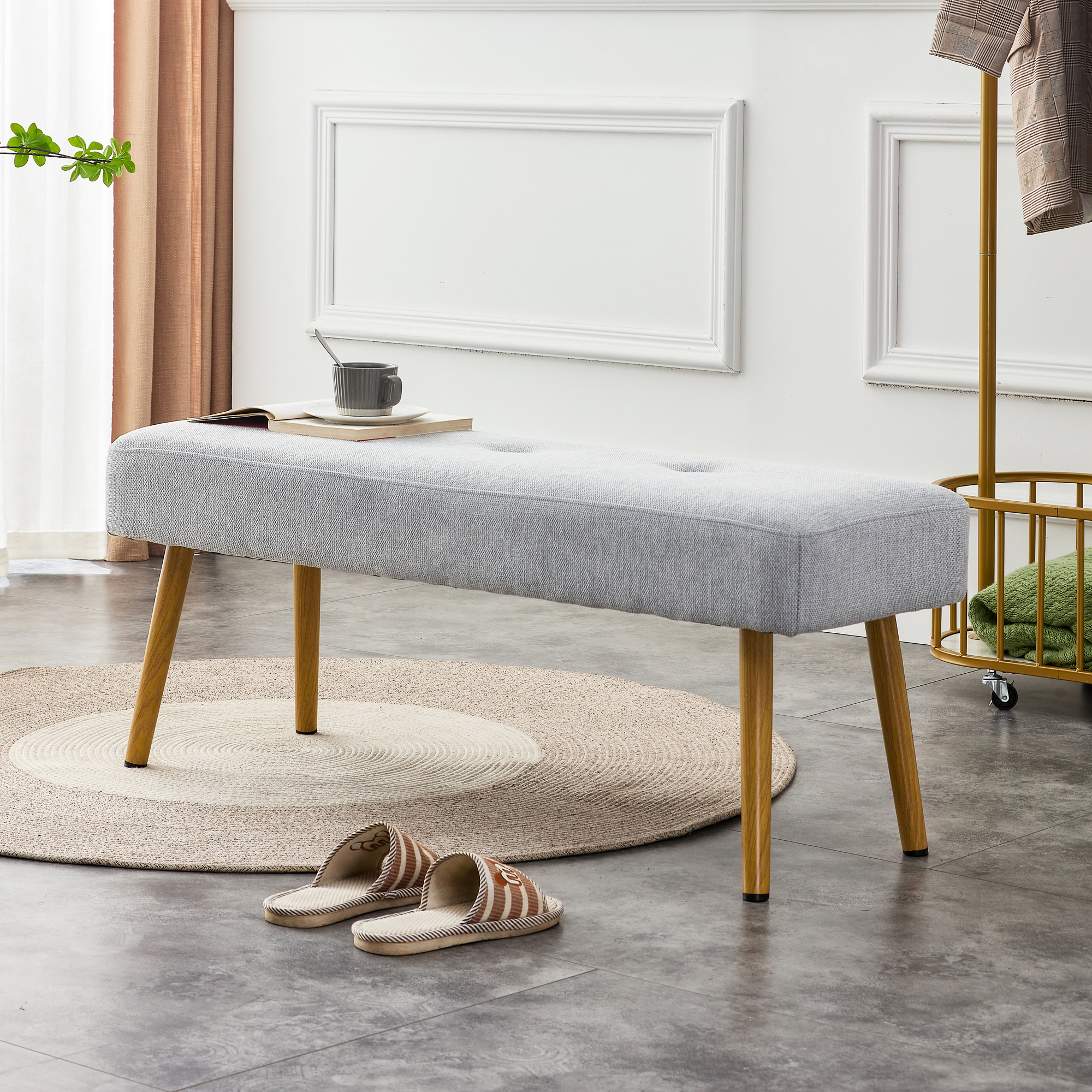 Linen Fabric Upholstered Bench With Gold Metal Legs .Shoe Changing Bench Sofa Bench Dining Chair .for to Bedroom Fitting Room, Store, Dining Room and Living Room.