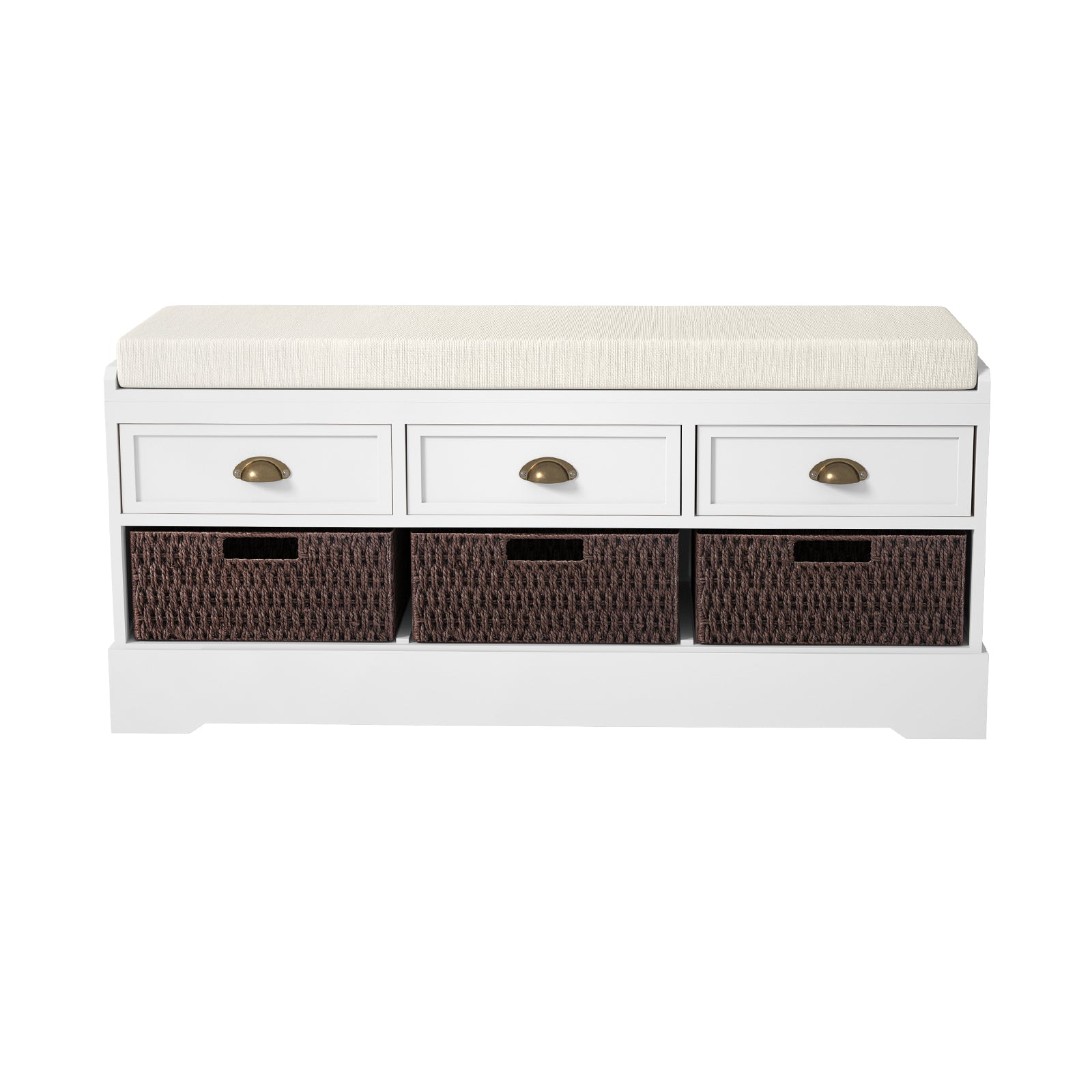 Storage Bench with 3 Drawers, 3 Rattan Baskets and Removable Cushion for Entryway, Hallway, Living Room,Bedroom
