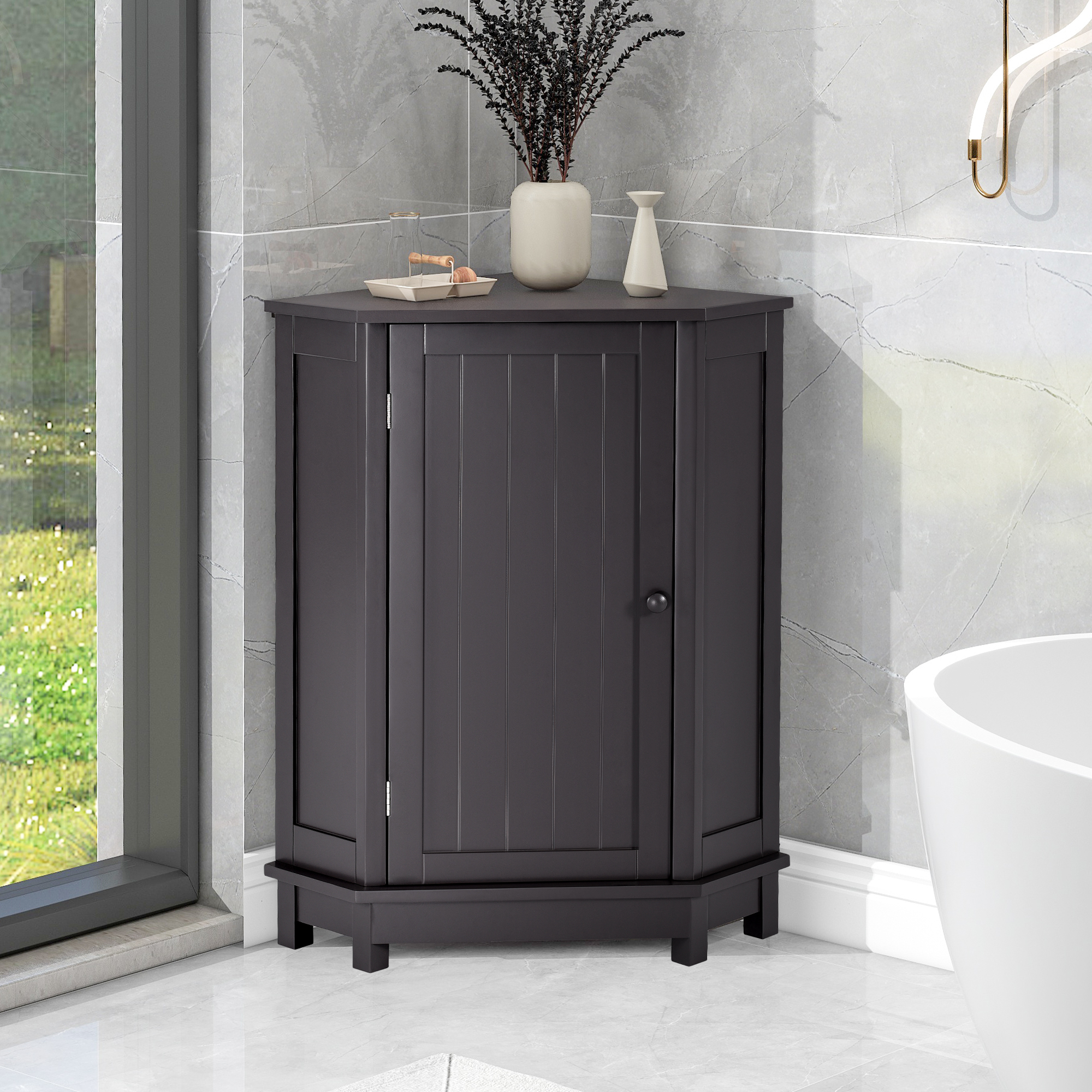 Bathroom Cabinet Triangle Corner Storage Cabinet with Shelf Modern Style MDF Board, Black Brown