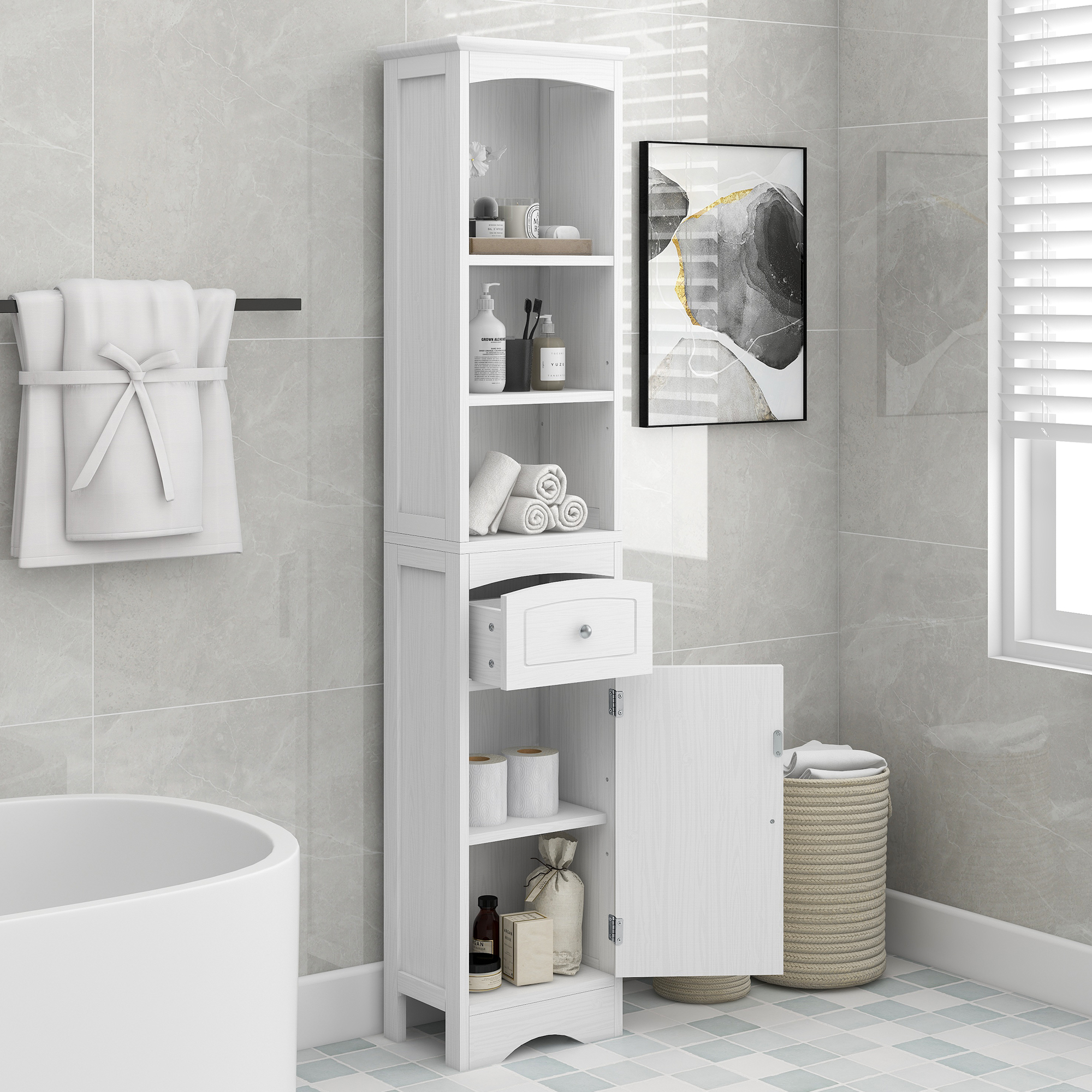 Tall Bathroom Cabinet, Freestanding Storage Cabinet with Drawer, MDF Board, Adjustable Shelf, White