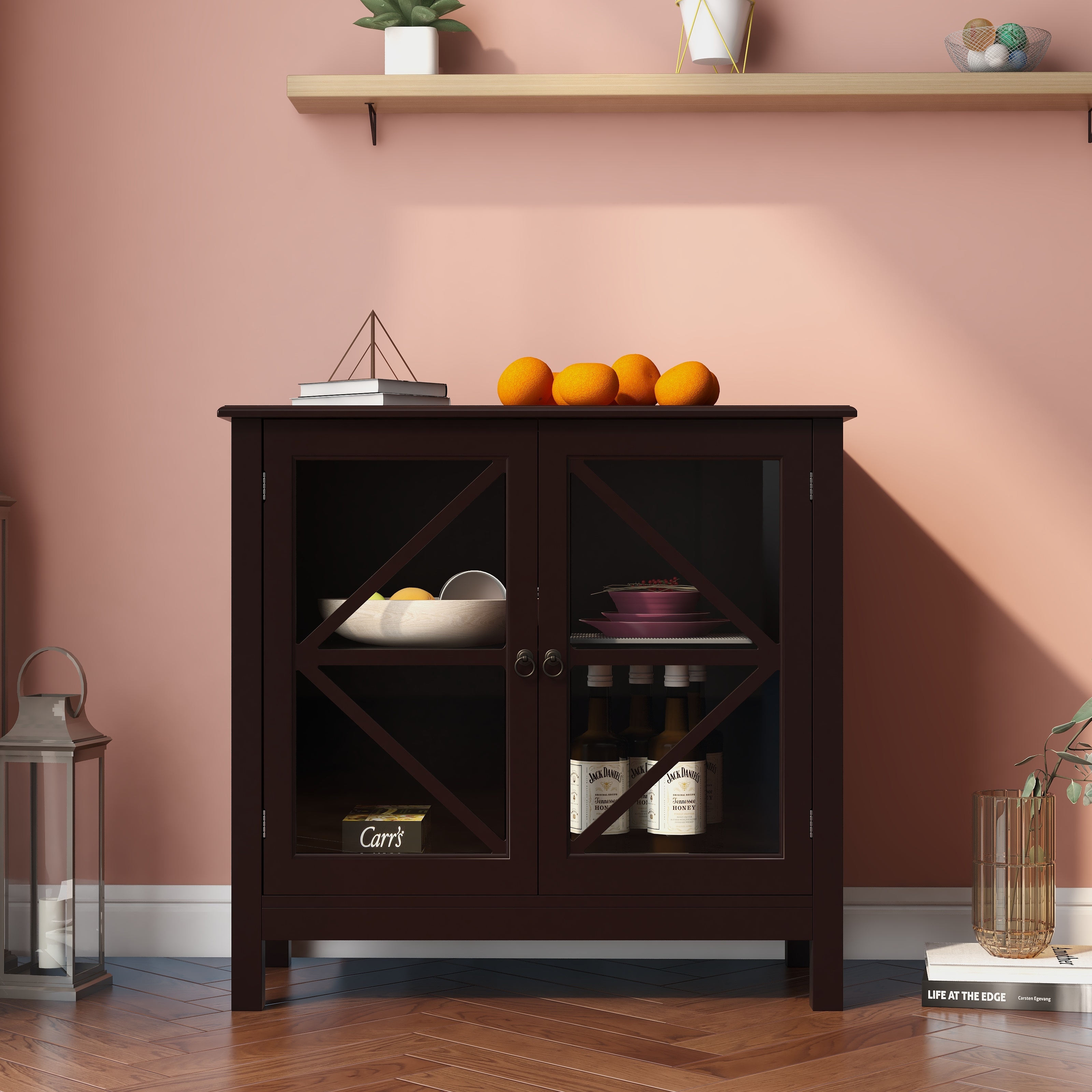 Buffet storage cabinet with single glass doors and unique bell handle