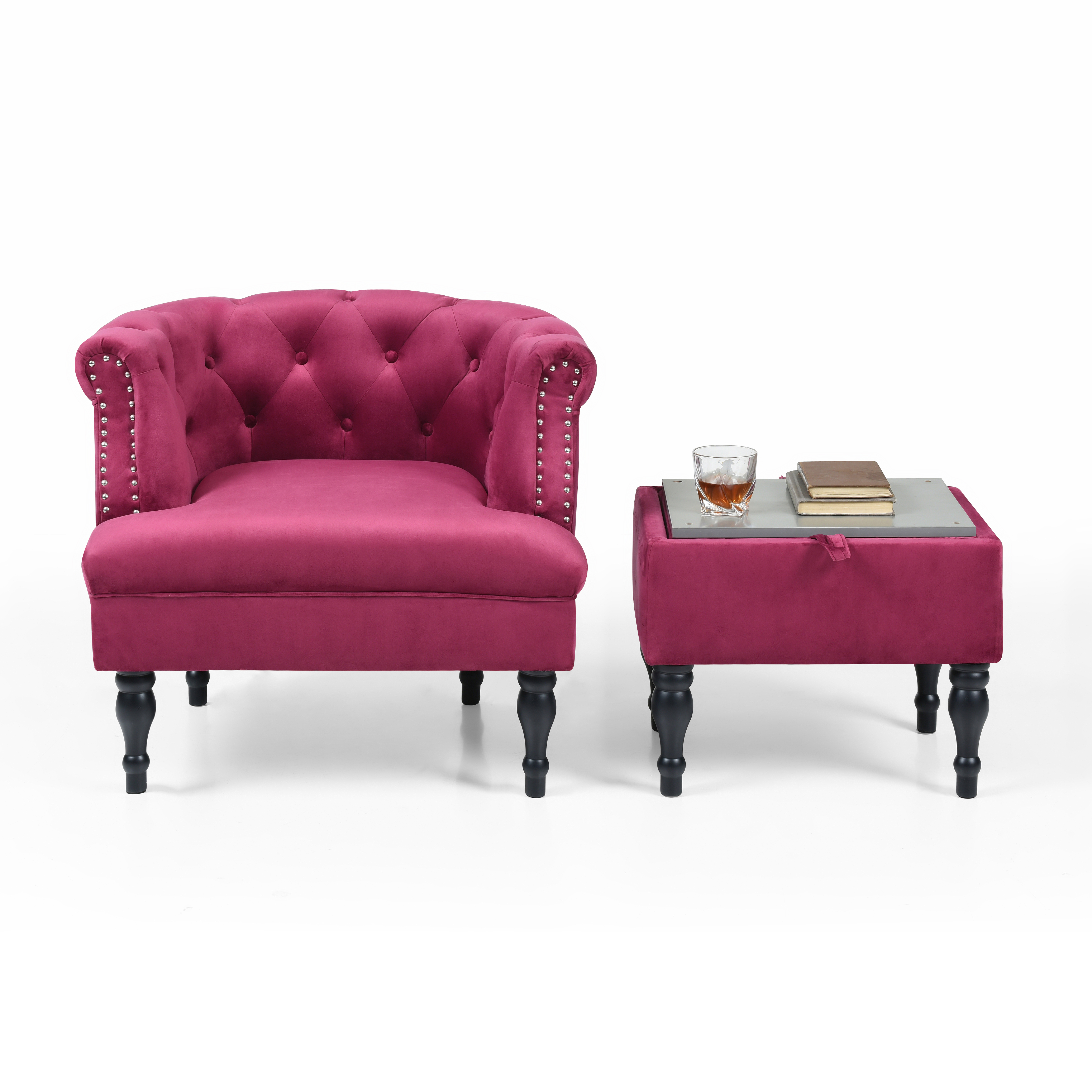 Upholstered Velvet Accent Chair with Ottoman Set for Living Room Modern Button Tufted Arm Chair and Storage Ottoman with Tray Contemporary Single Sofa Reading Chair Footrest Stool,Burgundy