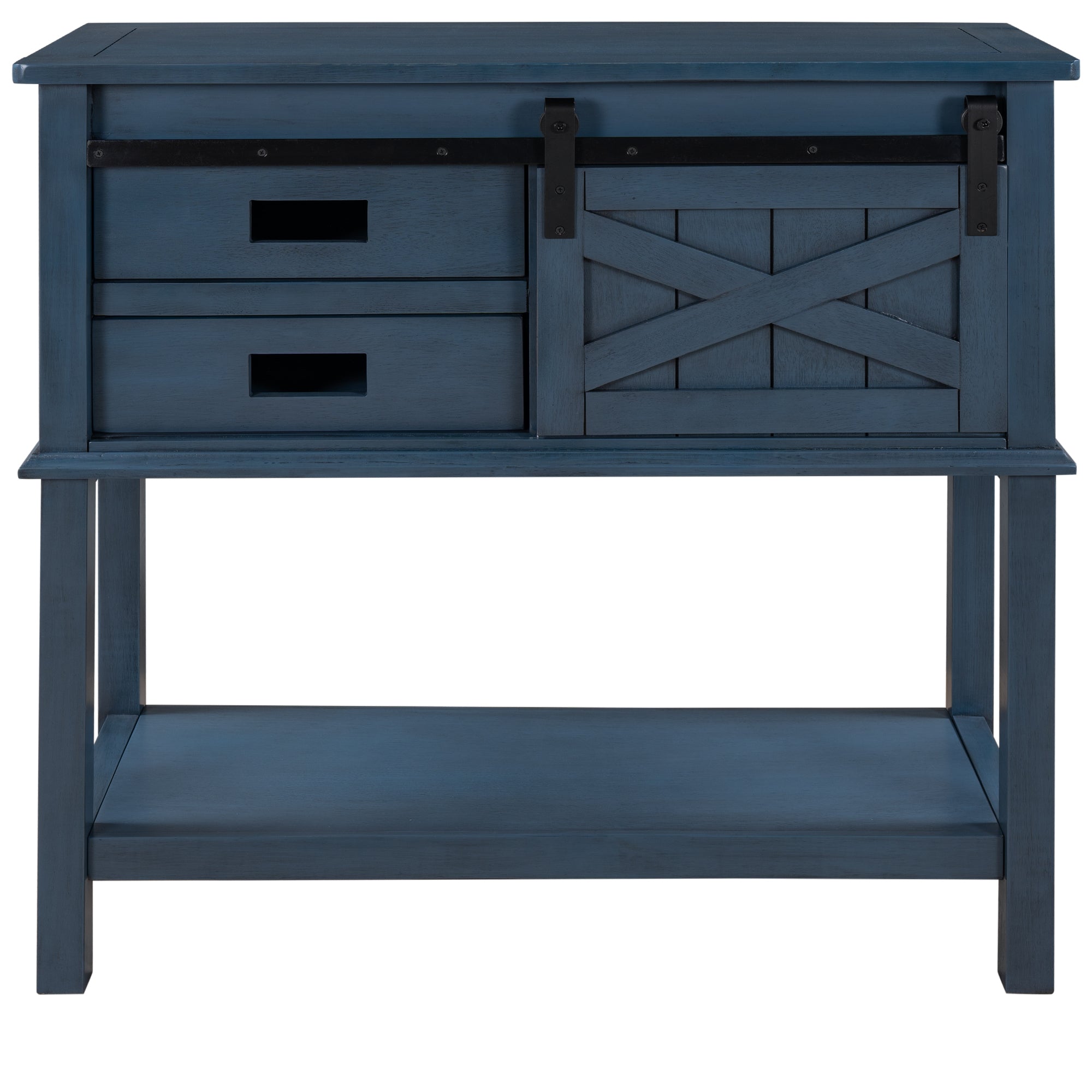 Classic Farmhouse Style Pine Wood Console Table with Sliding Barn Door and Two Drawers One Cabinet Open Style Shelf