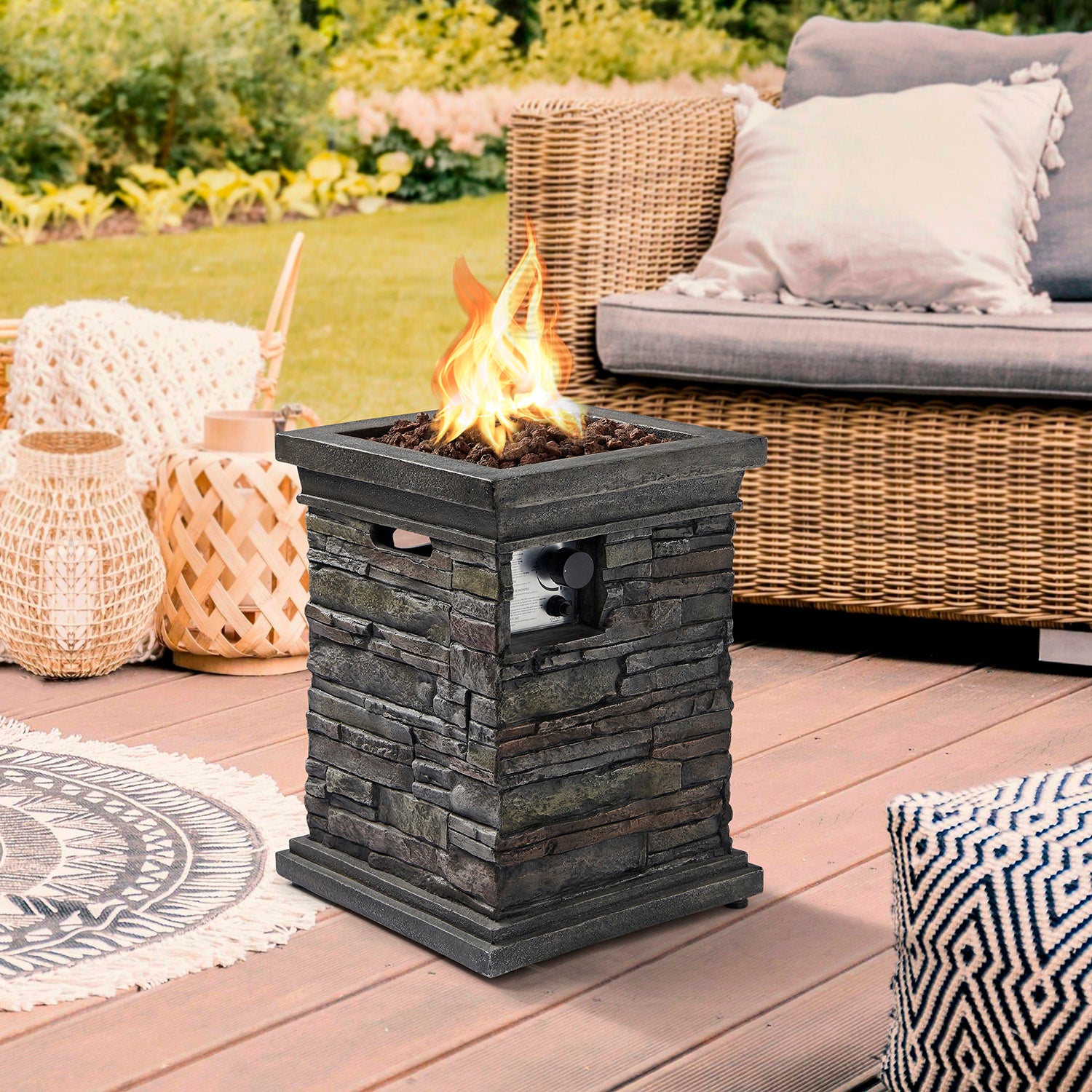 Square Column Propane Gas Fire Pit Outdoor Garden Slate Rock, 25 Inches, Gray