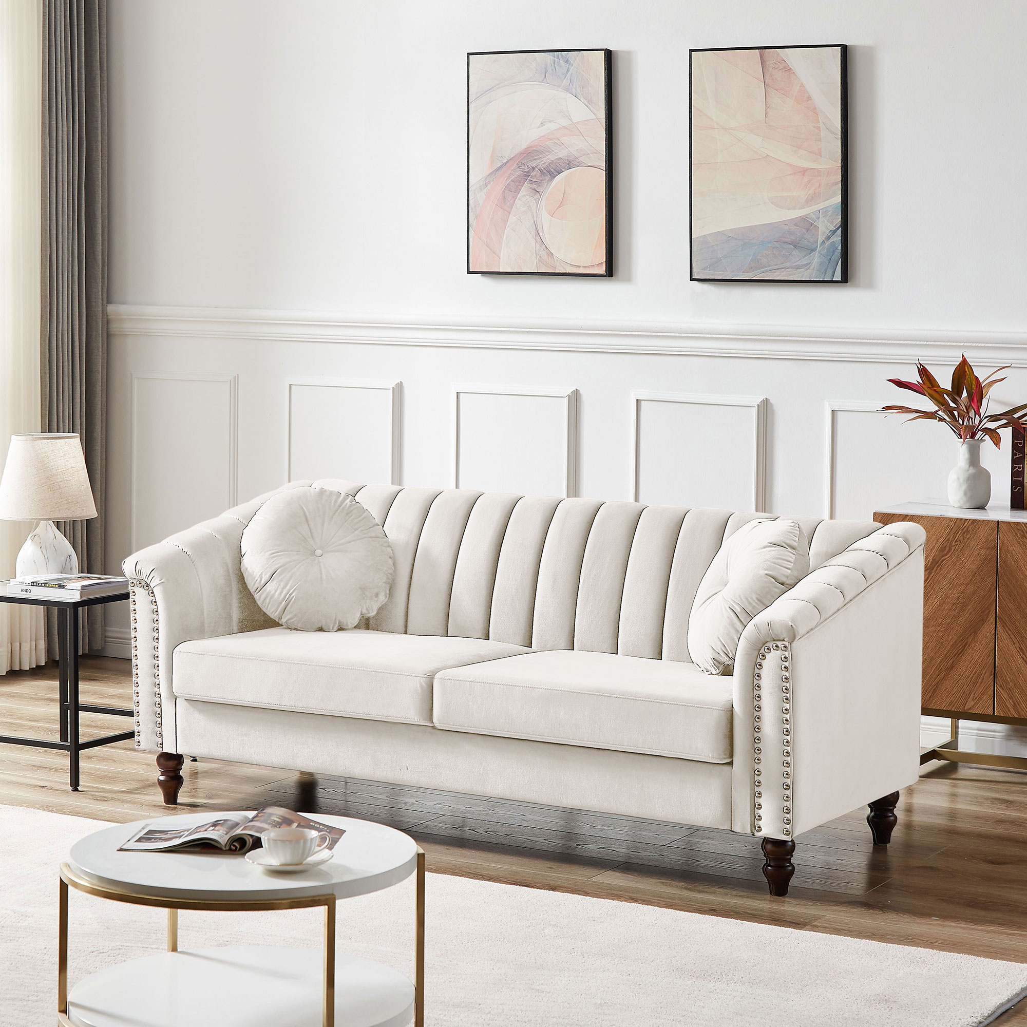 MH Modern Velvet Upholstered Sofa Couch, 3 Seat Tufted Back with Nail Arms with 2 pillows, Solid wood Legs, Sleeper Sofa for Living Room, Compact Living Space, Apartment, Bonus Room