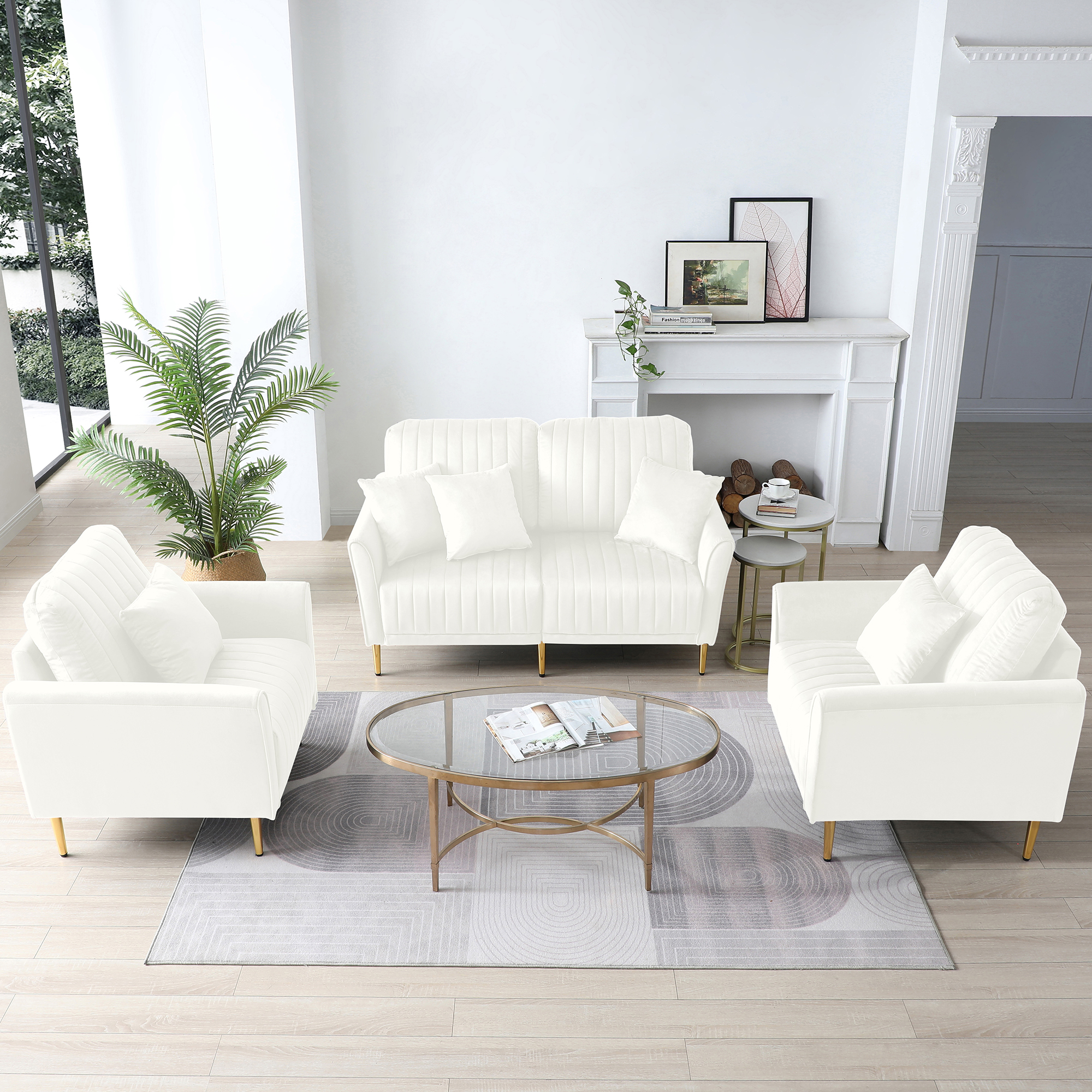 Living Room Sofa Set of 3, Loveseat Sofa Couch and Comfy Accent Arm Chair w/Pillows, Metal Legs, Upholstered Modern Furniture for Bedroom, Office, Small Space, Apartment Cream White