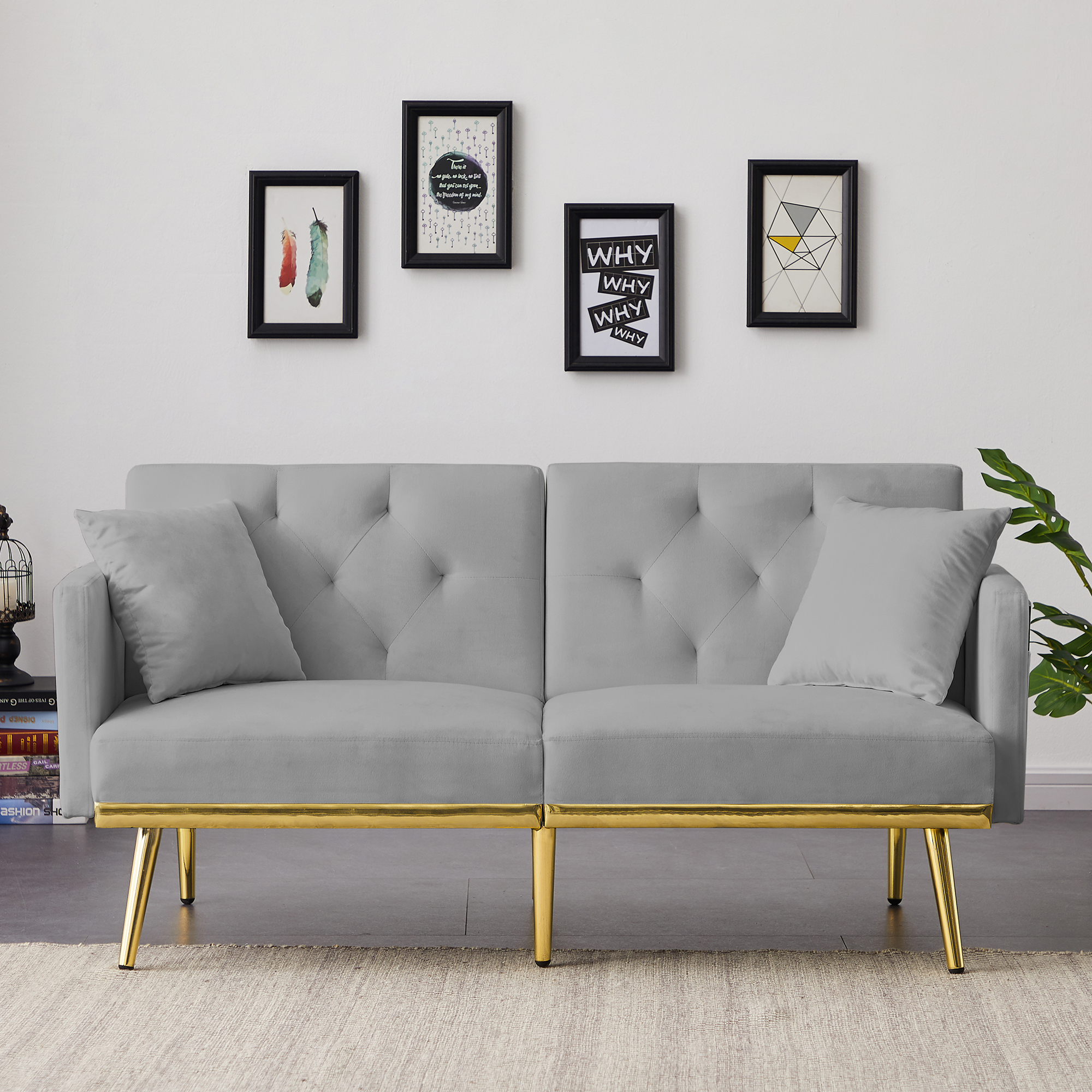 59” Modern Upholstered Velvet Loveseat Sofa 2 Seater Couch with Removable Cushions Side Pocket Mid-Century Tufted Living Room Set Gold Metal Legs,2 Pillows Included,Grey