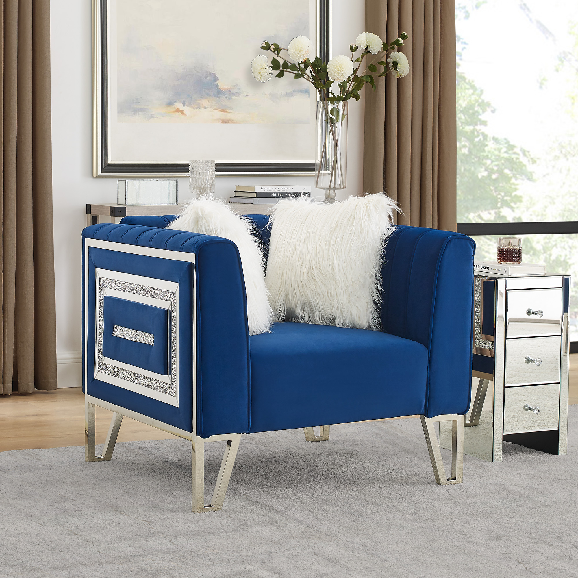 Sofa Chair with Mirrored Side Trim with Faux Diamonds and Stainless Steel Legs, Six White Villose Pillow, Blue
