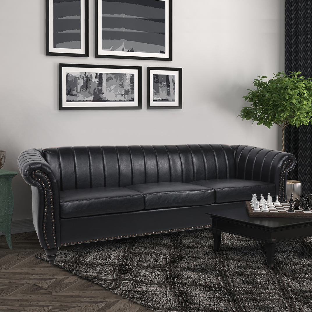 83.46'' Black PU Rolled Arm Chesterfield Three Seater Sofa.
