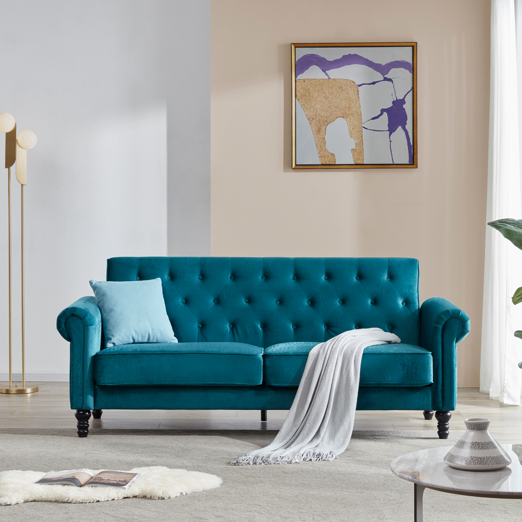 Orifur. Classic Sofa Couch, Mid-Century Upholstered Velvet Fabric Tufted Sofa with Scroll Arms for Living Room, Bedroom, Apartment.