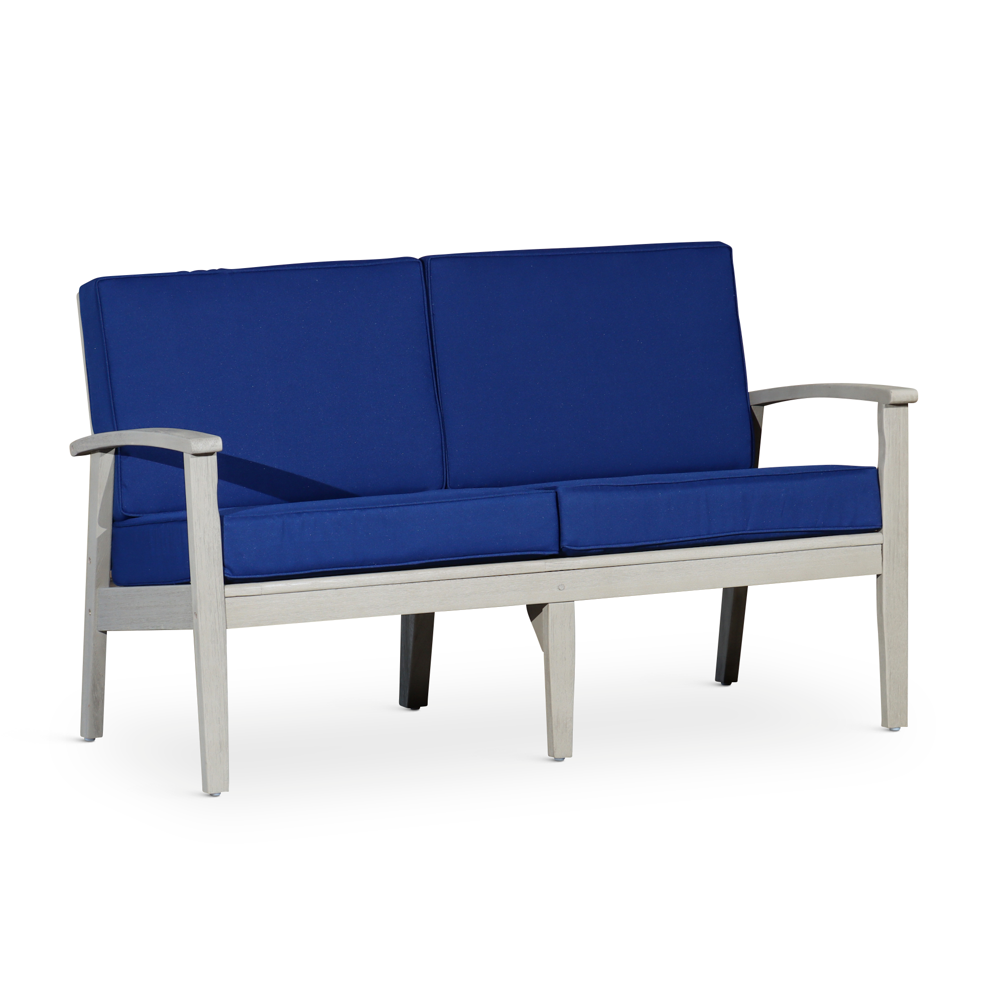 Eucalyptus Loveseat with Cushions, Driftwood Gray Finish, Navy Cushions