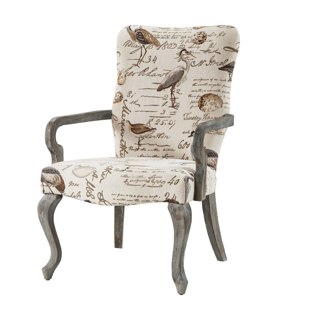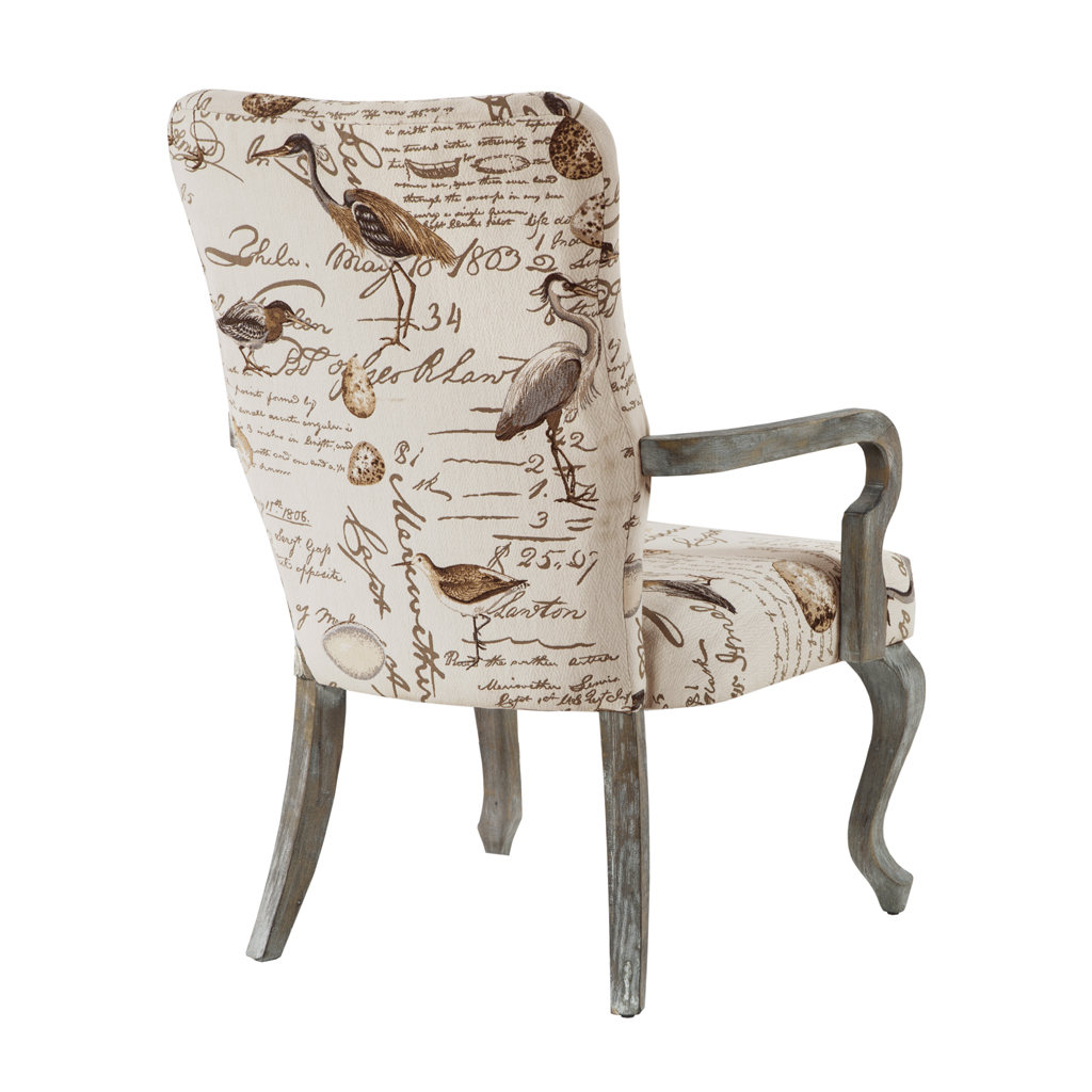 Long Descriptions | A Queen Anne inspired, high back occasional chair describes this elegant accent chair. Combining its shaped goose neck arms finished in a reclaimed gray mixed with trendy bird motif, makes this chair a definite show stopper. |