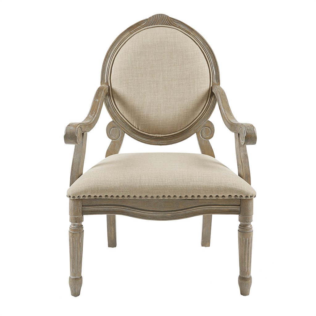 Long Descriptions | Discover sophistication in a modernized update to this traditional, yet classic design of this Brentwood chair. The wonderful mix of a linen look combined with a reclaimed natural finish and pops of nail head give this chair definite modernized appeal. Assembly required. |