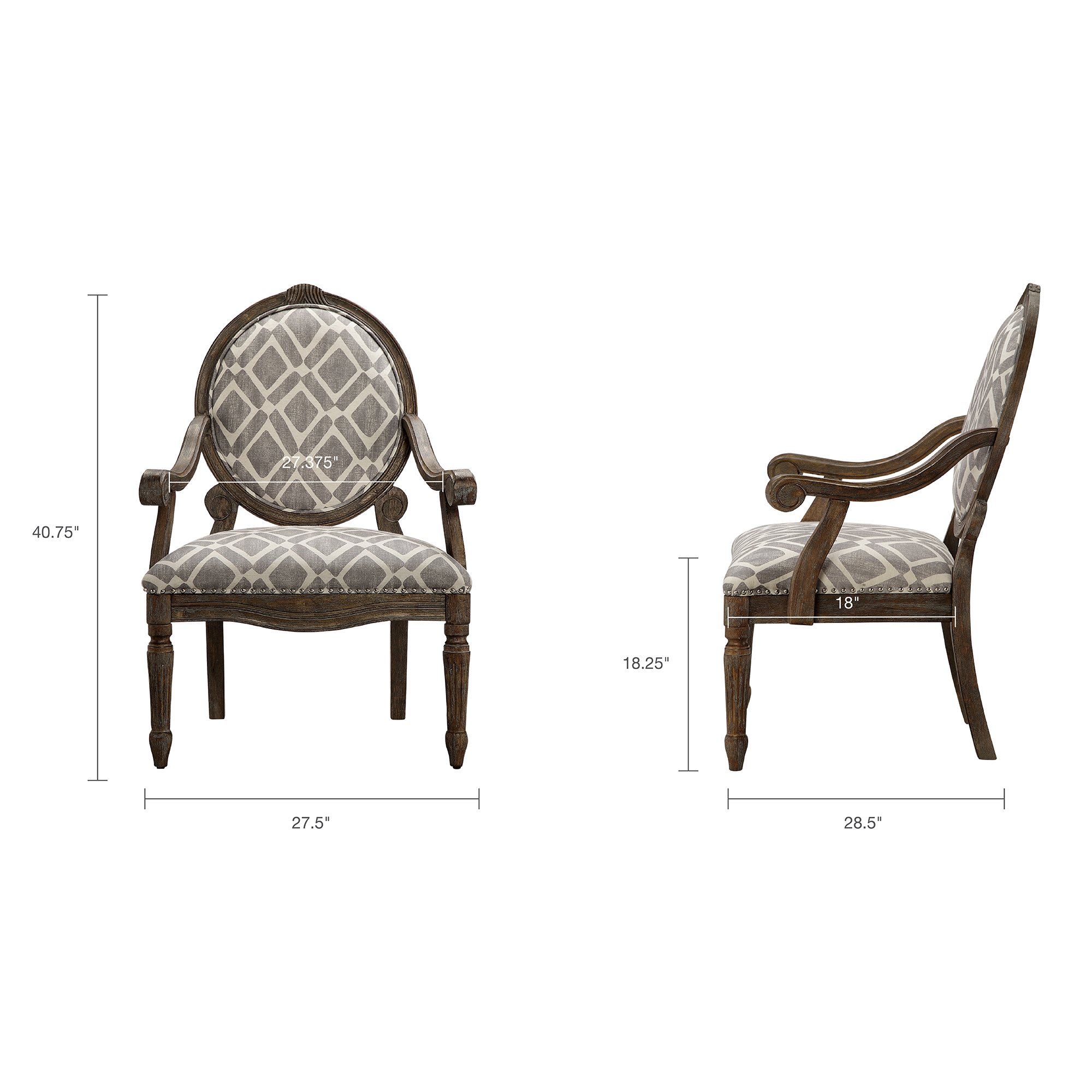 Long Descriptions | Discover sophistication in a modernized update to this traditional, yet classic design of this Brentwood chair. The wonderful mix of a geometric print combined with a reclaimed Grey finish and pops of nail head give this chair definite modernized appeal. Assembly required. |