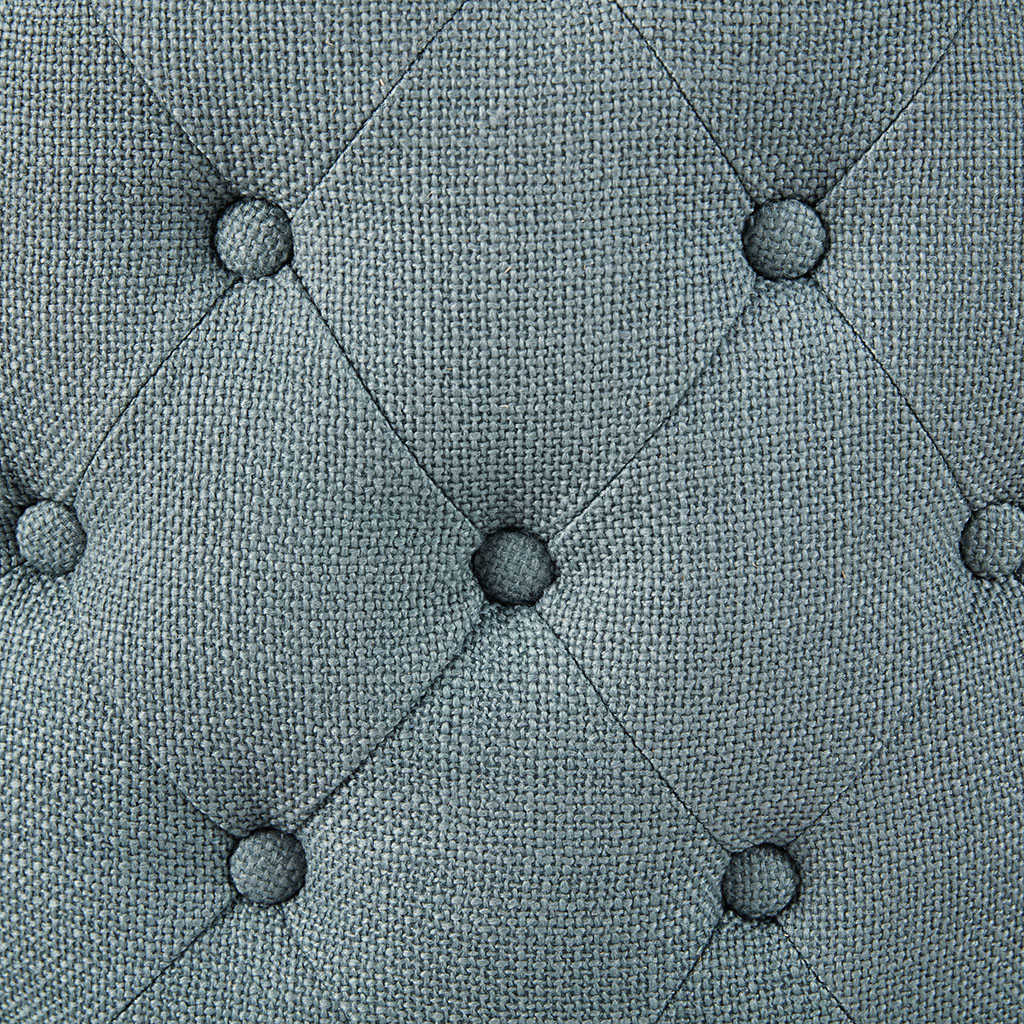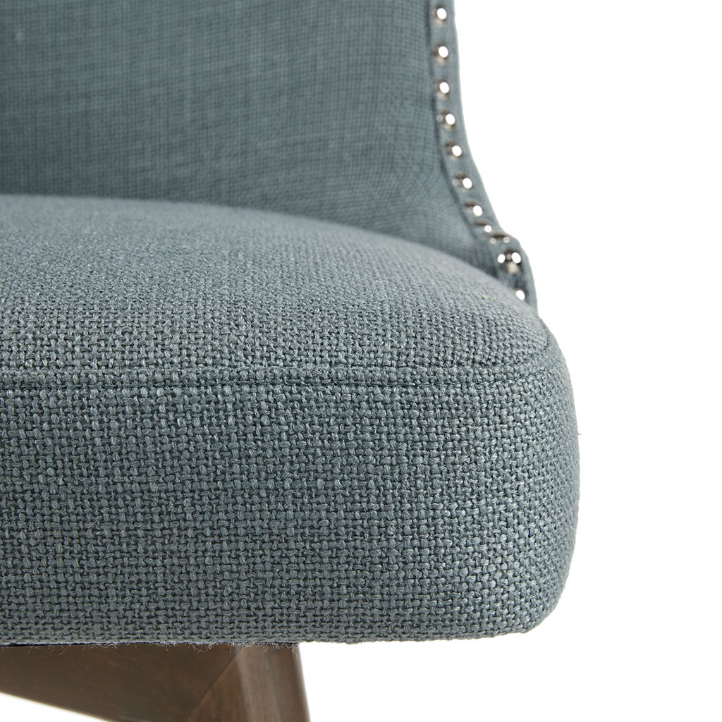 Long Descriptions | Add a fresh splash of color and style to your dining area with the Madison Park Kobe Counter Stool with Swivel Seat. The tight tufted back and seat are upholstered in a blue polyester and acrylic fabric that coordinates beautifully with the walnut wood finish on the straight legs. An attached seat cushion provides exceptional comfort and features a swivel function that rotates 360 degrees. The polished silver nail head trim and polished silver finish on the footrest adds an elegant accent to the design, completing the look. Incorporate this counter stool into your dining room or kitchen decor to brighten your home. Assembly is required. Max weight capacity: 300 lbs. |