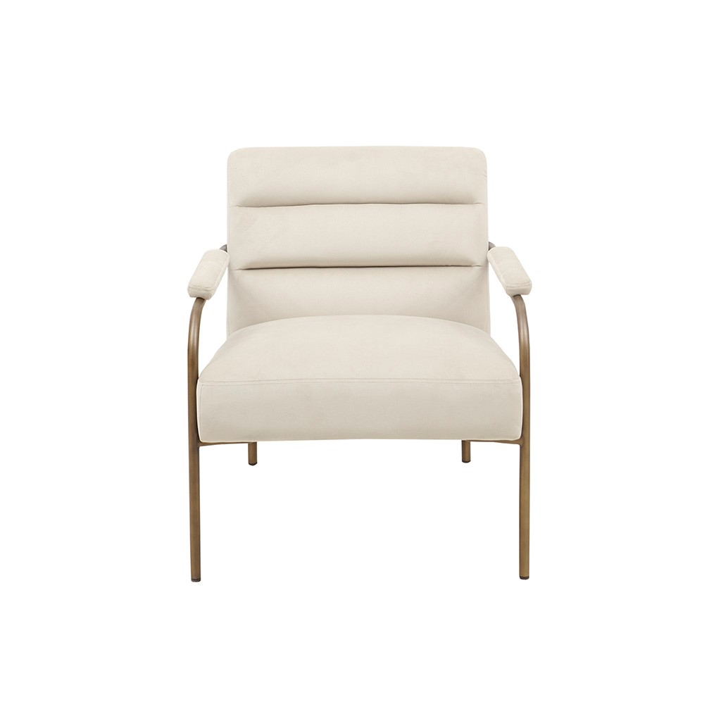 Long Descriptions | Add a contemporary flair to your living room décor with the Madison Park Lampert Accent Chair. This accent chair features a low, channeled back that adds dimension and metal track arms with padded armrests, for an eye-catching modern look. The beige upholstery is complemented by the bronze finish on the metal arms and legs to emphasize the modern aesthetic. Assembly is required. |