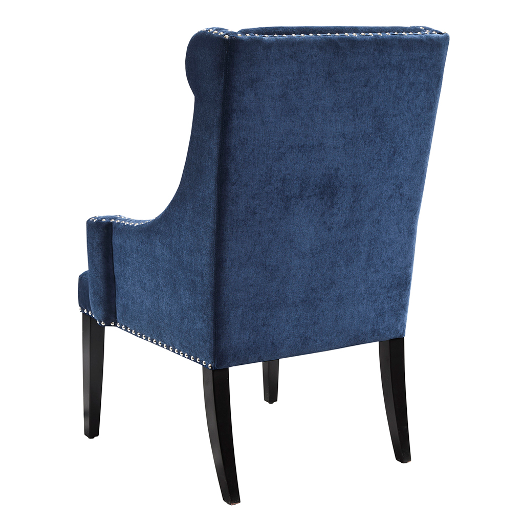 Long Descriptions | Add this stylish piece to your decorating mix as an updated accent wing chair with curved arms and double row nail head trim. Leg assembly required. |