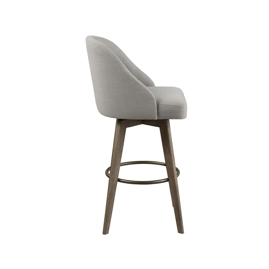 Long Descriptions | Beautifully crafted, the Madison Park Pearce Barstool with Swivel Seat introduces a perfect blend of simplicity and sophistication. This barrel style counter stool features a swivel function, allowing you to easily rotate the upholstered seat. A smooth reclaimed grey finish on the rubber wood legs creates a clean transitional look, while a matte metal ring provides the perfect footrest. The smooth and graceful curves of this counter stool form an elegant silhouette that adds a handsome touch to your dining room. Assembly is required. Max weight capacity: 300 lbs. |