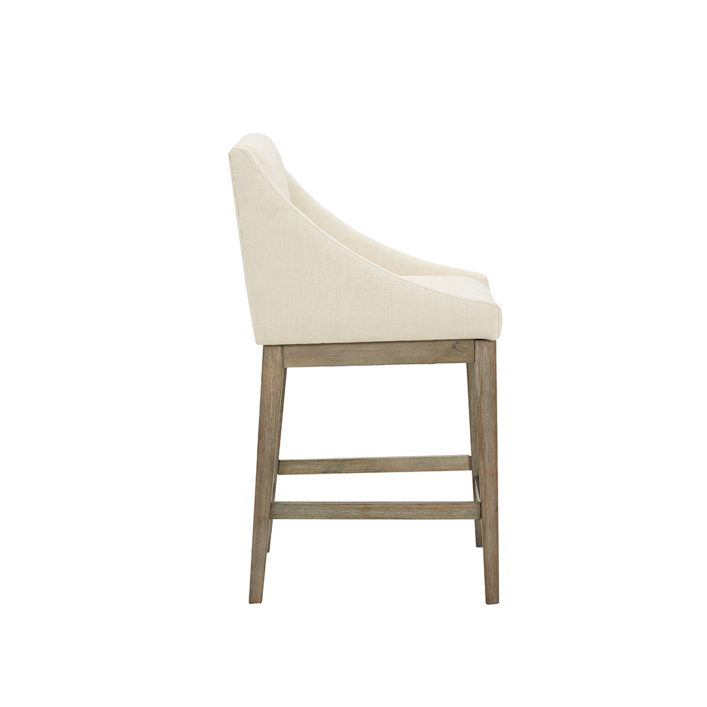 Long Descriptions | The Madison Park Simon Counter Stool provides a pure and simple update to your dining decor. Crafted with graceful sloped arms, this counter stool features straight legs made from durable rubber wood, for a clean and sturdy design. The cream upholstery and the smooth reclaimed grey finish on the legs create an elegant look that fits in any transitional decor. A bronze kick plate protects the footrest from every day wear and tear, while the square seat offers exceptional comfort. Set this counter stool in your dining room to add a refined and polished look to your home. Assembly is required. Max weight capacity: 300 lbs. |