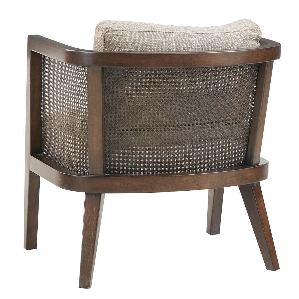 Long Descriptions | Make a statement in your living space with the unique style of the INK+IVY Sonia Accent Chair. Featuring authentic natural cane inset on the track arms and back, this accent chair provides a sophisticated touch. The back cushion and seat cushion are upholstered in a soft camel fabric, while a walnut wood finish on the frame and straight legs creates a rich contrast. Give your living room a charming update with the mid-century appeal of this accent chair. Assembly not required. |