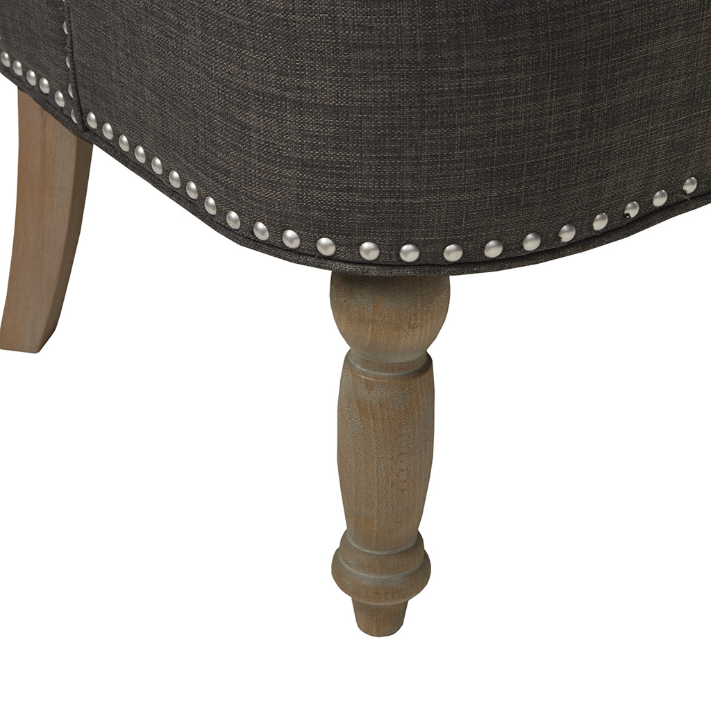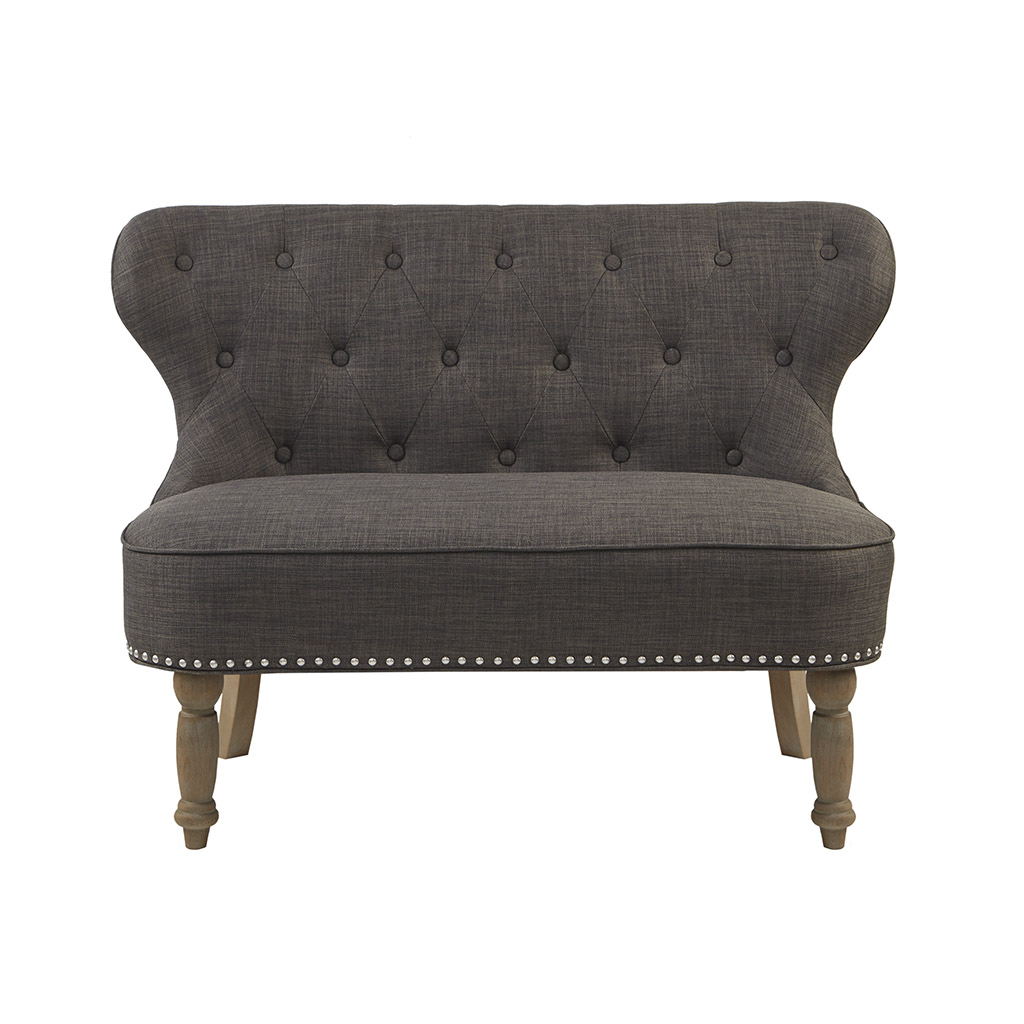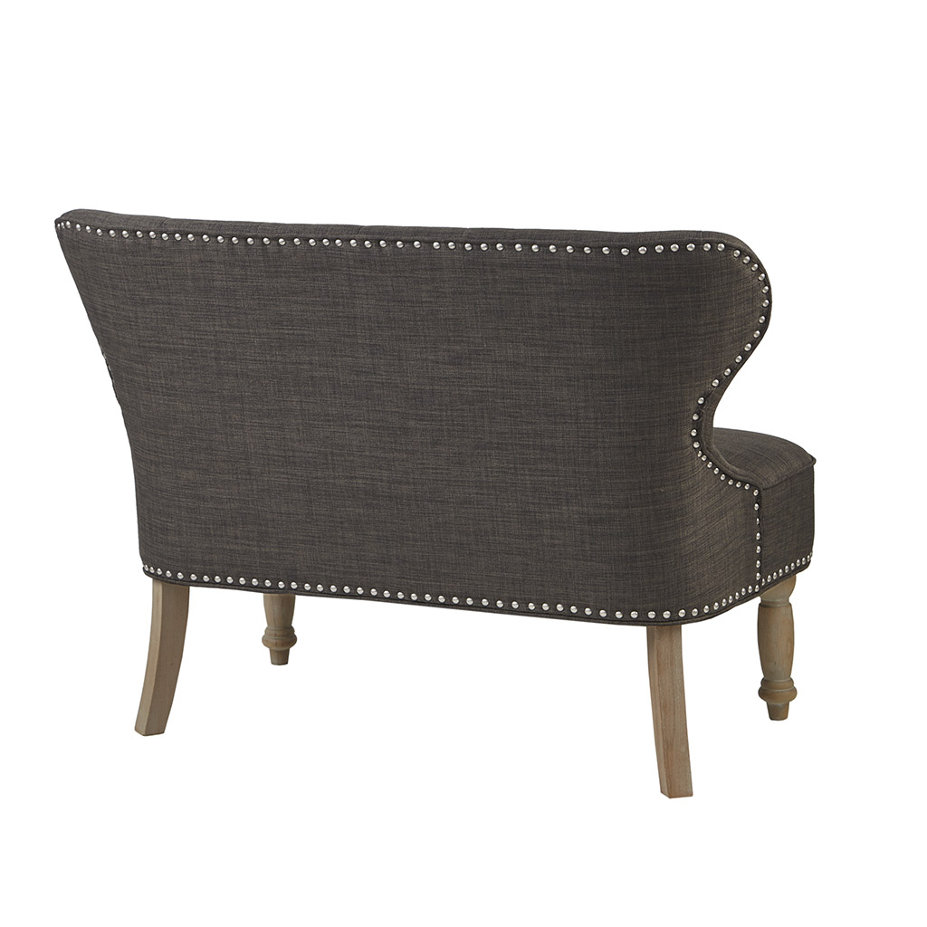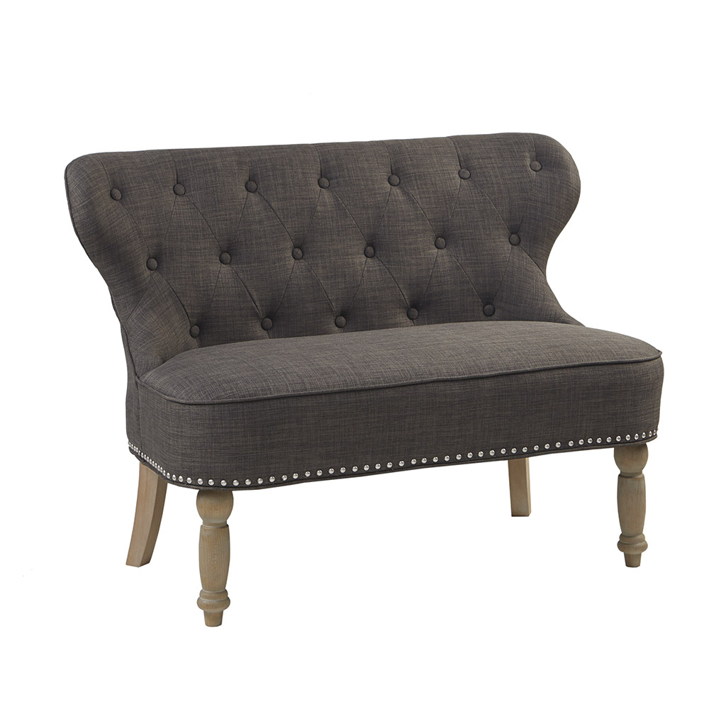 Long Descriptions | Elevate your living room decor with the sophisticated style of the Madison Park Stanford Settee. Featuring an elegant button-tufted back, this settee is upholstered in a charcoal fabric with a pewter nailhead trim for a chic transitional look. Solid wood legs provide a sturdy base and perfectly complement the upholstery. Add a unique and eye-catching style to your home by incorporating this settee into your living space. Leg assembly required. |