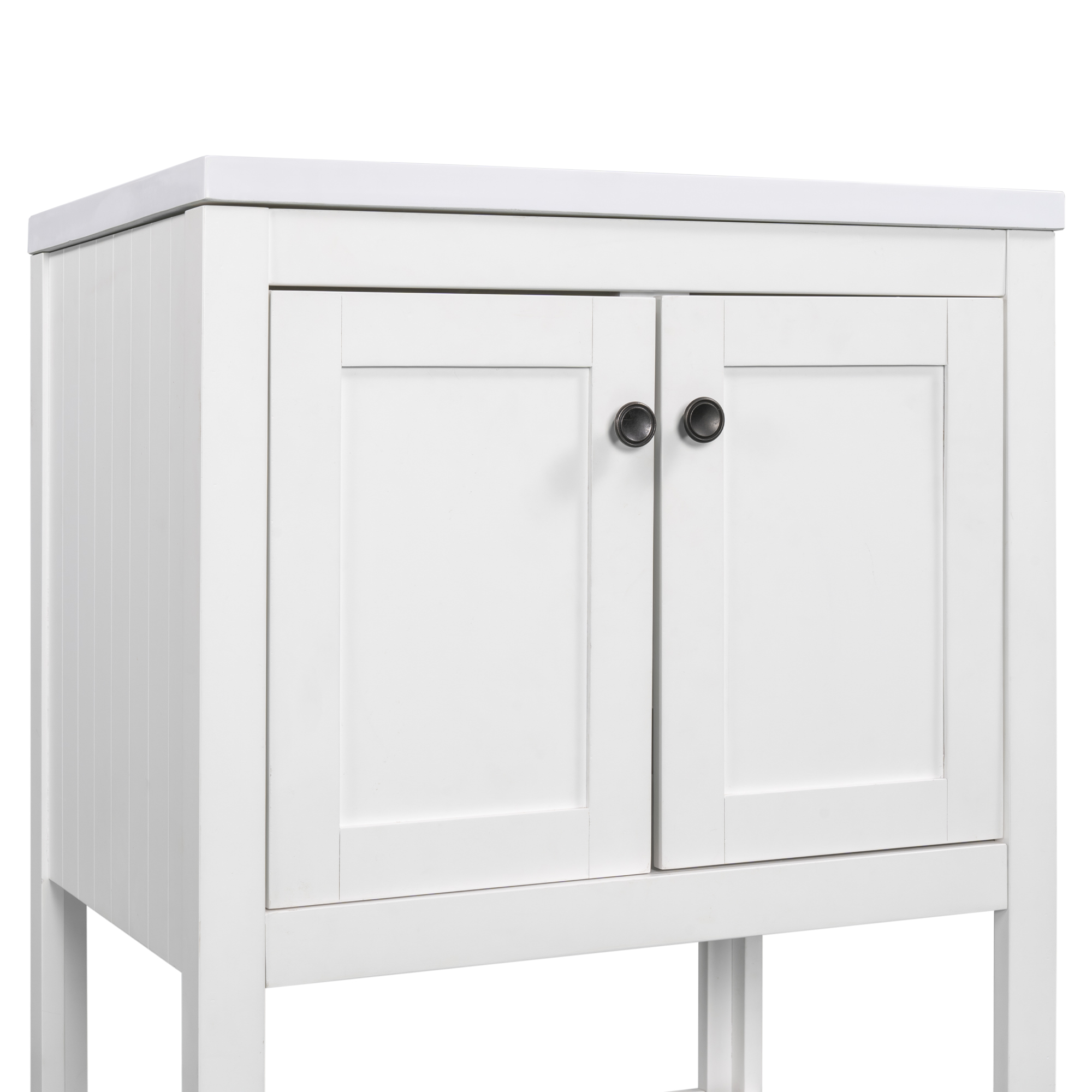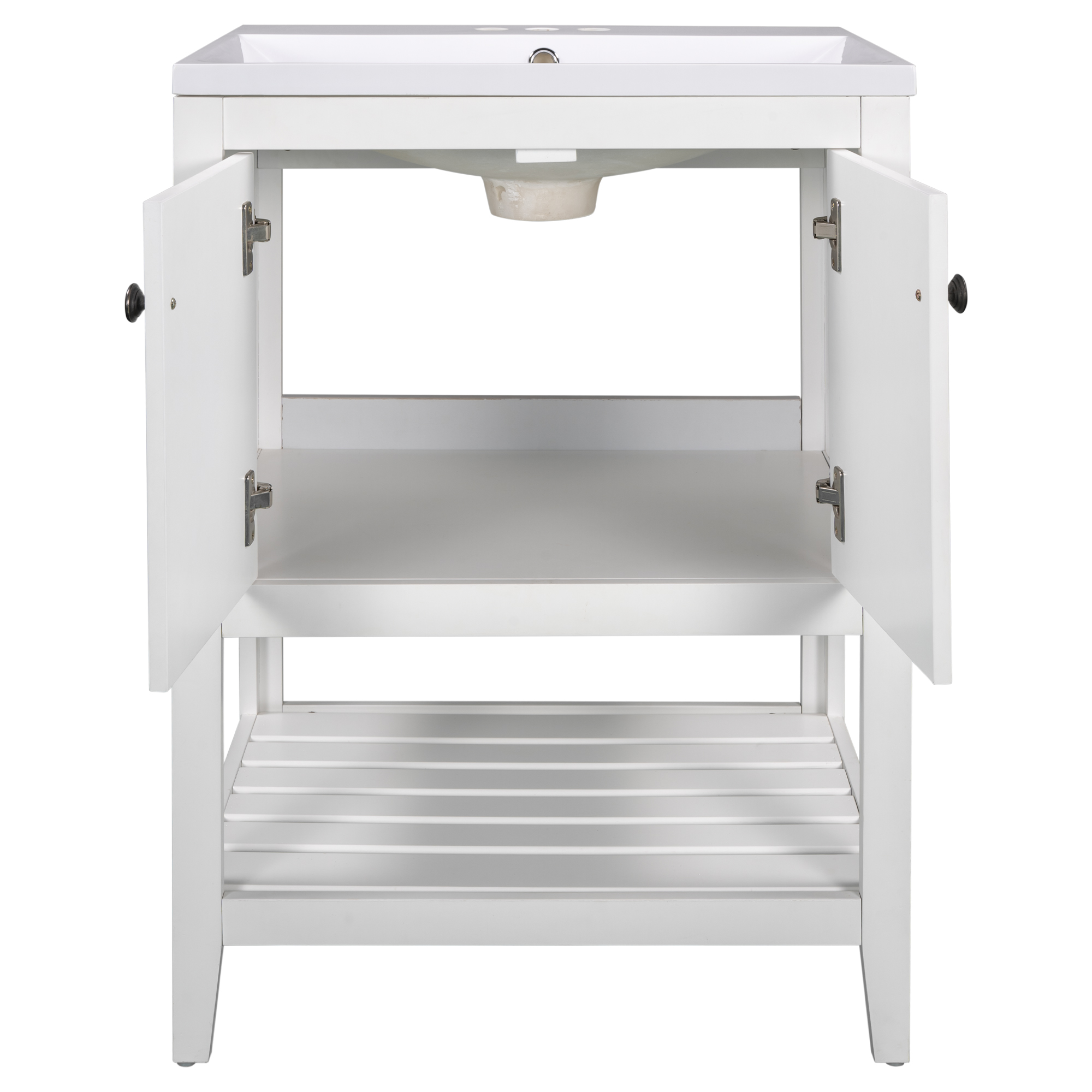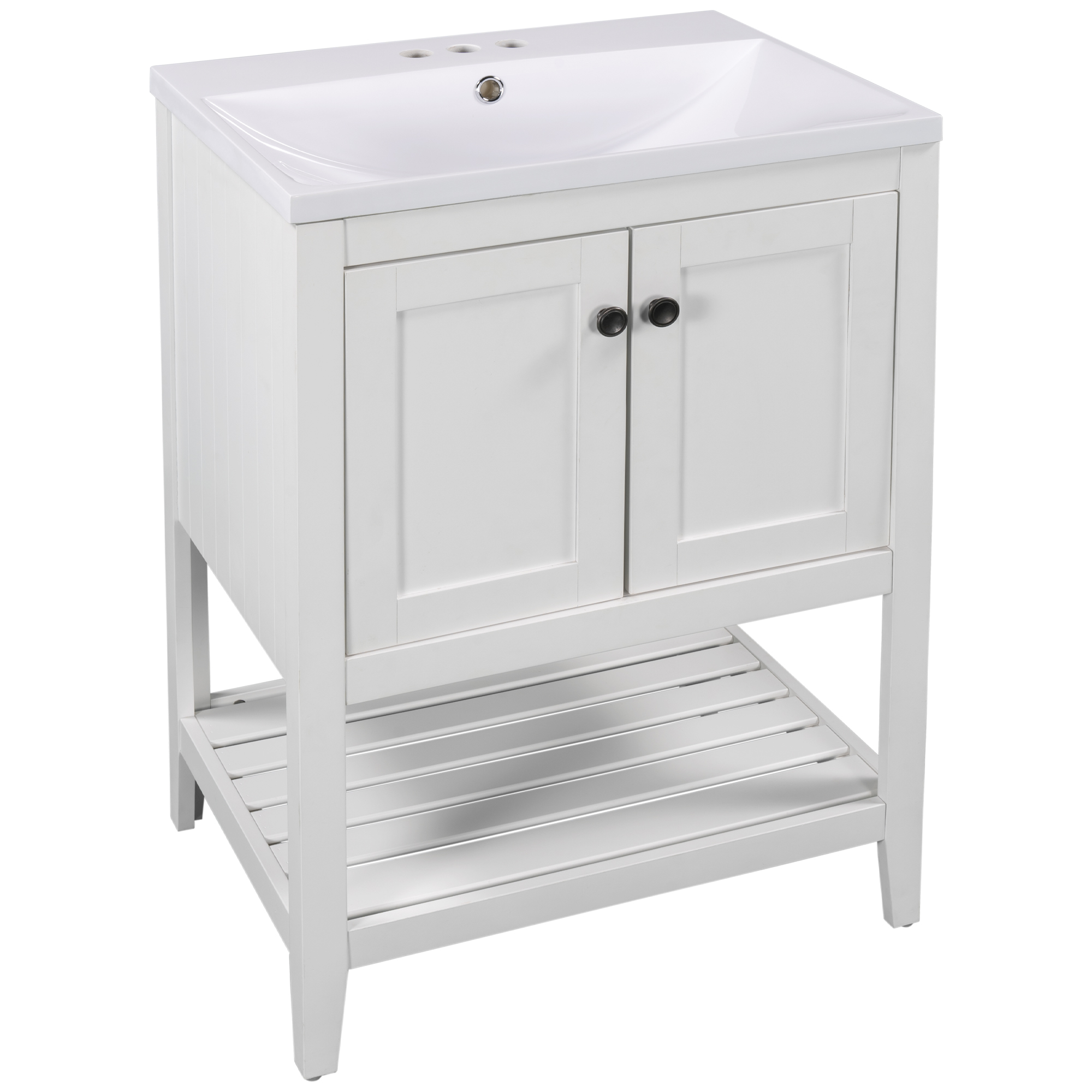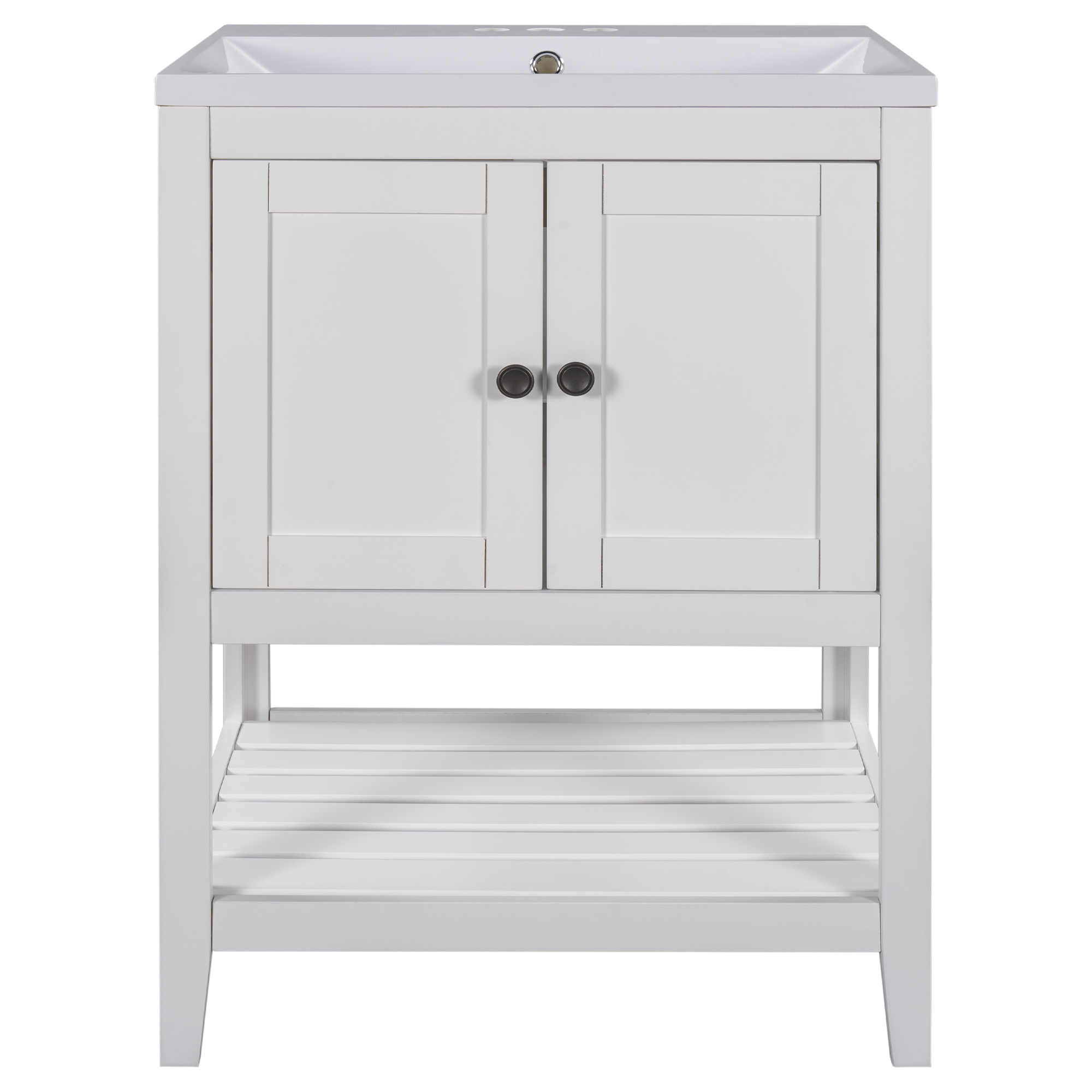This simple and practical design freestanding bathroom vanity features a cabinet and an open-style shelf for storing bathroom essentials. Both the cabinet and the open bottom shelf are spacious, and both offer enough space for most necessities used in the bathroom. With a hollow-out design MDF board, the open bottom shelf is a perfect place to accommodate bath towels or some daily chemicals such as shampoos.