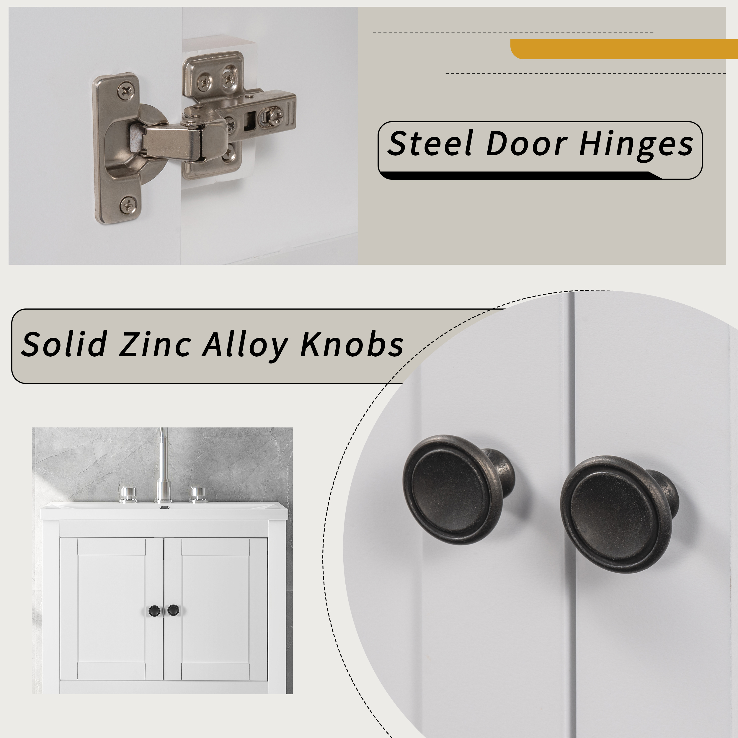 This bathroom vanity is made of a birch wood frame and MDF board, and the material of the door hinges is stainless steel. These materials are water-resistant and suitable for humid environments, which will allow the longevity of this bathroom vanity to last long. The round knobs are manufactured with zinc alloy, and the matte finish presents a high-end texture and makes a smooth feel.