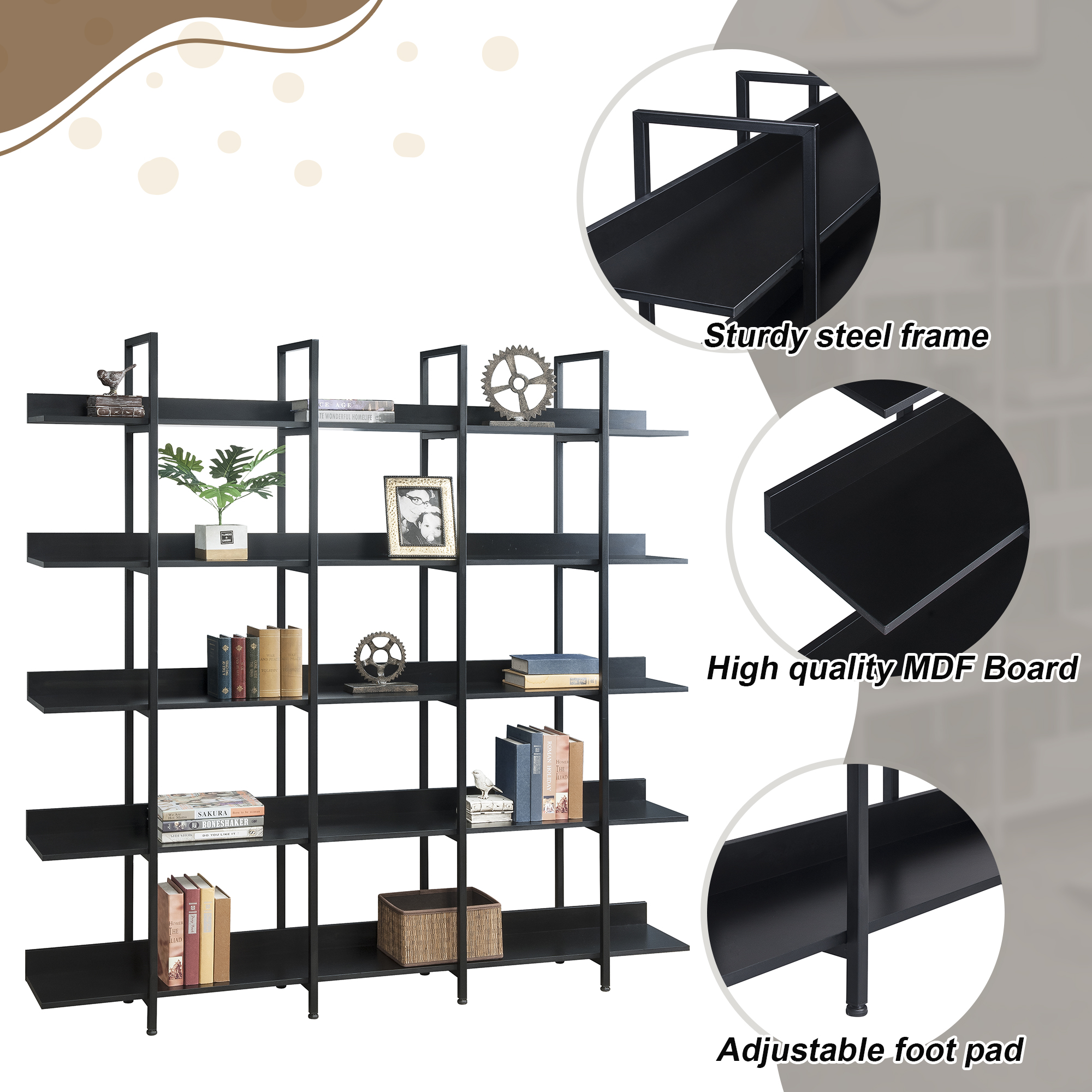 Constructed with an MDF board and a practical powder-coated steel frame, this bookshelf is sturdy and durable, each shelf can support up to 80 lbs, bearing 400 lbs in total, giving you a complete solution of storage and decoration. And the thick panel with a smooth and water-proof surface makes it convenient for daily clean-up, and hassle-free.