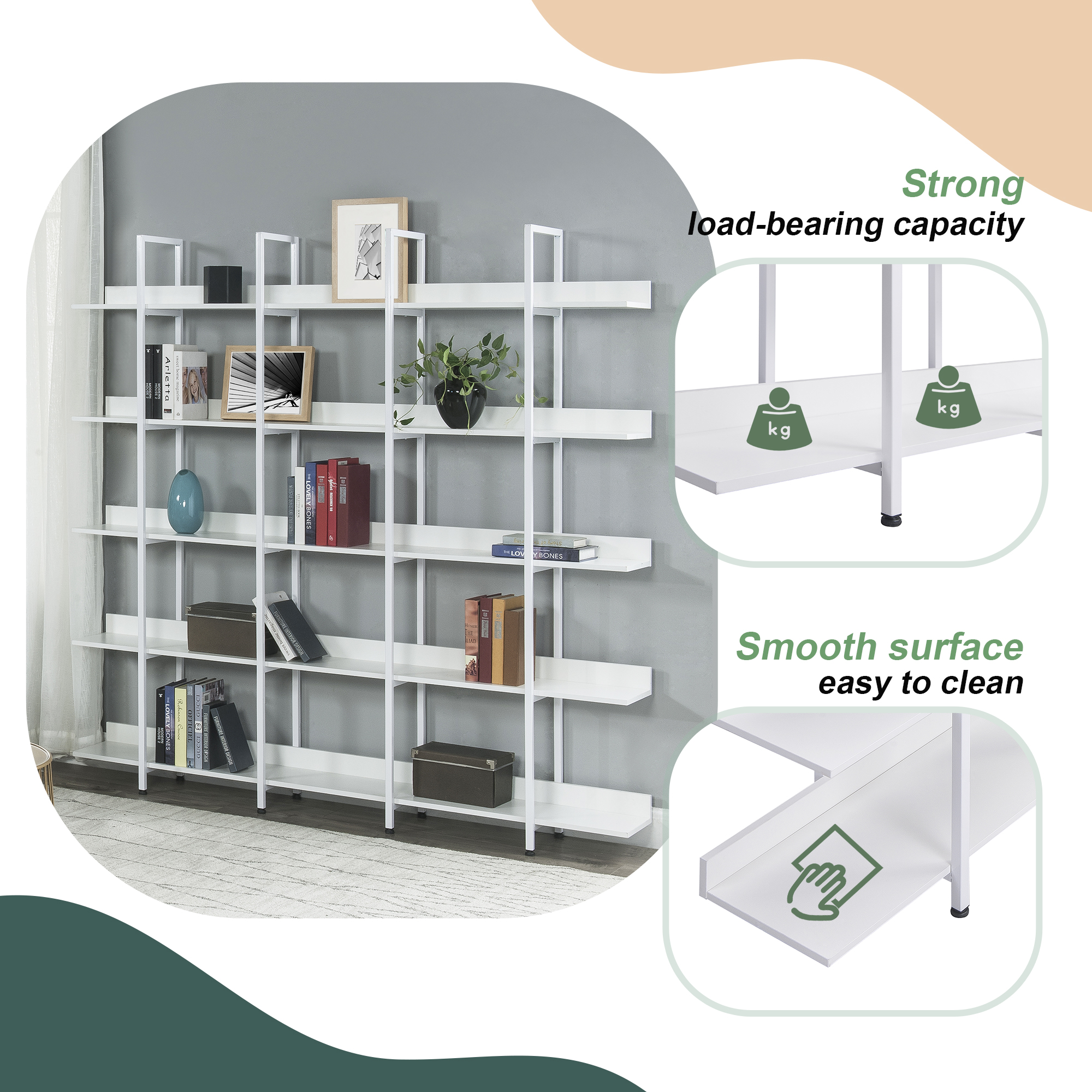 Constructed with an MDF board and a practical powder-coated steel frame, this bookshelf is sturdy and durable, each shelf can support up to 80 lbs, bearing 400 lbs in total, giving you a complete solution of storage and decoration. And the thick panel with a smooth and water-proof surface makes it convenient for daily clean-up, and hassle-free.