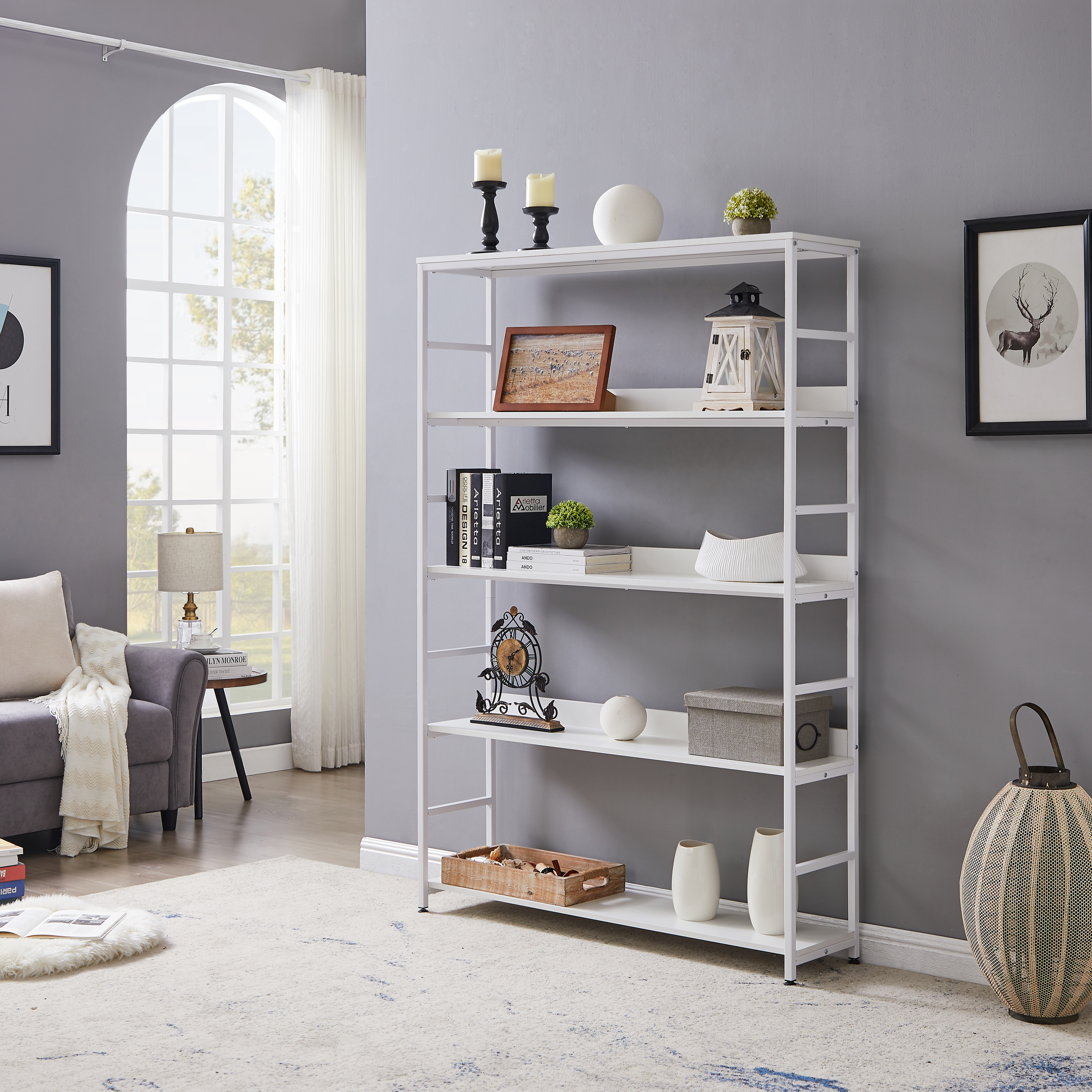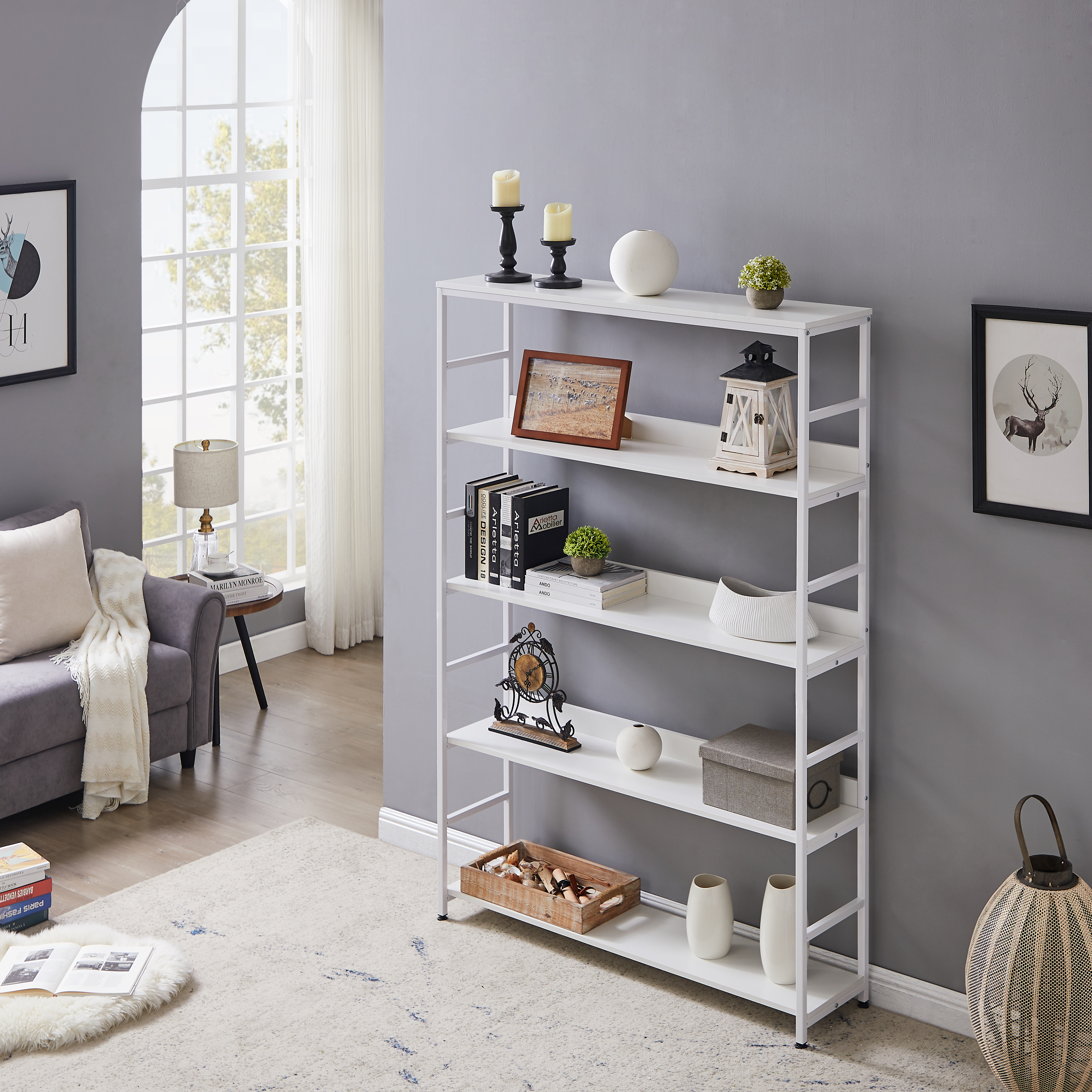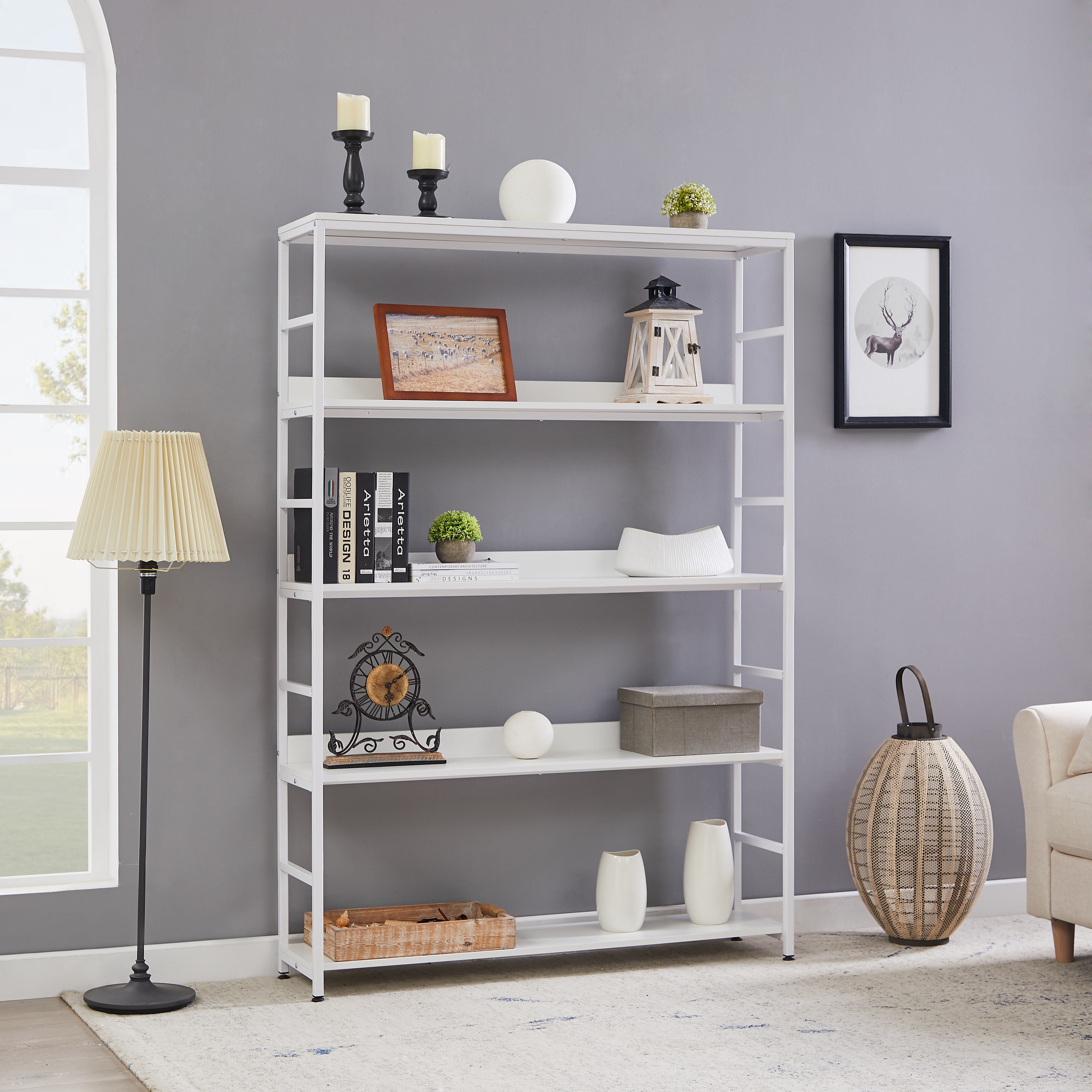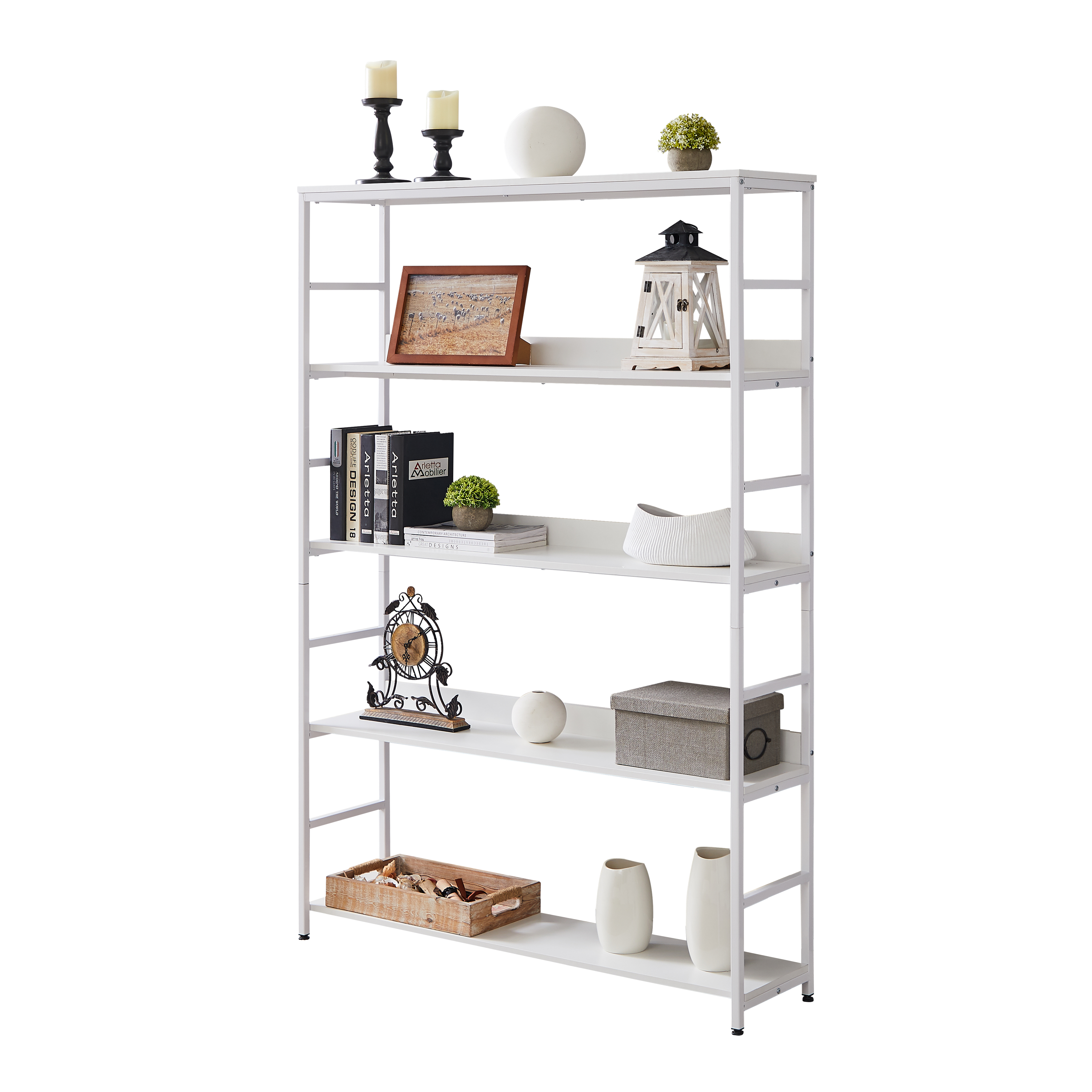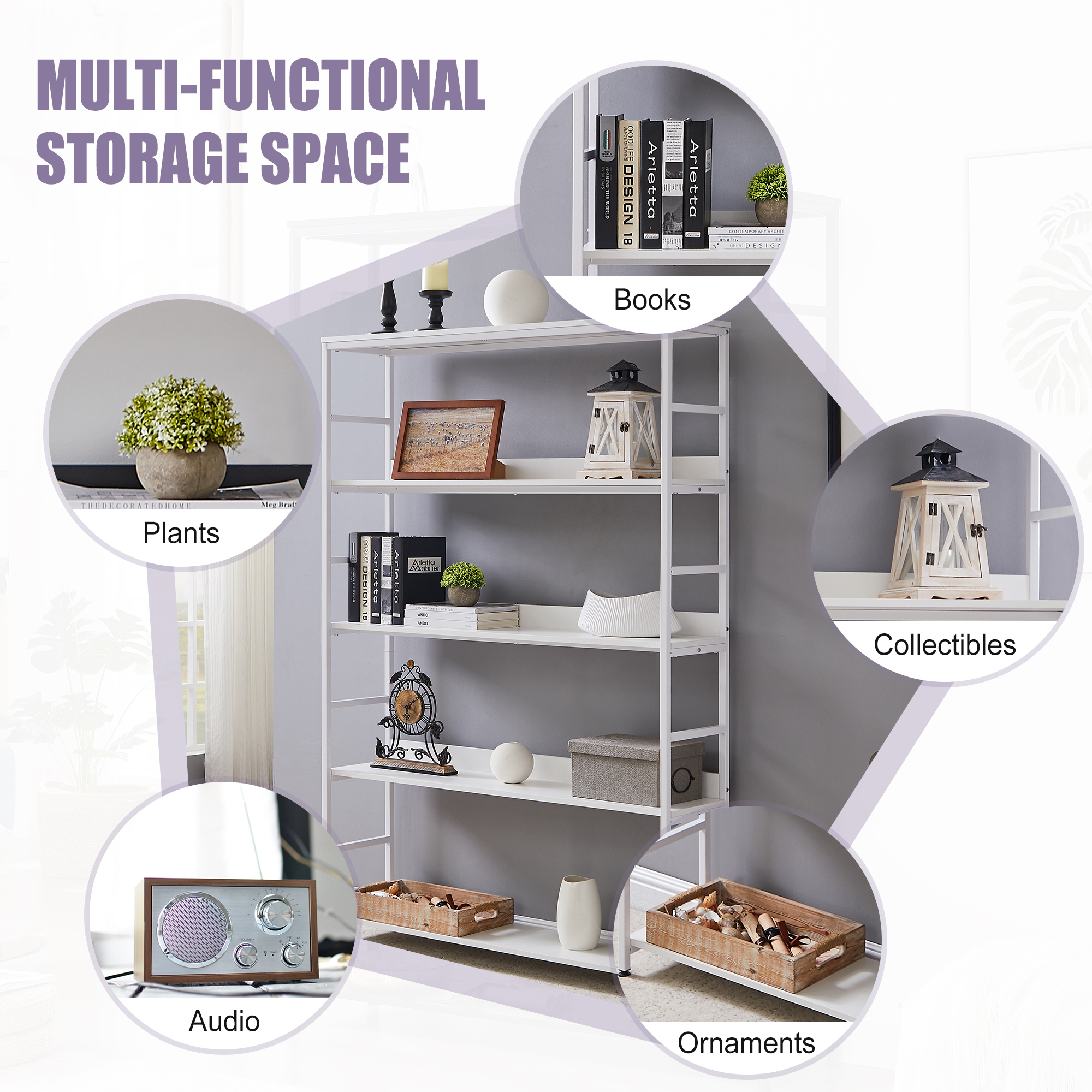 [Capacity]: Crafted from metal and manufactured MDF board, it features with five open shelves that each shelf can support up to 60lbs, super bearing 300lbs in total, giving a complete solution of storage and decoration.