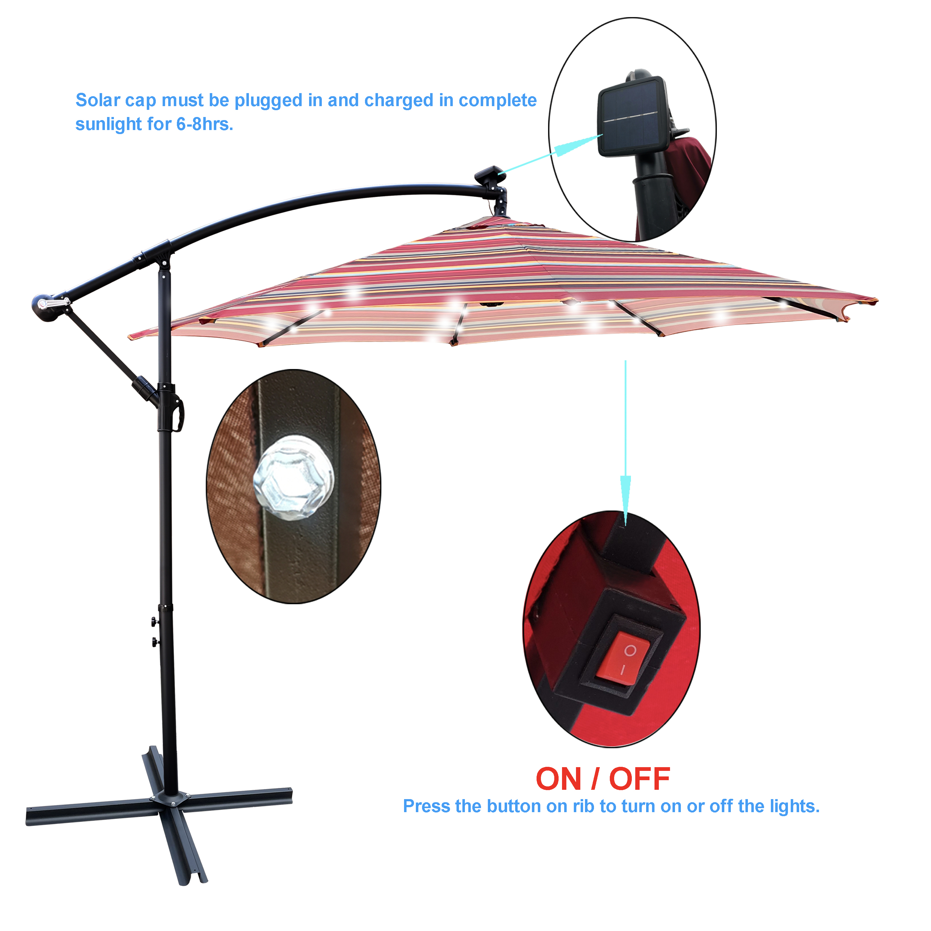 【Sturdy Construction】:This solar LED patio umbrella is made of rust-free powder coated steel pole and 8 sturdy heavy duty square ribs for longer usage. Meanwhile, the bottom of the cross metal ensures the stability and balance of the umbrella and prevents the umbrella from tilting even in windy weather.