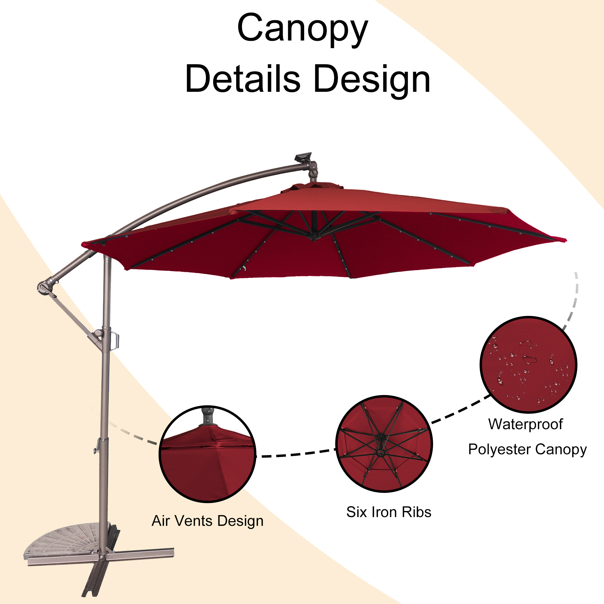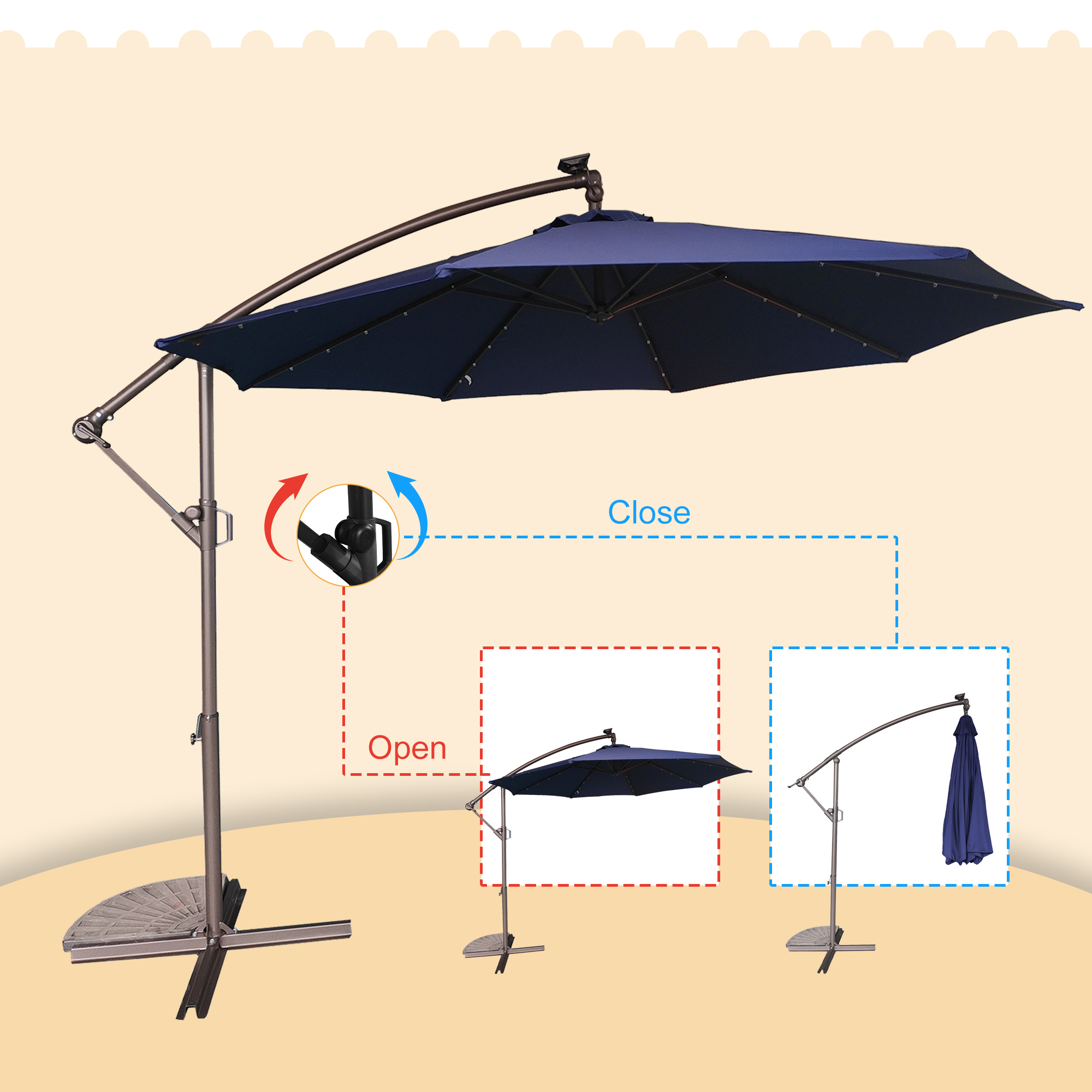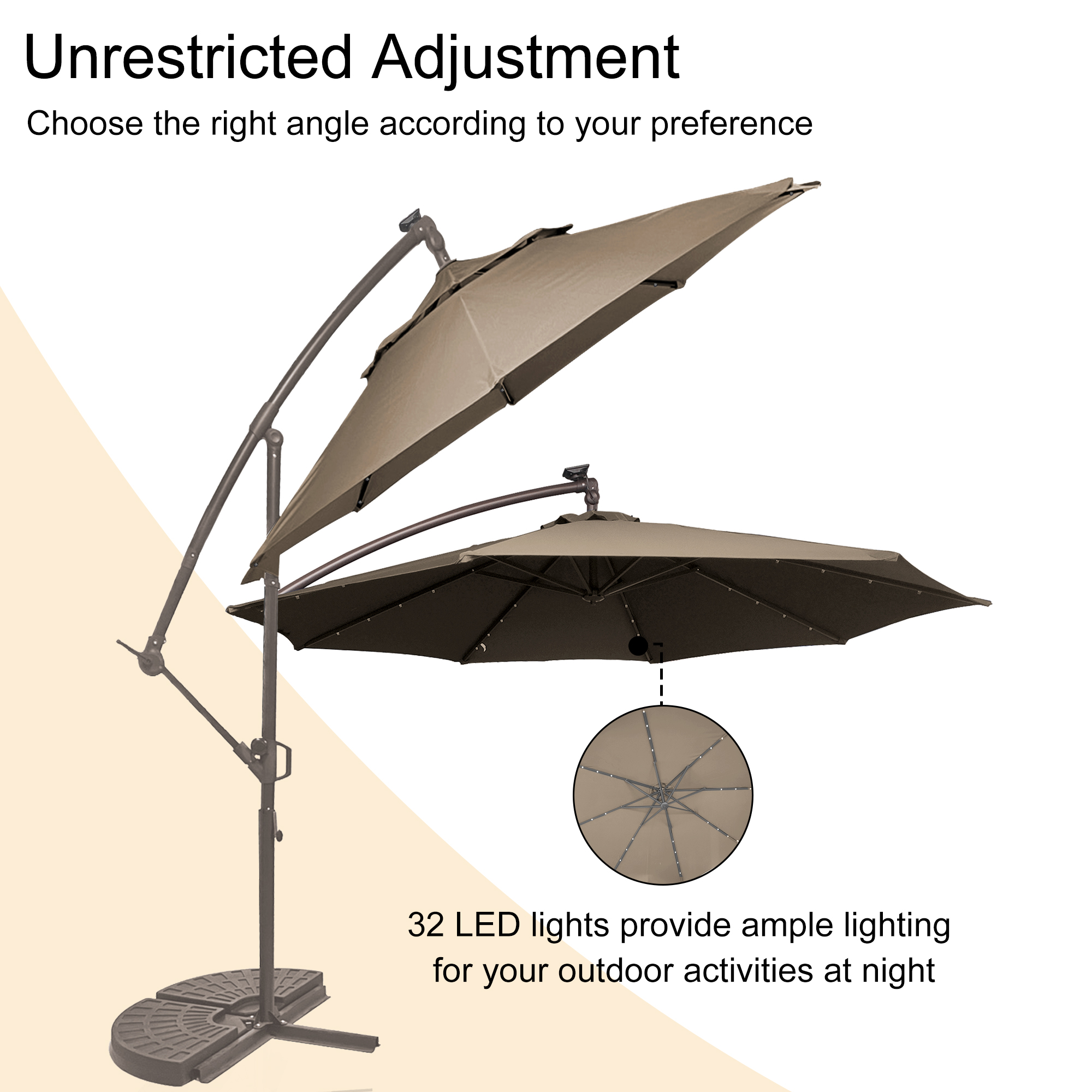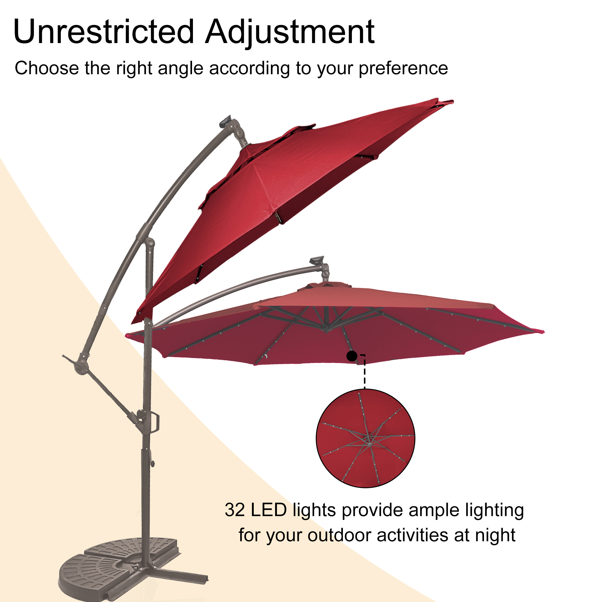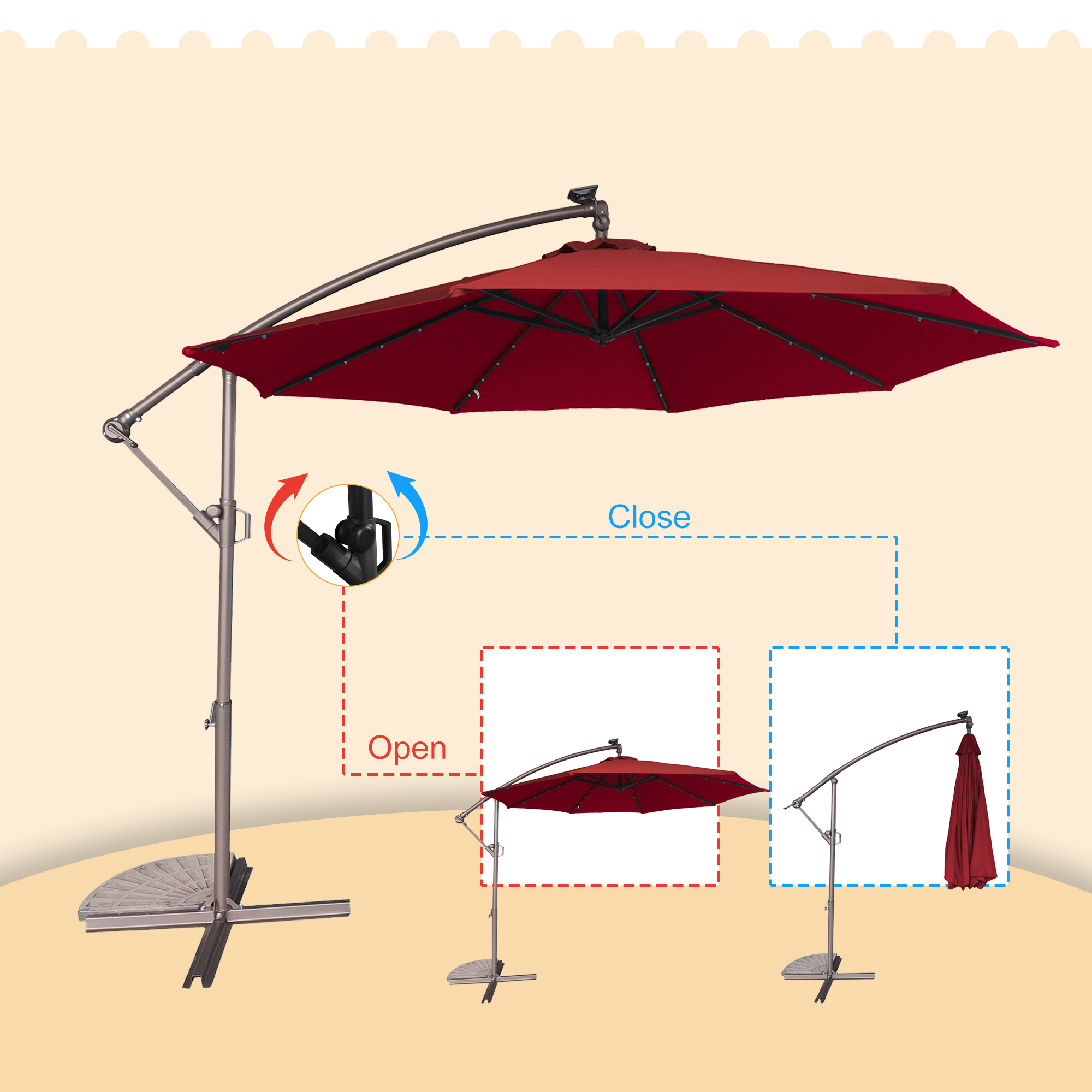 This 10 ft hanging umbrella is multi-functional that can also be used as sun tent, rain shelter, etc. It can be set up in just a few minutes. We suggest that the umbrella is weighted with ground stakes or sandbags for extra stability and security. The sunshade features 32 pre-installed solar-powered LED lights that can light up and decorate your summer night. Add a new partner to make you happy journey, just take it home.