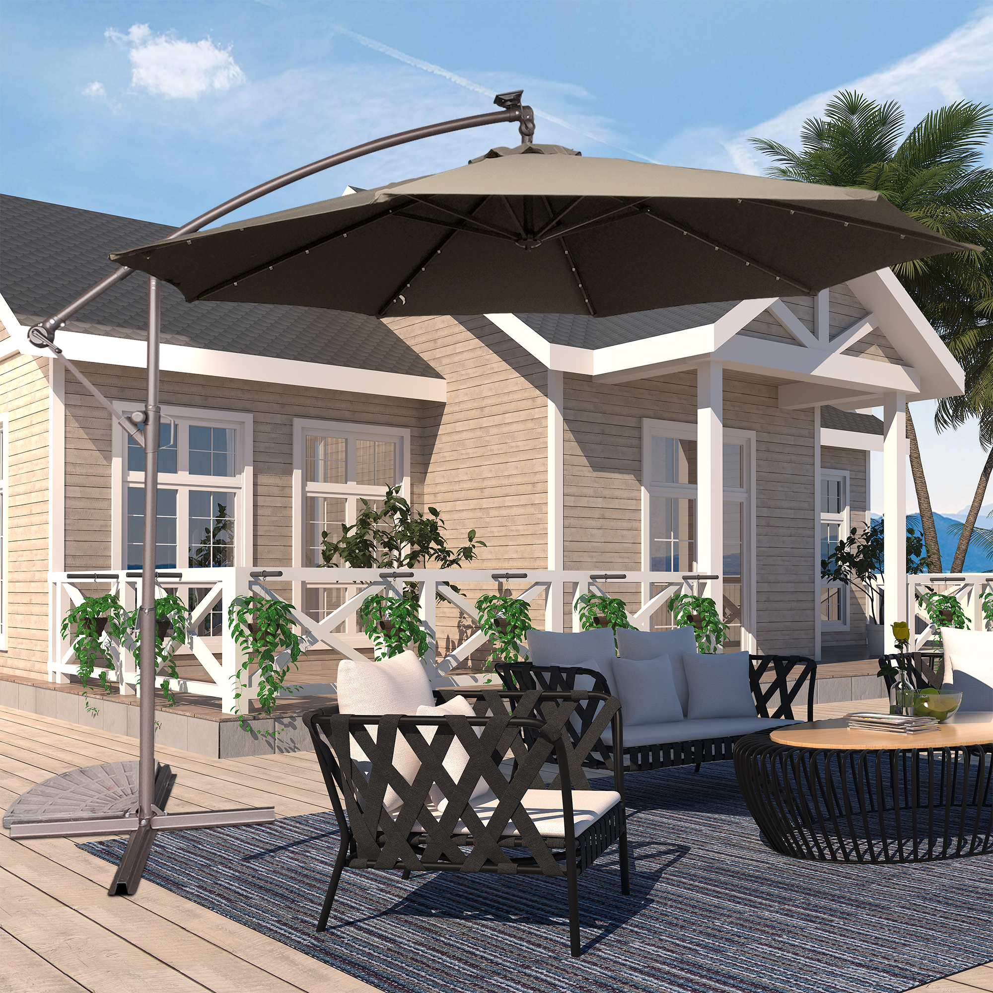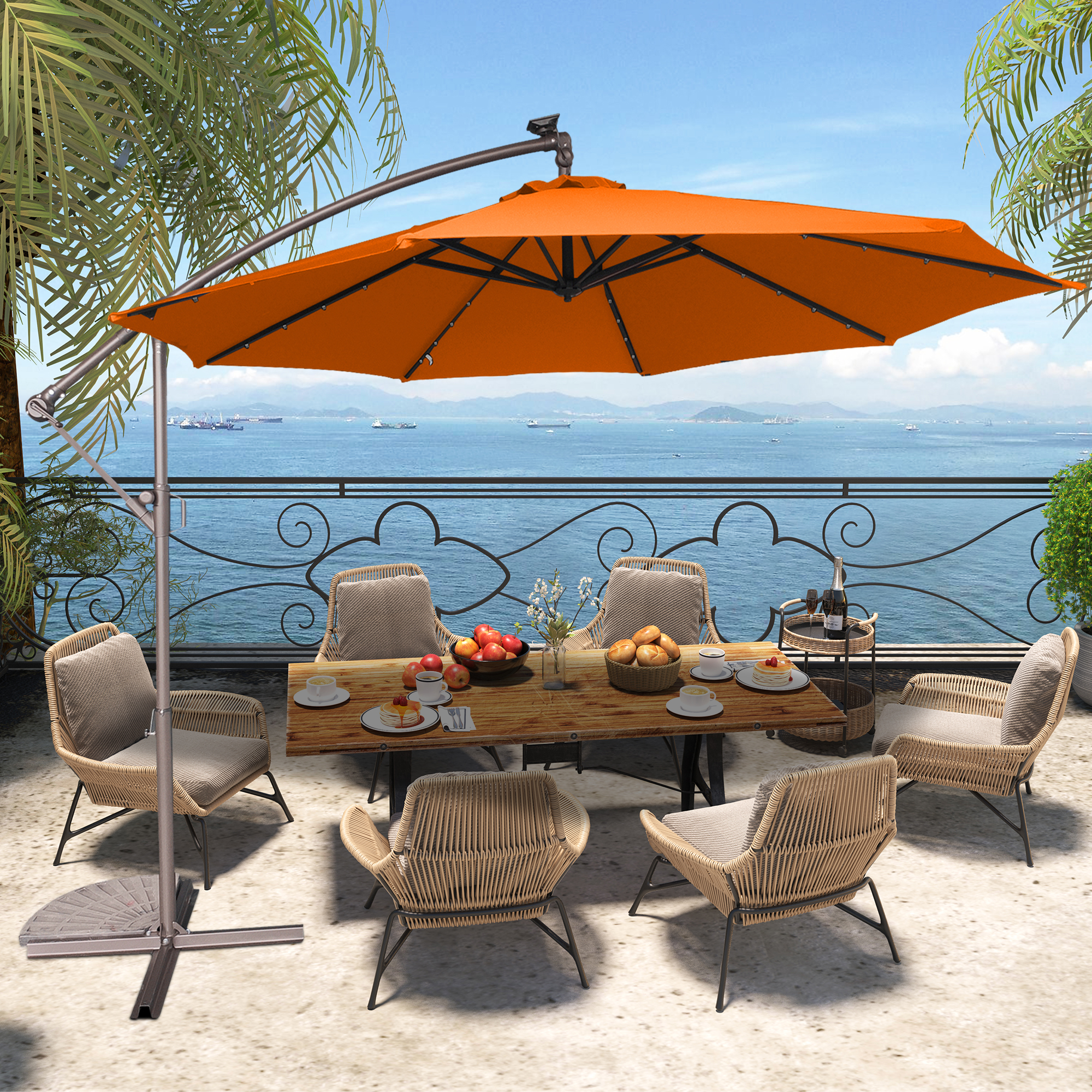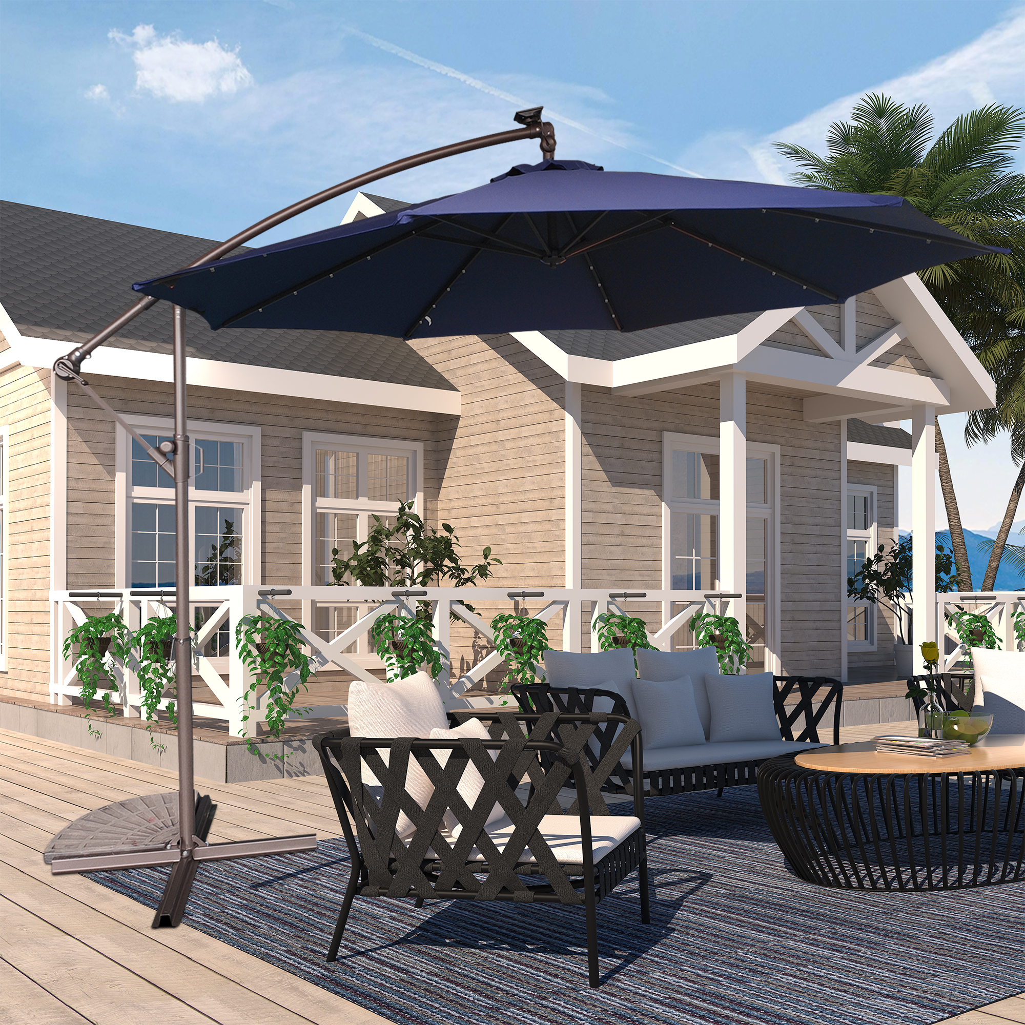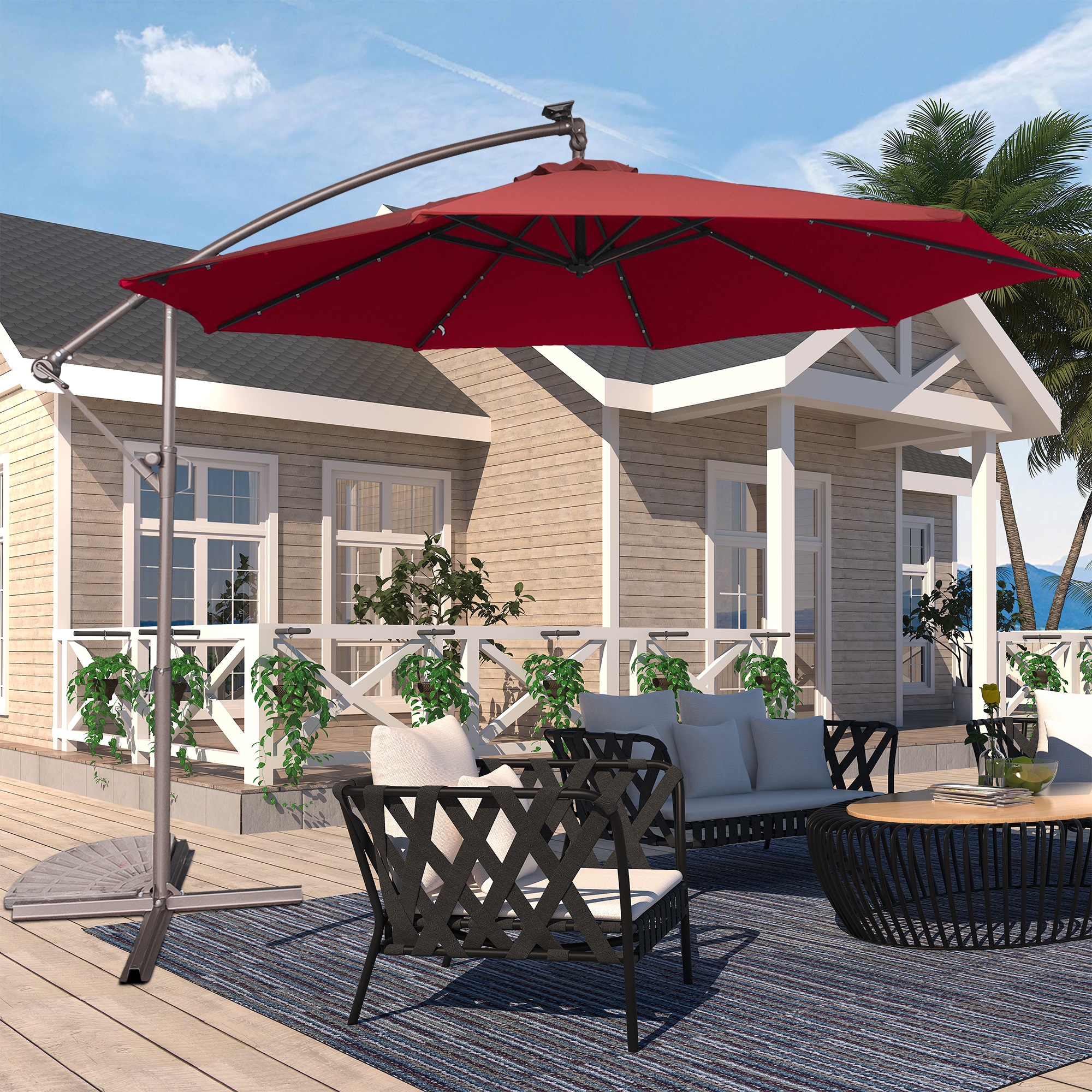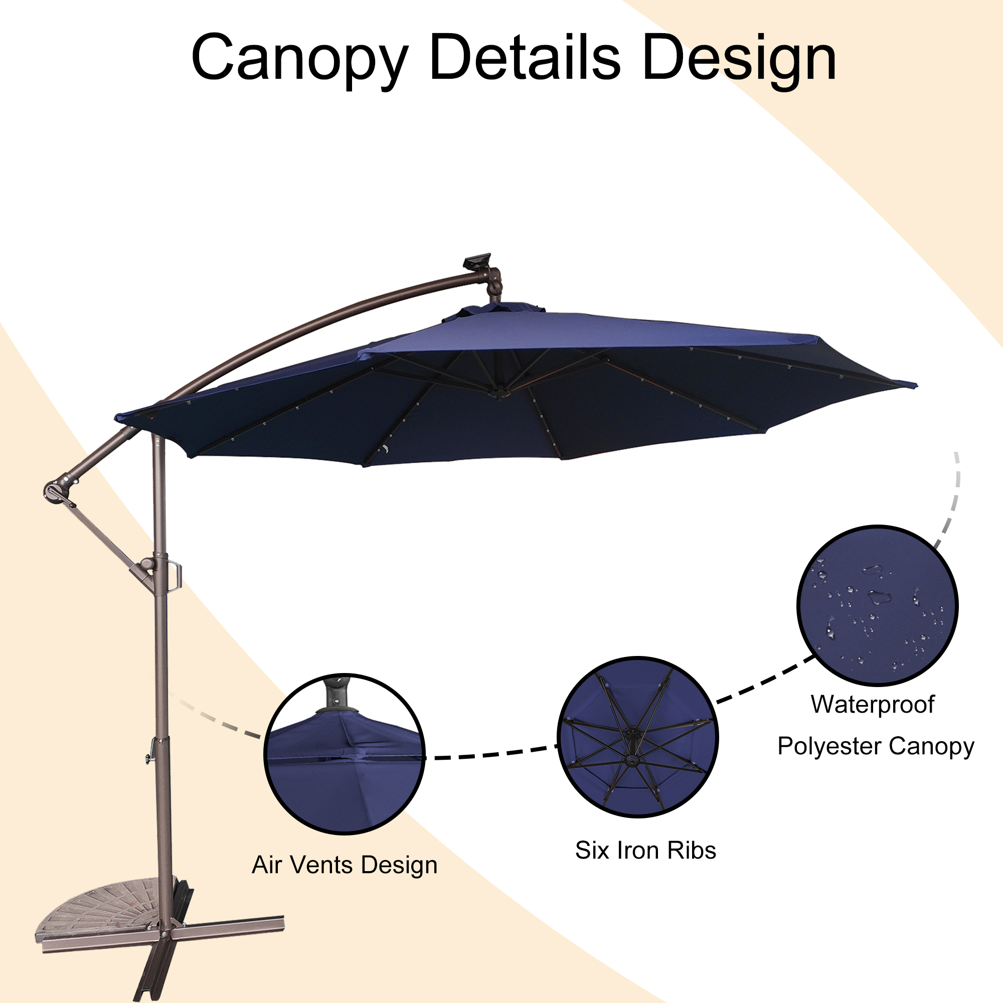 This 10 ft hanging umbrella is multi-functional that can also be used as sun tent, rain shelter, etc. It can be set up in just a few minutes. We suggest that the umbrella is weighted with ground stakes or sandbags for extra stability and security. The sunshade features 32 pre-installed solar-powered LED lights that can light up and decorate your summer night. Add a new partner to make you happy journey, just take it home.
