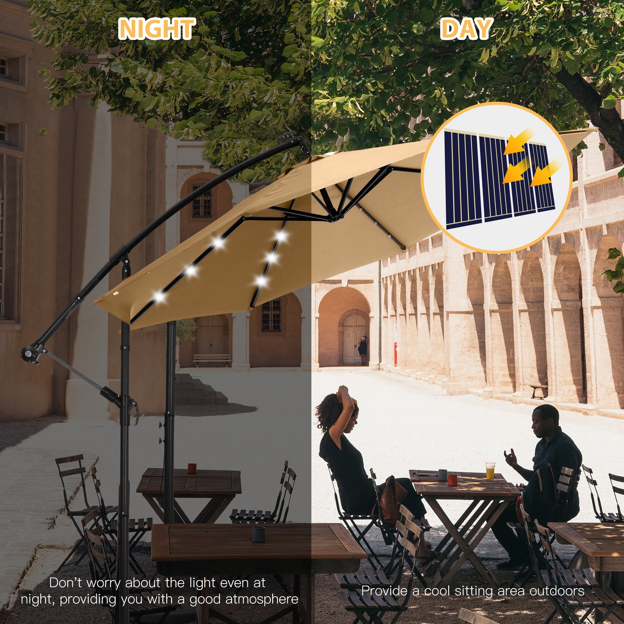 This is a product that has sun-proof function and sturdy construction with 24 solar LED lights. Even on the sunniest day, you can enjoy your outdoor living spaces and remain cooler by using this Patio Sun Shading Umbrella. It is probably the best way to stay outside without absorbing the harmful UV rays of sun, which causes serious sunburns or even skin cancers. At the same time, it is a perfect choice when there is time that rain spotting and you still want to enjoy outdoor scenery and cool breeze.And when the sun falls, eco-friendly & energy-efficient solar powered LED lights with Upgraded solar panel makes it romantic and warm to enjoy night scenery also besides sun shading needs in the day.