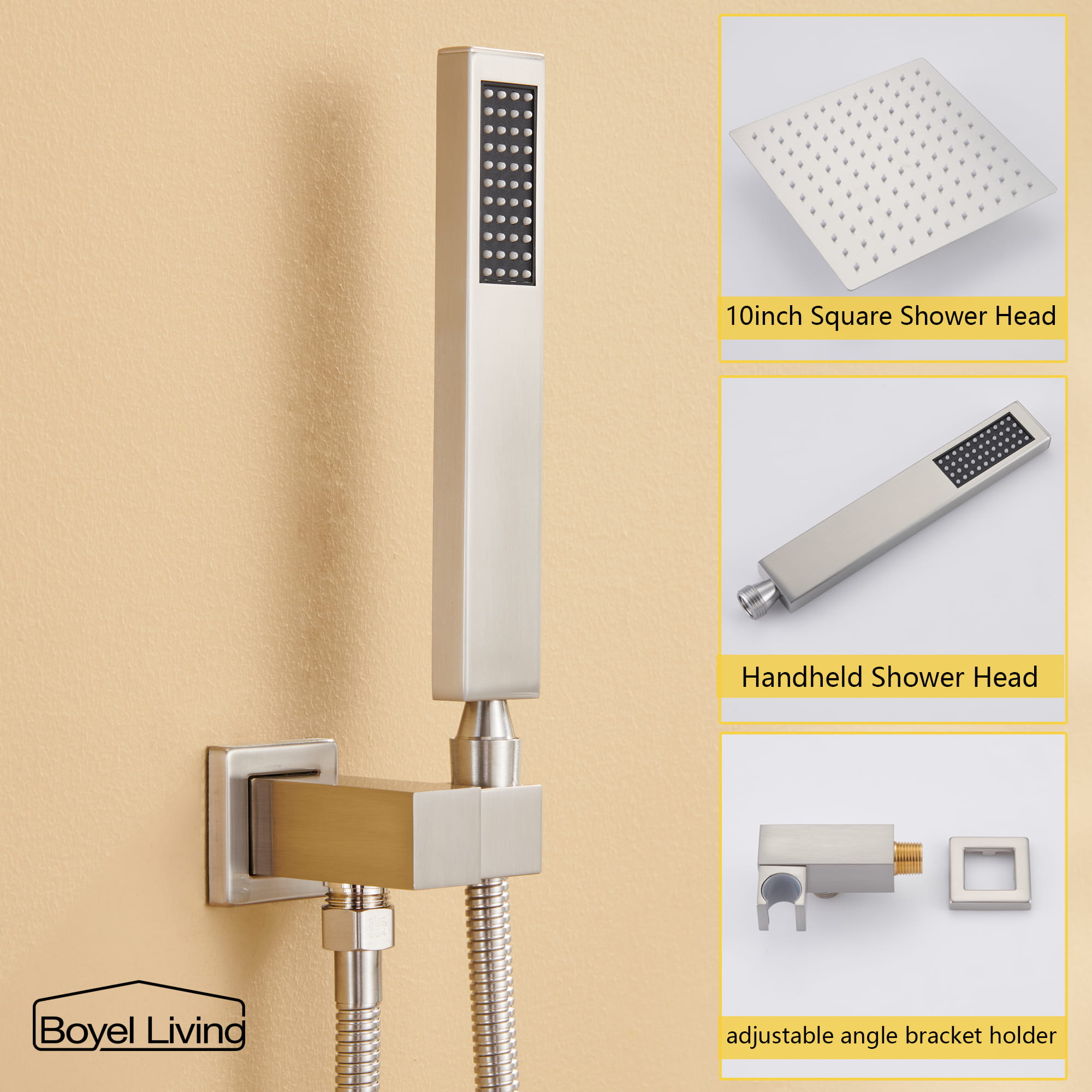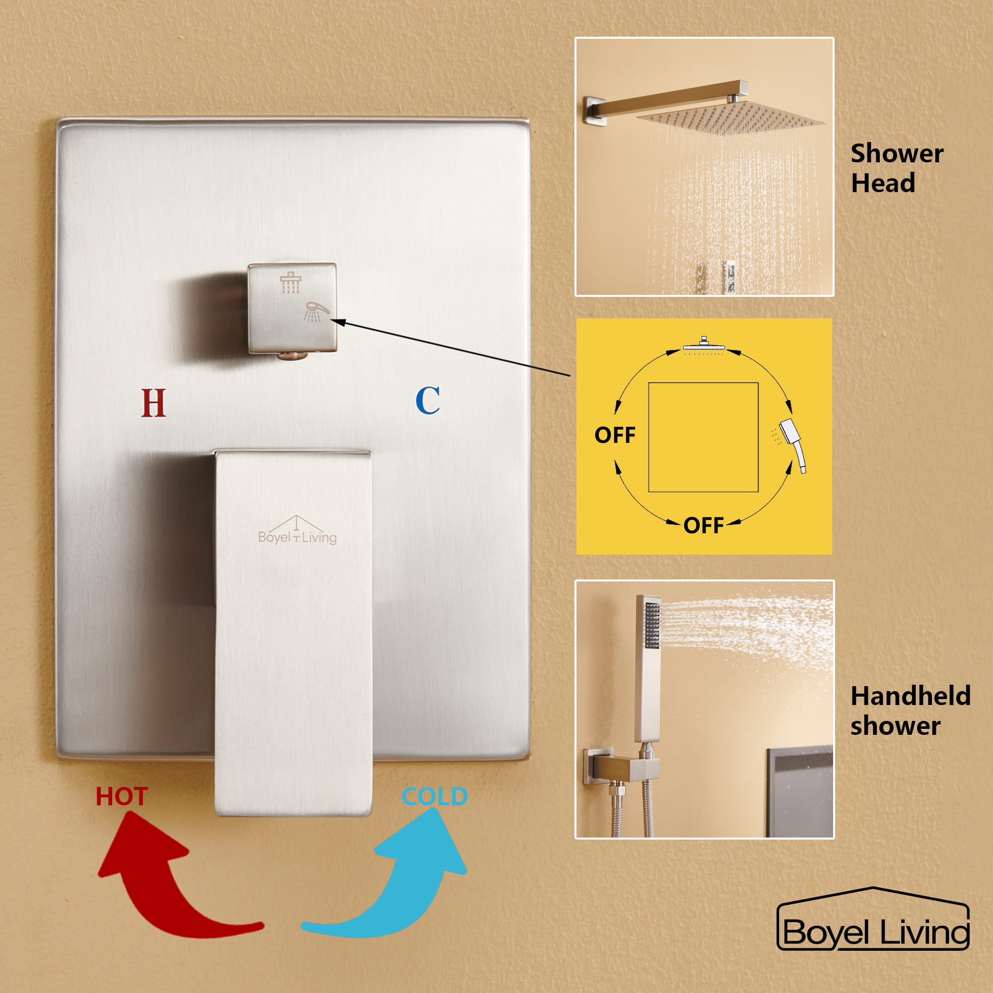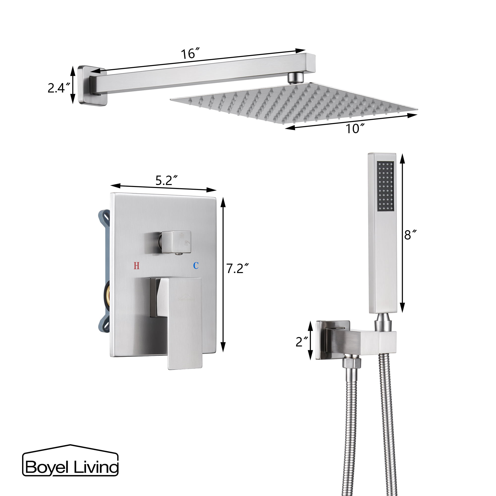 - Concealed installation solid brass pressure balancing shower mixer valve(rough-in valve body and trim included), 10 inches 304 stainless steel rain shower head, L style brass handheld showerhead,wall-mount supply wall elbow for handheld shower head with 304 stainless steel shower hose.