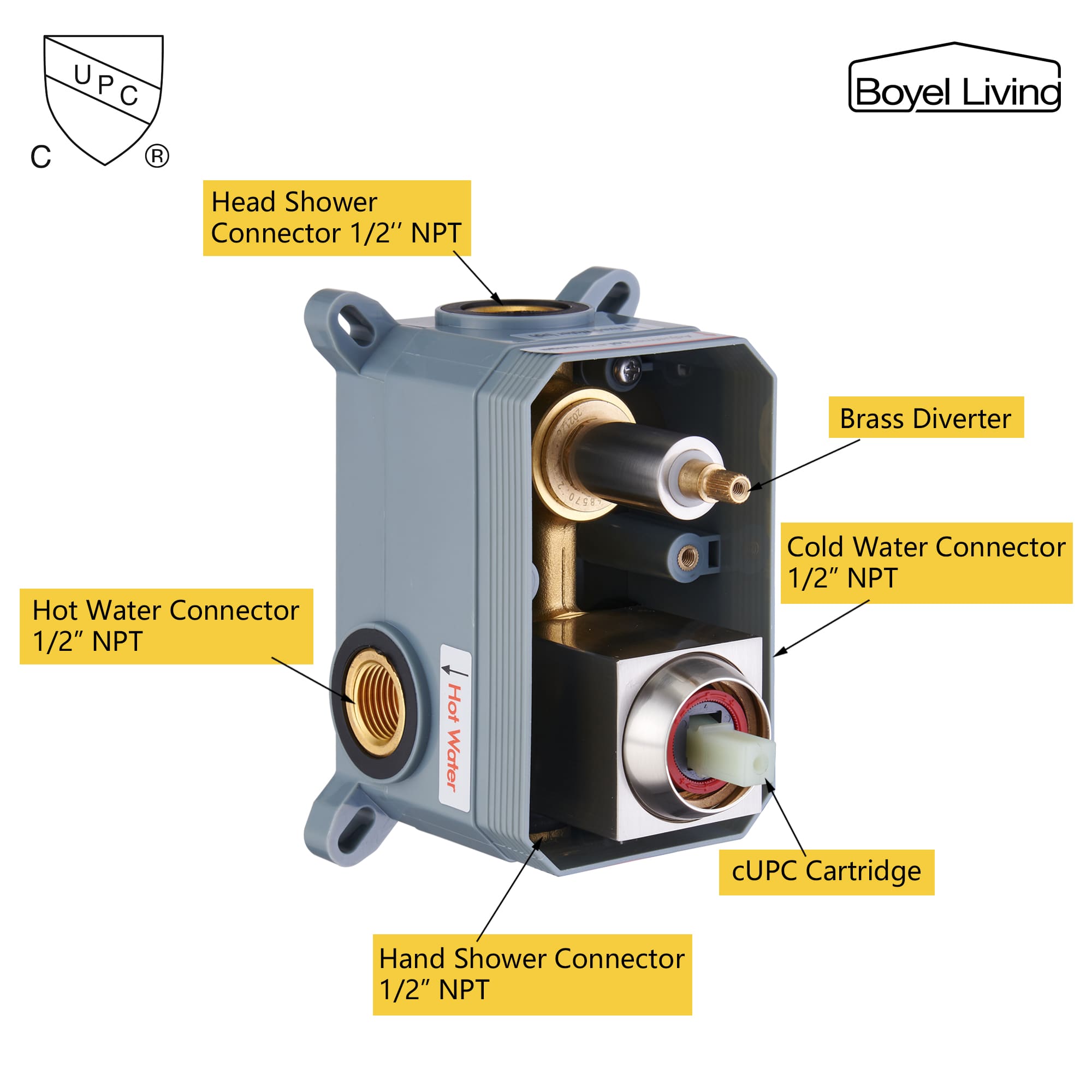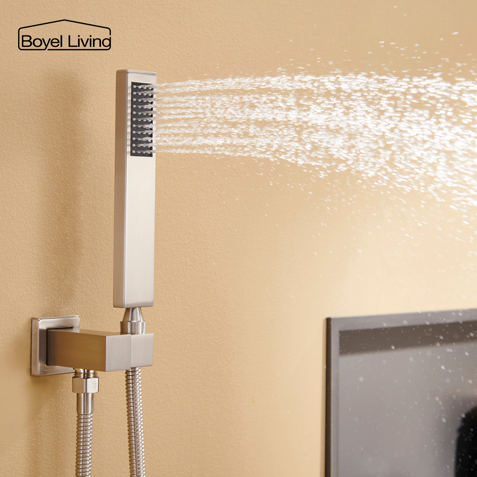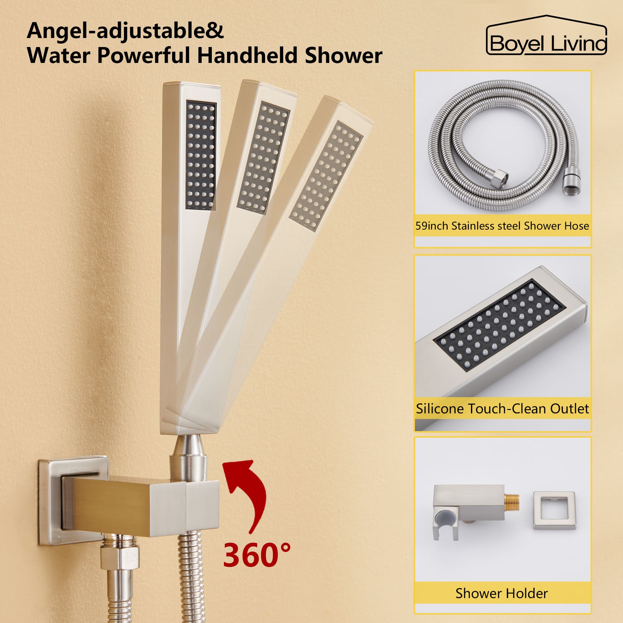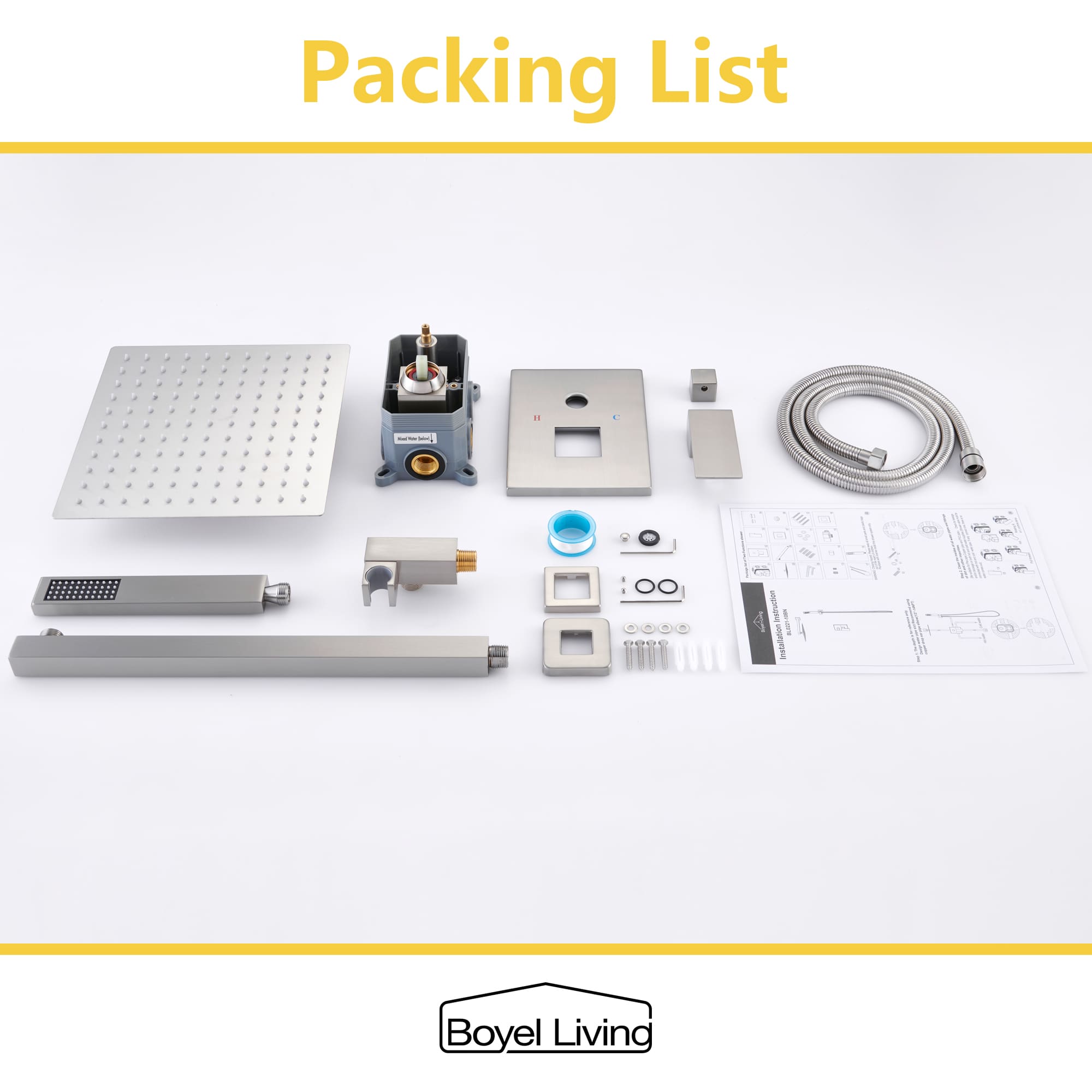 - Concealed installation solid brass pressure balancing shower mixer valve(rough-in valve body and trim included), 10 inches 304 stainless steel rain shower head, L style brass handheld showerhead,wall-mount supply wall elbow for handheld shower head with 304 stainless steel shower hose.