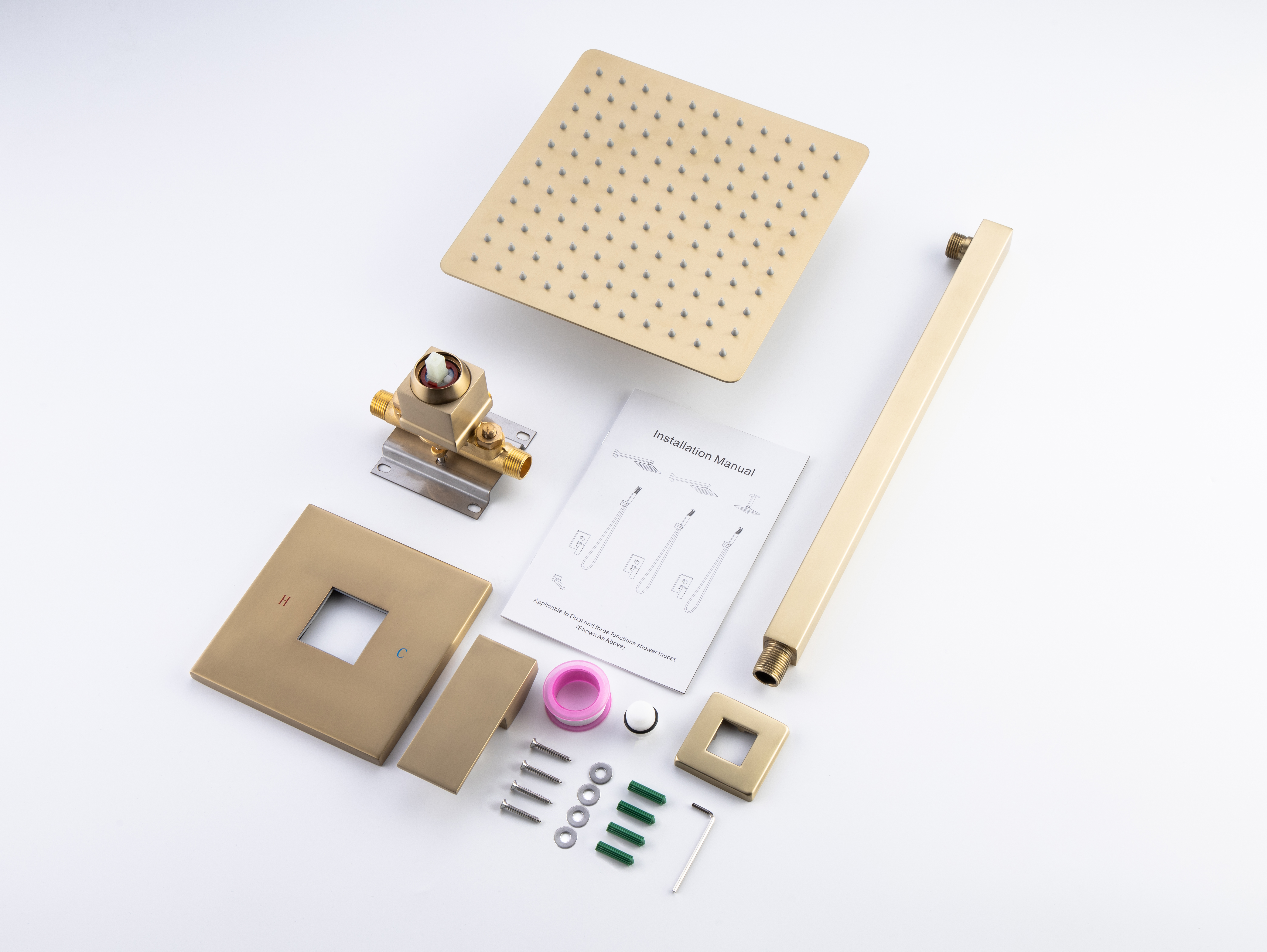 Include: 10-inch Square rain shower head, water control valve, and install hardware include.