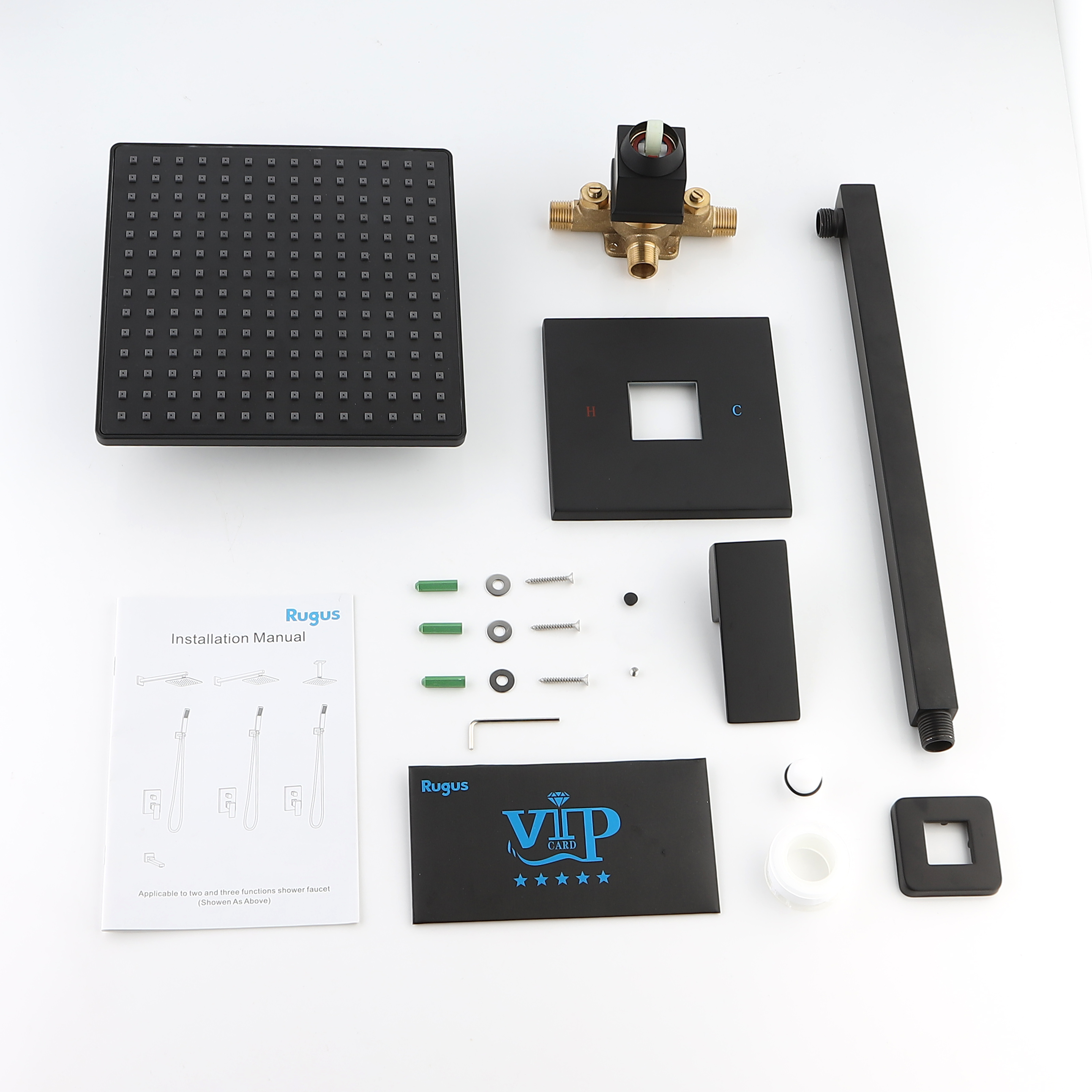 Package Includes 10-inch square rain shower head, water control rough-in valve, shower arm, and install hardware included