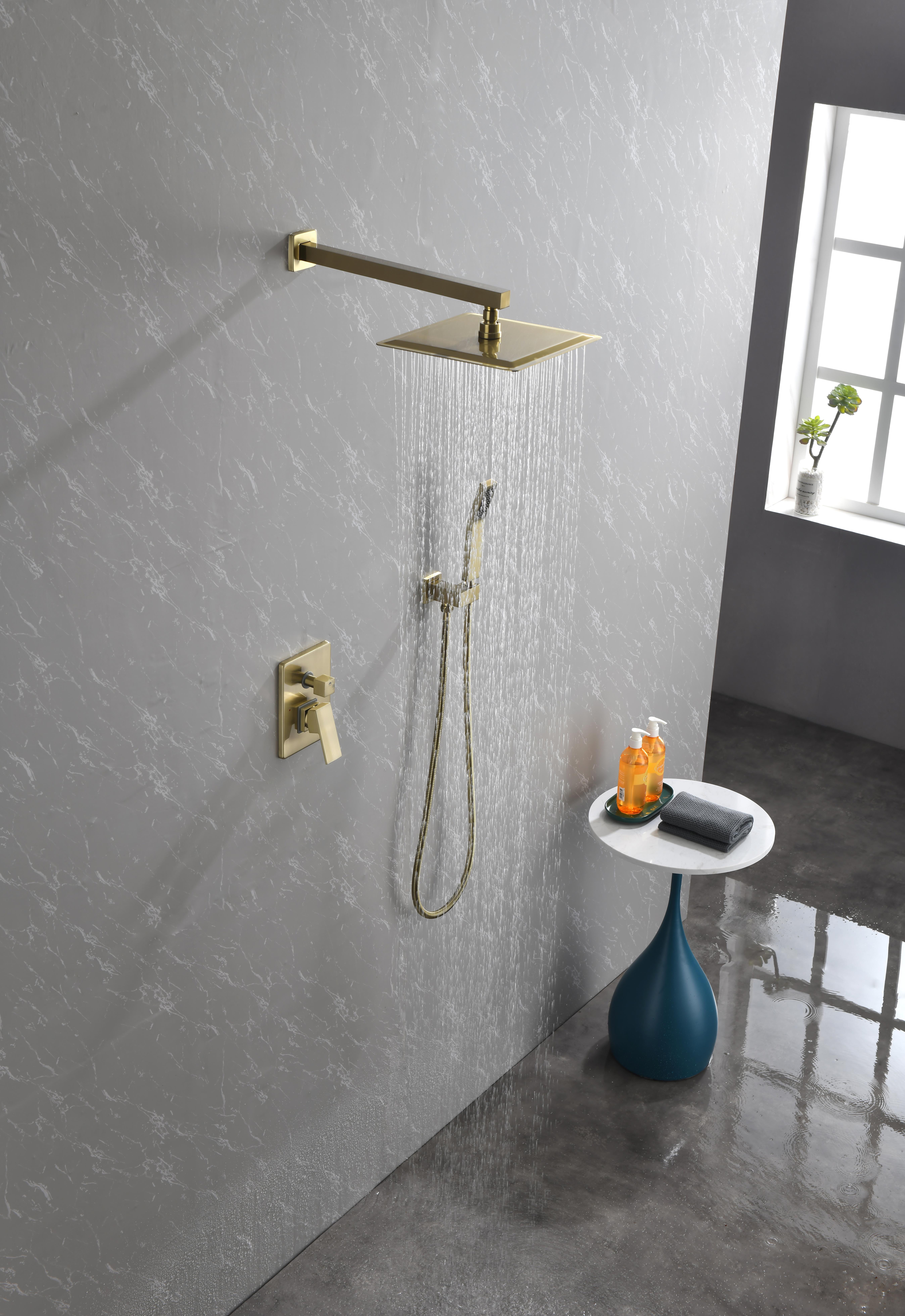 3.Includs 10" (250mm) rain shower head, wall mount shower arm, hand shower parts and 2-function valve.