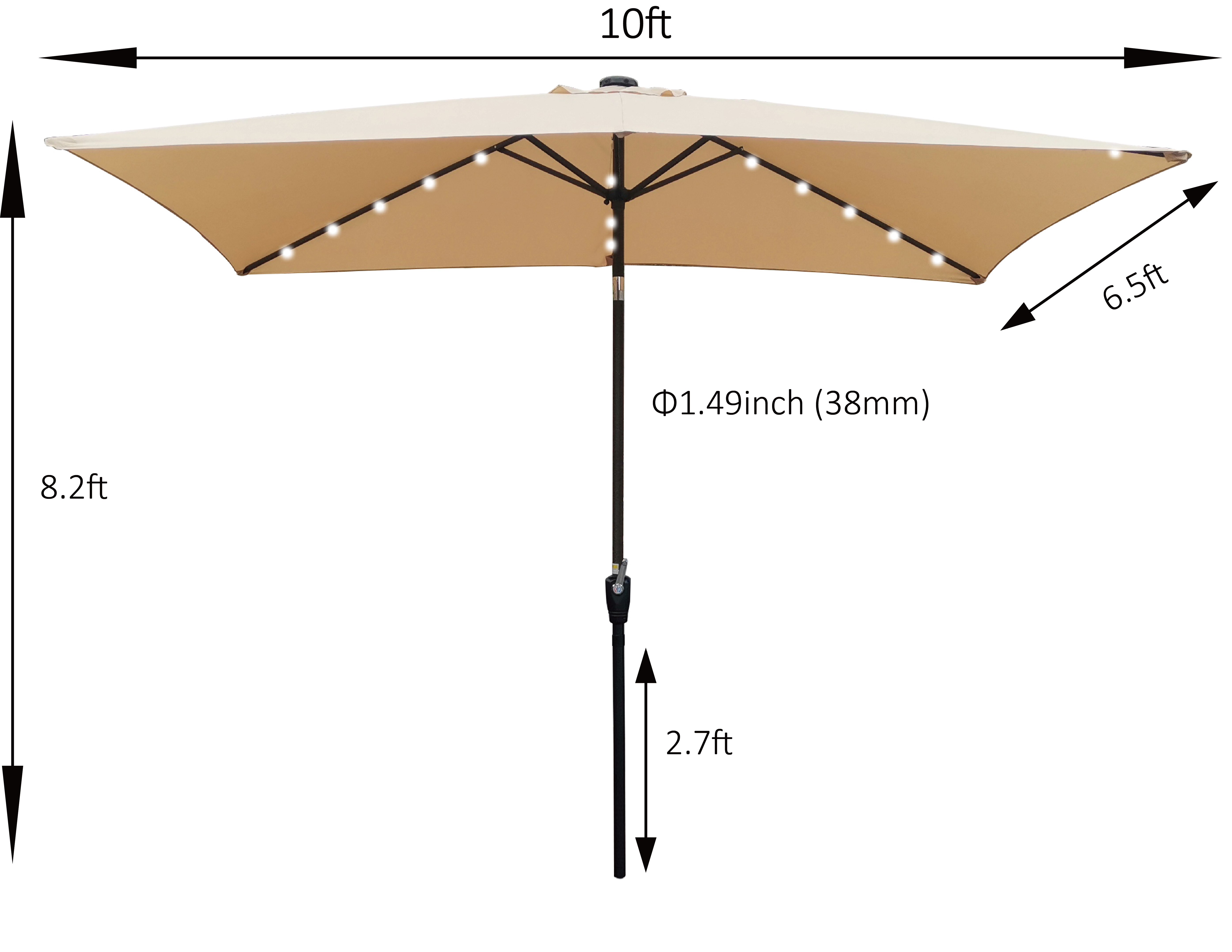 【High Quality Material】: The 10 ft x 6.5 ft Rectangular Solar LED Market Umbrella is durable. 100% high quality polyester canopy is waterproof, fade resistant and easy to clean. This umbrella has excellent materials and quality, and its waterproof and ultraviolet (base is not included).