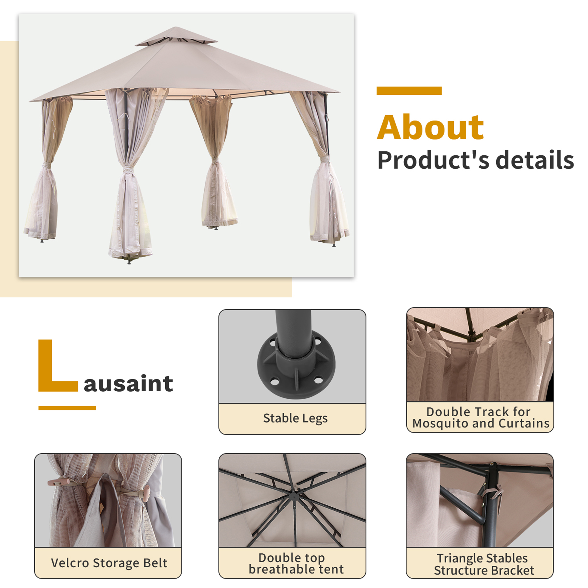 【Vented Double Roof】:The gazebo has double roof top to enhance air circulation, reduces heat and brings cool experience, strengthen wind resistance, providing unmatched stability in windy conditions; looks elegant and beautiful. In addition, there are drainage holes on the awning keep water from gathering.