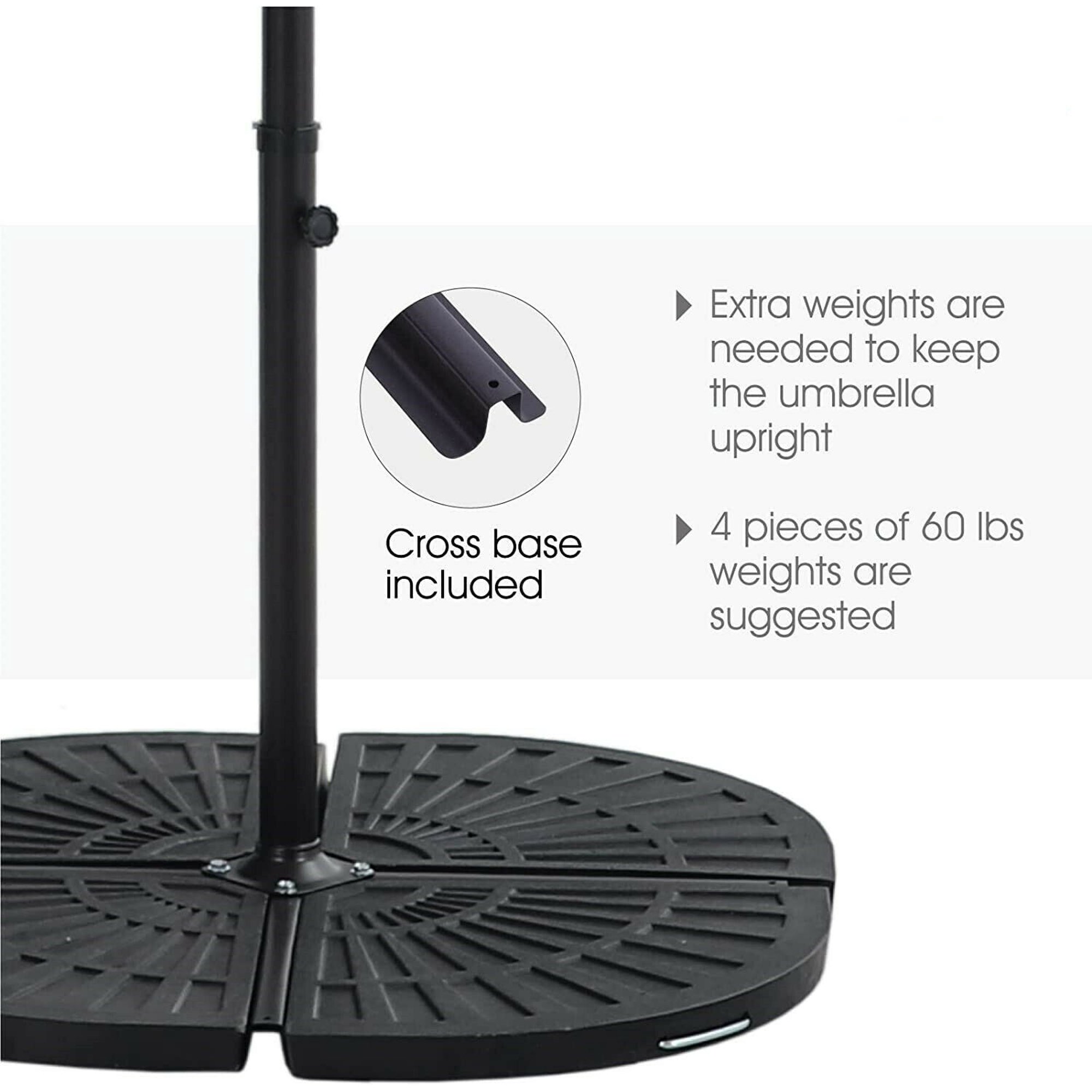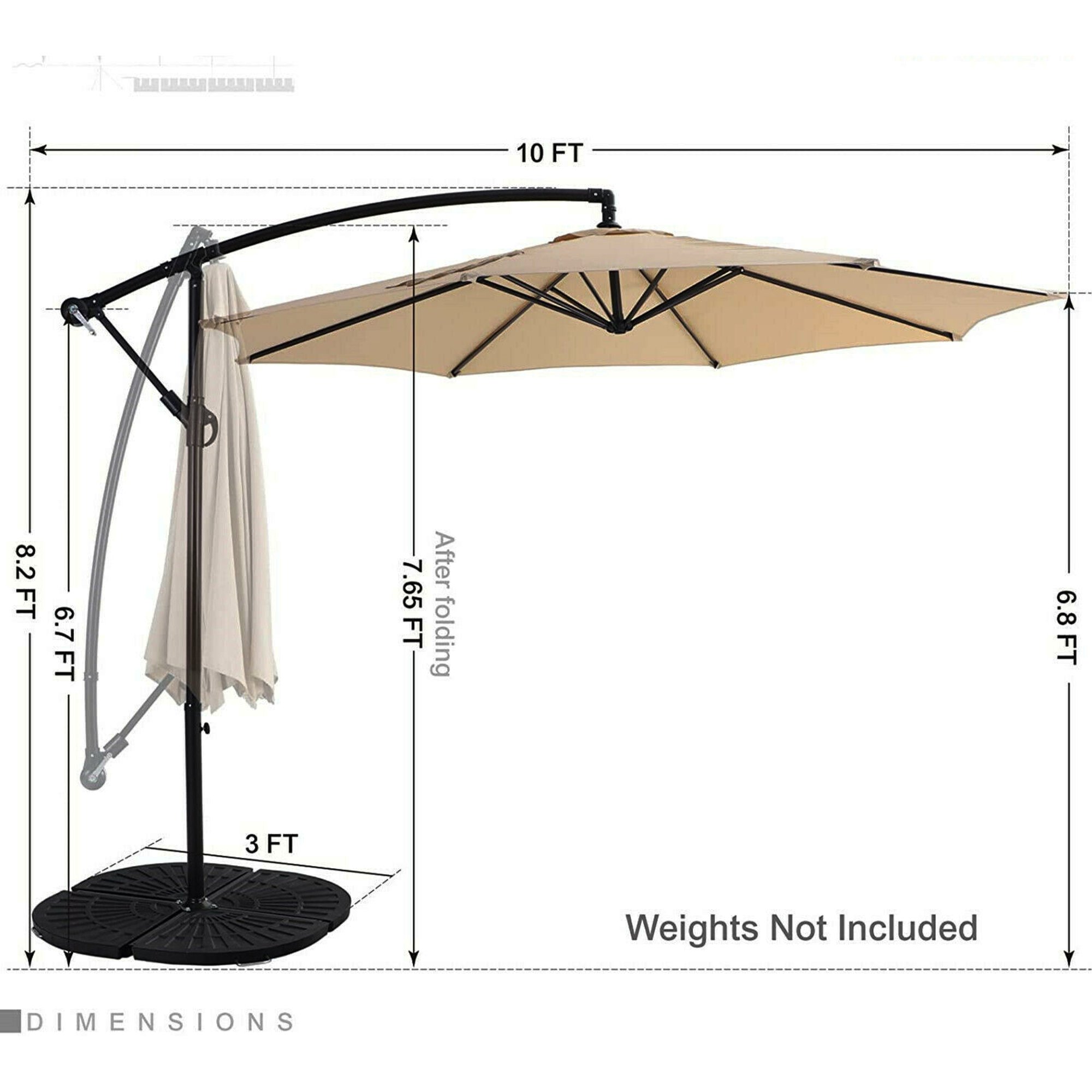 Product detailsA patio umbrella with tilt and crank functionality is the perfect answer to achieving shade on your patio. With an umbrella on the patio you can easily control your exposure to the sun and remain comfortable while spending time outdoors. Featuring a push-button tilt function, you can easily maneuver your umbrella into the desired angle for maximum comfort. Plus, the crank makes it easy for you to open or close your umbrella. In addition, the umbrella is engineered to last with a black powder coated aluminum pole for resistance to rust, steel ribs for maximum support and 100% polyester fabric for the umbrella for extra durability.SpecificationUmbrella Diameter: 10FTUmbrella Height: 7.8 FTColor: BeigeMaterial: Polyester, Alloy SteelUmbrella Ribs: 8 Steel RibsPackage Includes:1 x Patio Umbrella with Cross BaseATTN: The umbrella comes with a cross base. It needs to be secured with a weighted base (NOT INCLUDE), or other weights like bricks and sandbags(NOT INCLUDE). You may also bolt it down to the ground.