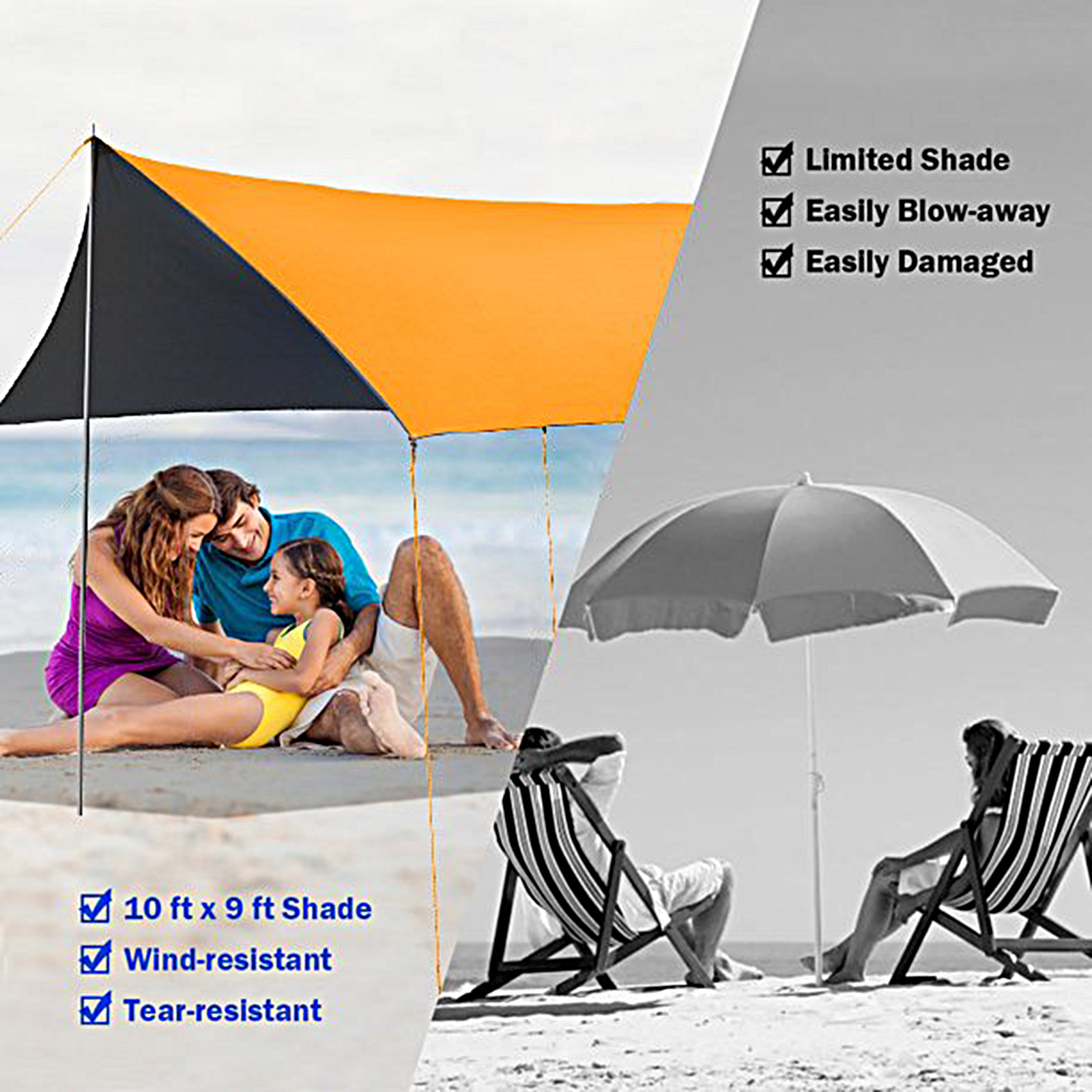 Summer day is ideal for all kinds of outdoor adventures and gatherings. Why not take this Beach Tent, and enjoy your the wonderful holiday on beach, picnic, open-air festival, or camping. More Than An Outdoor Cabana, it is also a picnic canopy, fishing sunshade. Well-selected elastic nylon ensures durable use and easy cleaning. PACKAGE INCLUDED:1 Sun Shelter; 6 Wind Ropes; 6 Pegs for Grass; 6 Sandbags; 2 Lightweight Poles; Lightweight Carry BagsHIGH-QUALITY MATERIALS: Crafted with Polyester Taffeta fabric and offering UPF 30+ UV protection and water-resistant function, our sun tents for beach and outdoor use block out harmful UV rays to reduce sunburn or glare making them ideal for kids or adults. LARGE FAMILY SUN SHELTER: Our outdoor sun shades are available in a 6-8 person (10'x10'), spacious for couples, large family gatherings on grass, peaceful mountains or simply relaxing in the backyard with friends. EASY TO SETUP: Just follow the instruction, each sun shelter is set up easily with two people and comes with stability poles and anchors that let you use it over sandy beaches, thick grassy areas, or even in rocky camping spots. ULTRALIGHT & PORTABLE: This lightweight sunshades outdoor come with a portable carrying bag for storage. Stability poles can be folded for storage, other items are the lightweight material selection. It is durable and takes up little space which is convenient for you to take this sun tent outside.Specification Size: 10'x10' Color: Orange Material: Fabric Sport Type: Camping & Hiking, Fishing Special Feature: Water-Resistant, Portable, Lightweight, UV Protection Recommended Uses For Product: Camping & Hiking