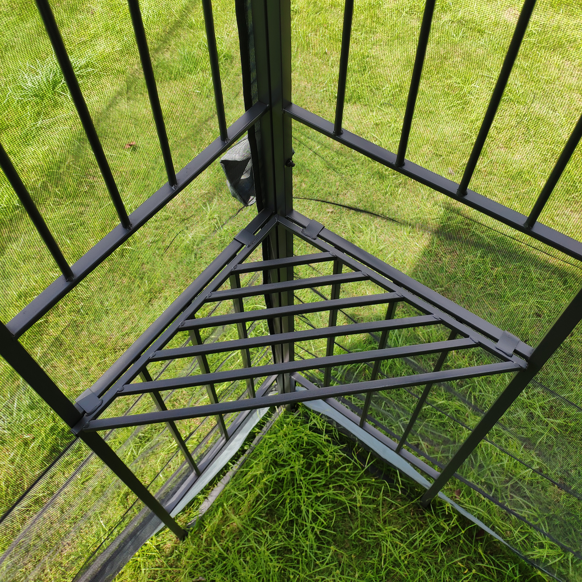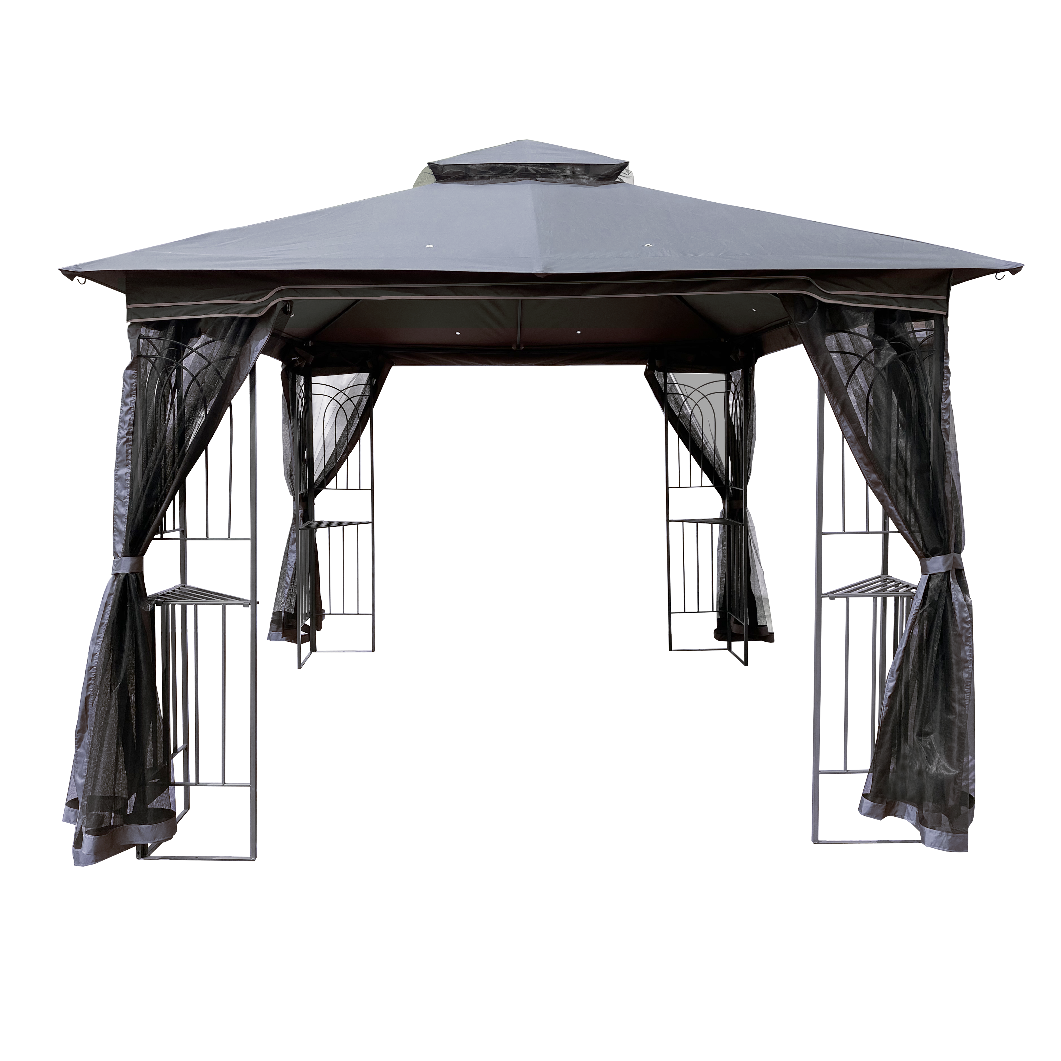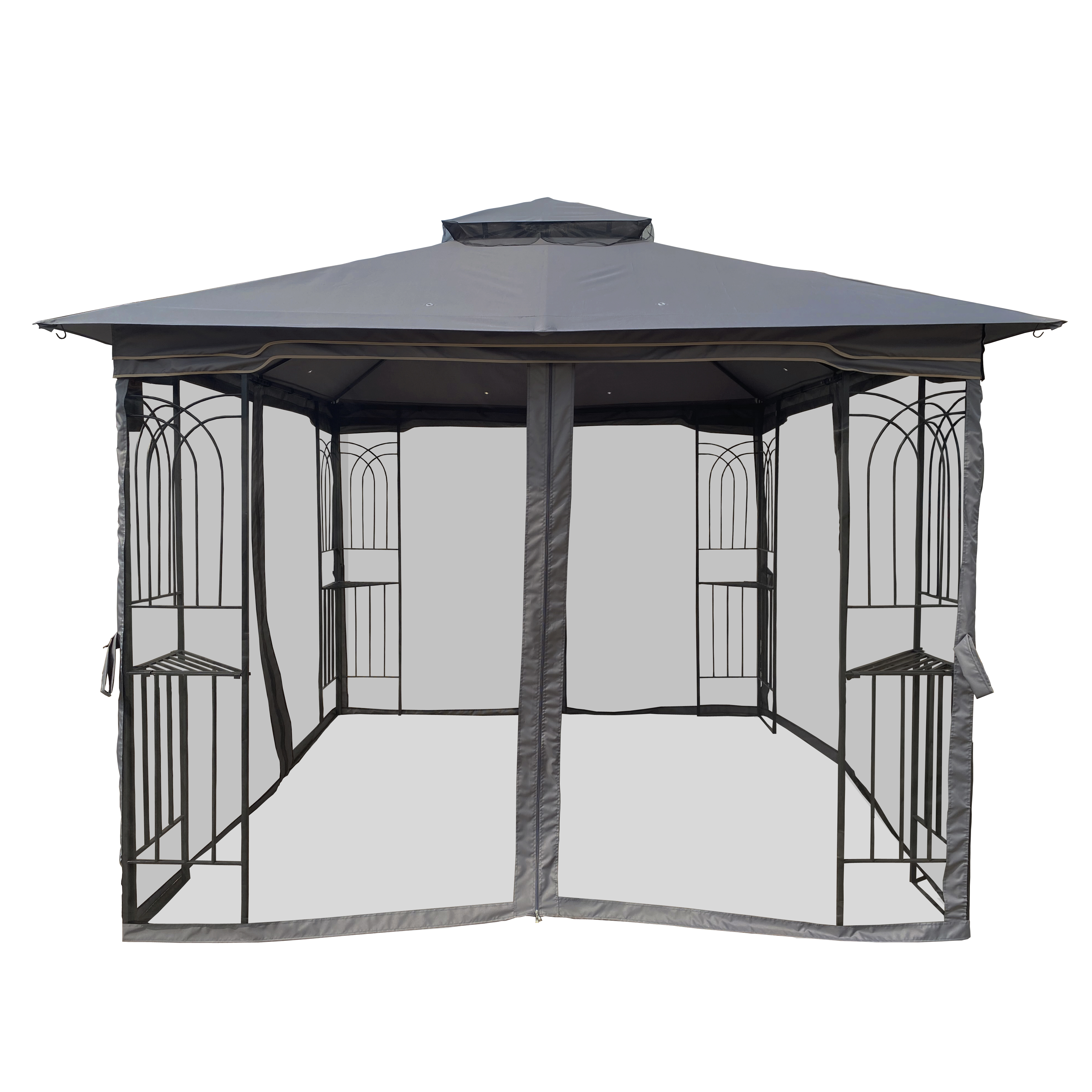 DescriptionThis 10x10Ft gazebo provides spacious space and is fitted with four-sided mesh for insect protection and wind and rain protection.With it you will enjoy a comfortable and relaxing courtyard life with your family and friends.HighlightsLarge Space Canopy:This 10x10 gazebo provides enough shade for you and your family's daily leisure activities.You can place a dining table or a set of sofas inside the gazebo, which can accommodate 5-6 people for outdoor entertainment for you and your friends.High Quality Structure:The frame is made of powder-coated steel,which is sturdy and anti-rust.All four legs are triangular frames made of iron pipes to provide stable support and allow for the placement of small objects.High Quality Fabric:The gazebo Top cloth made of high quality polyester cloth, waterproof and sunscreen, strong and durable.Double-Tiered Top:The double-layer gazebo canopy roof design can increase stability, prevent severe water accumulation and maintain ventilation.Removable Mesh:The gazebo is equipped with four-sided mesh, which prevents outdoor insects from entering the tent and keeps the air flowing.You can also remove the mesh when you don't need it.Versatile Use: It is suitable for lawns, gardens, backyards,decks,and also for outdoor activities such as parties.
