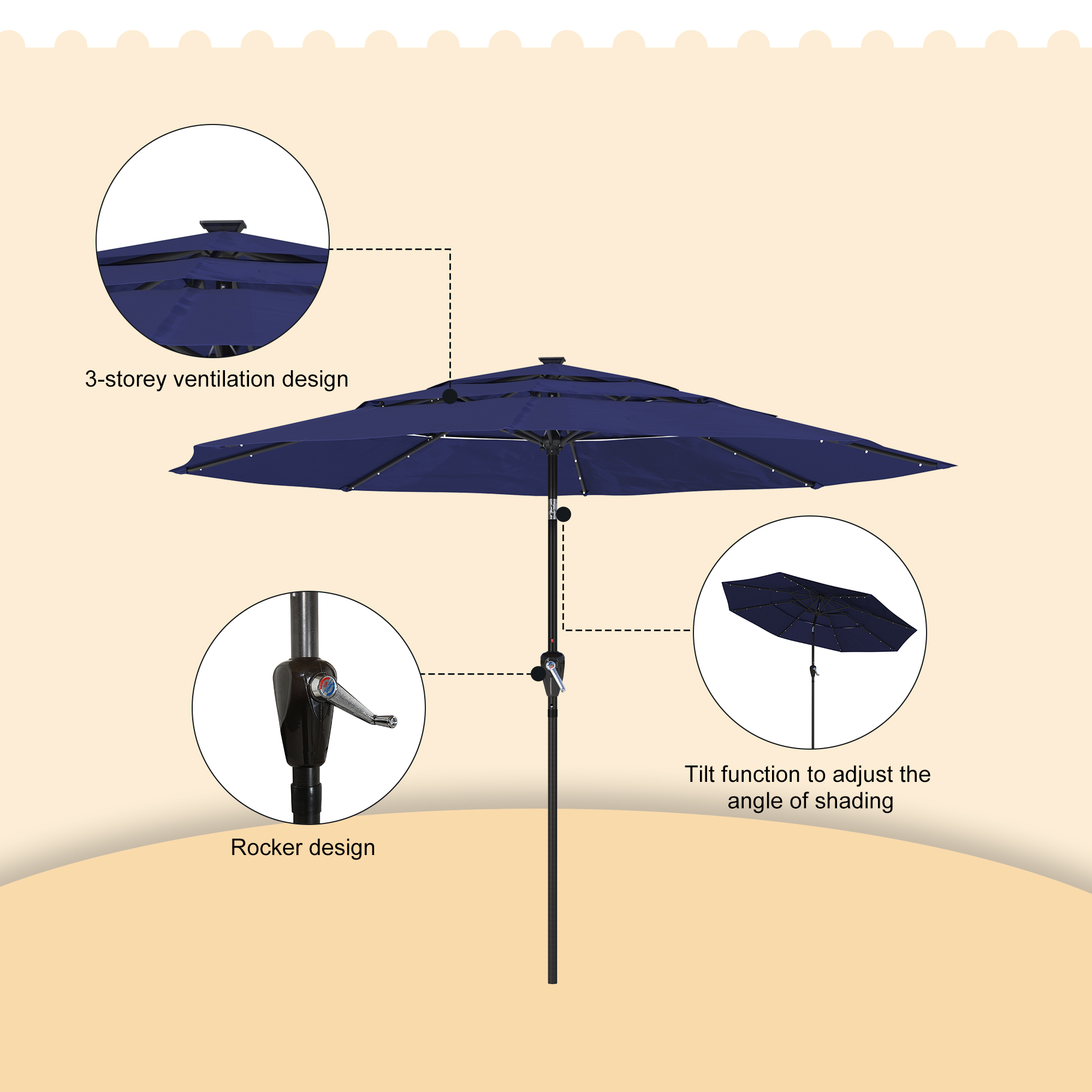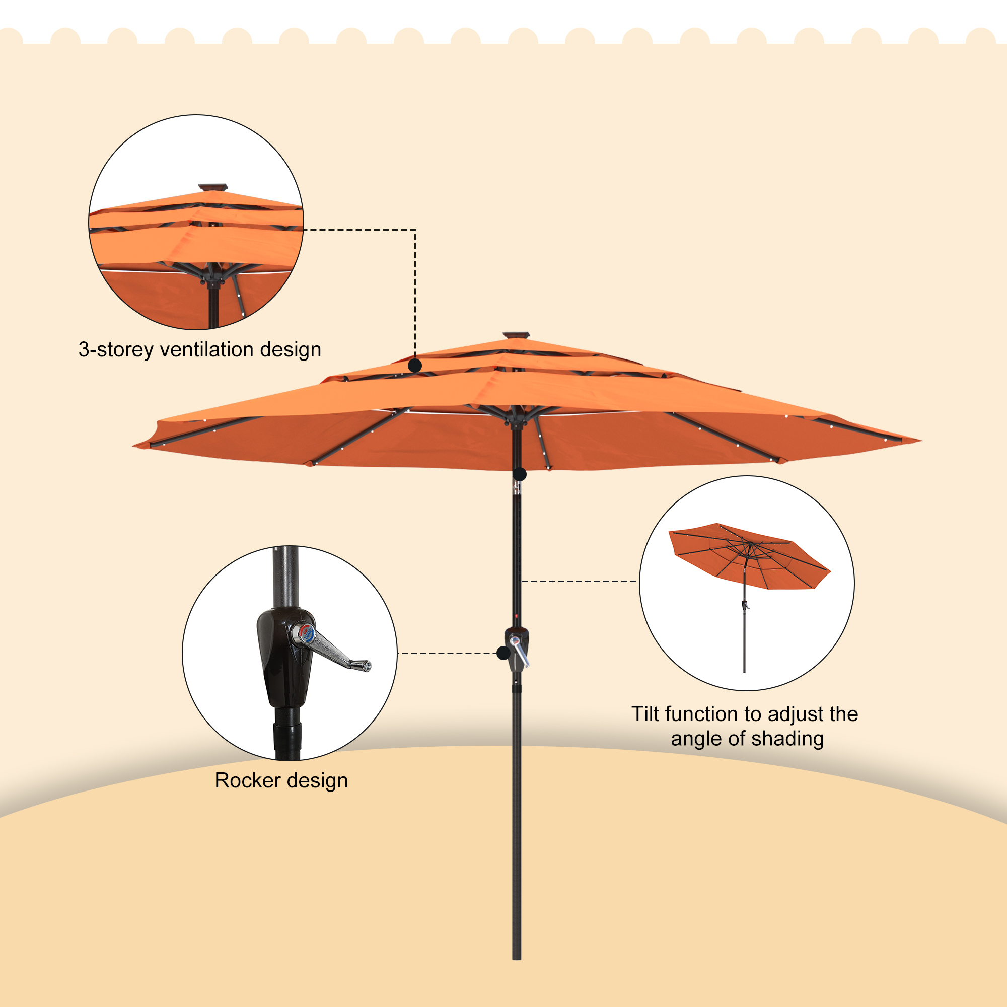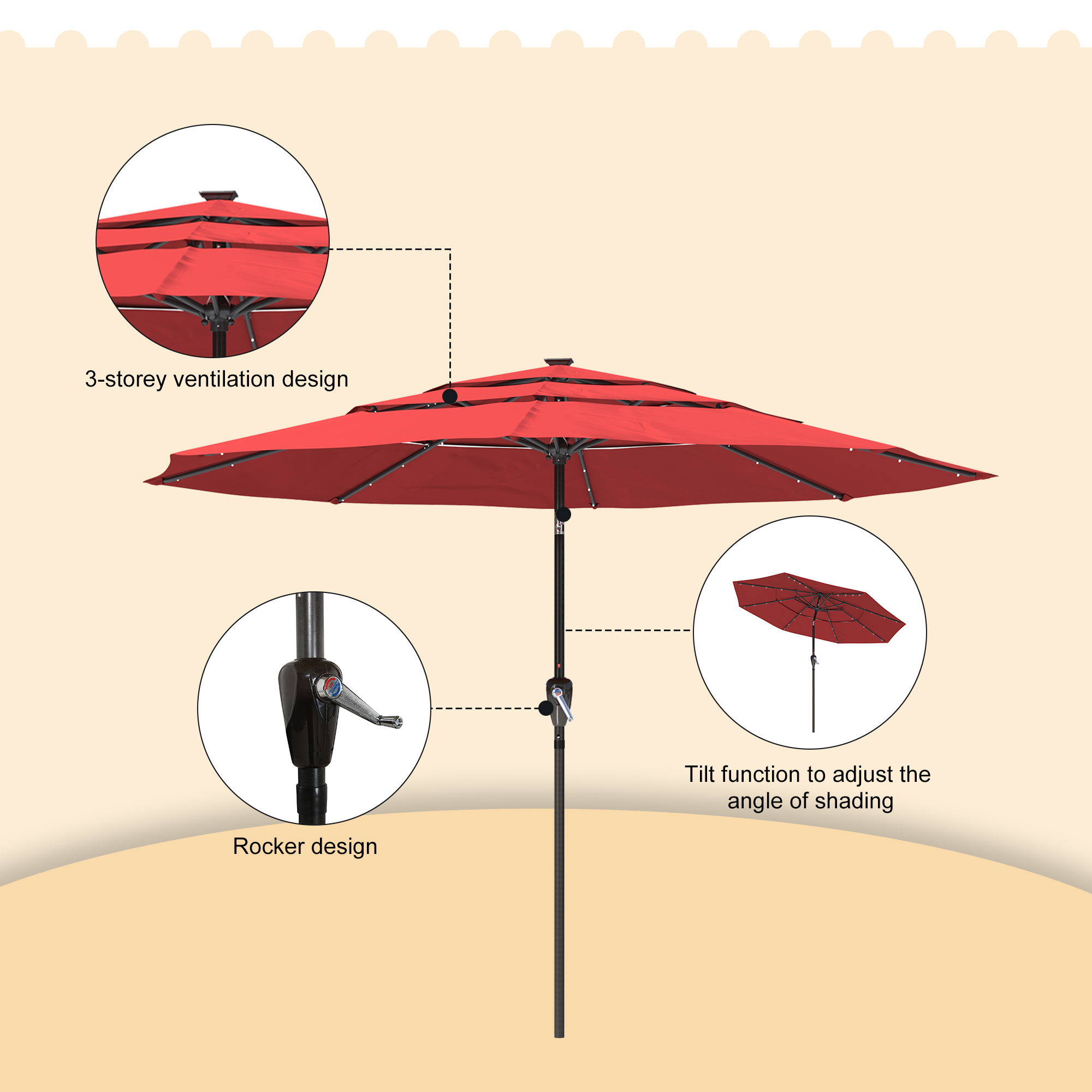 - The numerous vents will let hot air or wind to pass through rapidly, strengthening your parasol against wind and keeping the underside cooler.