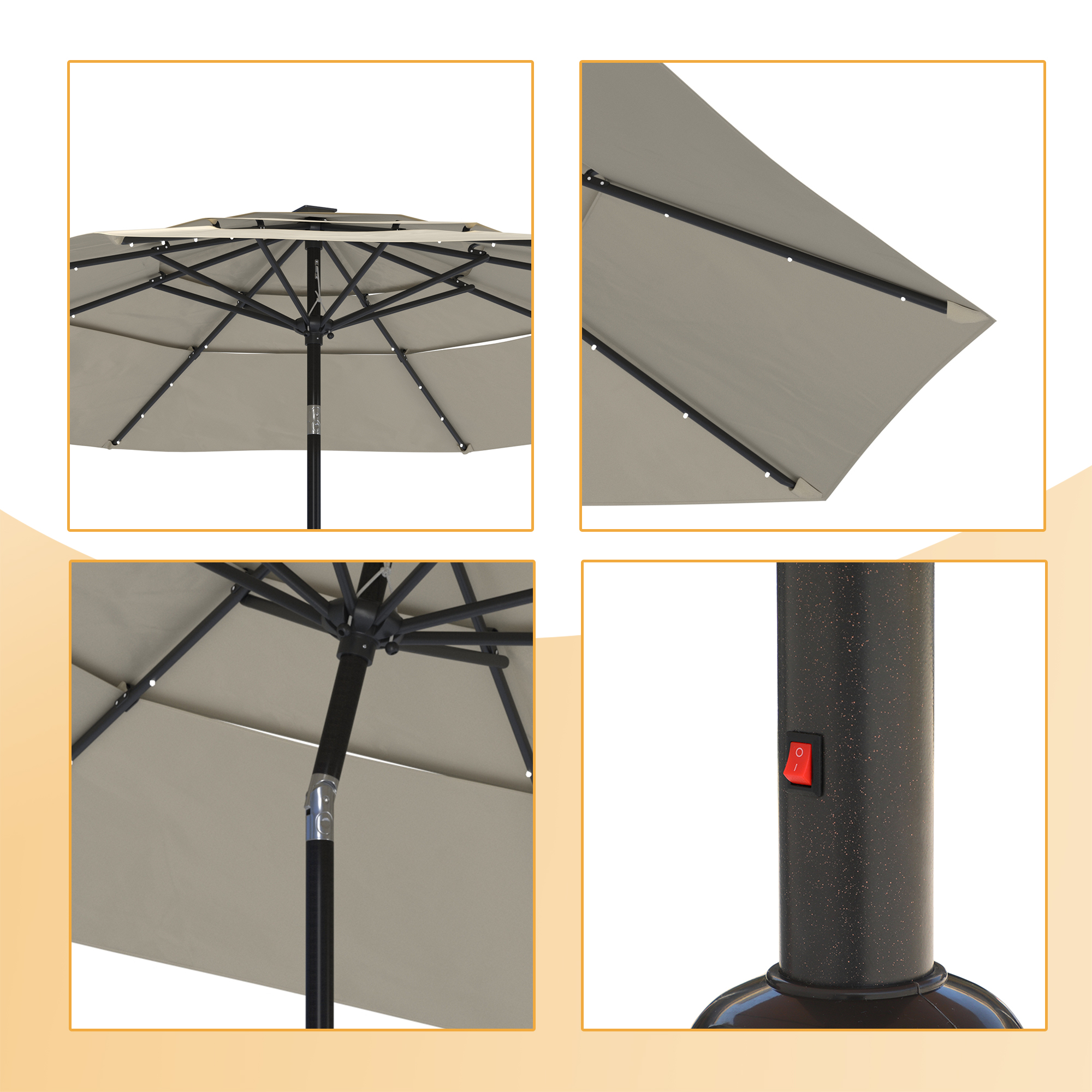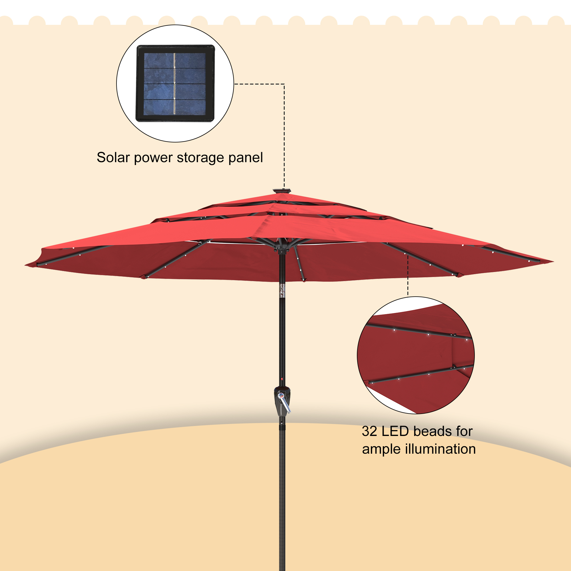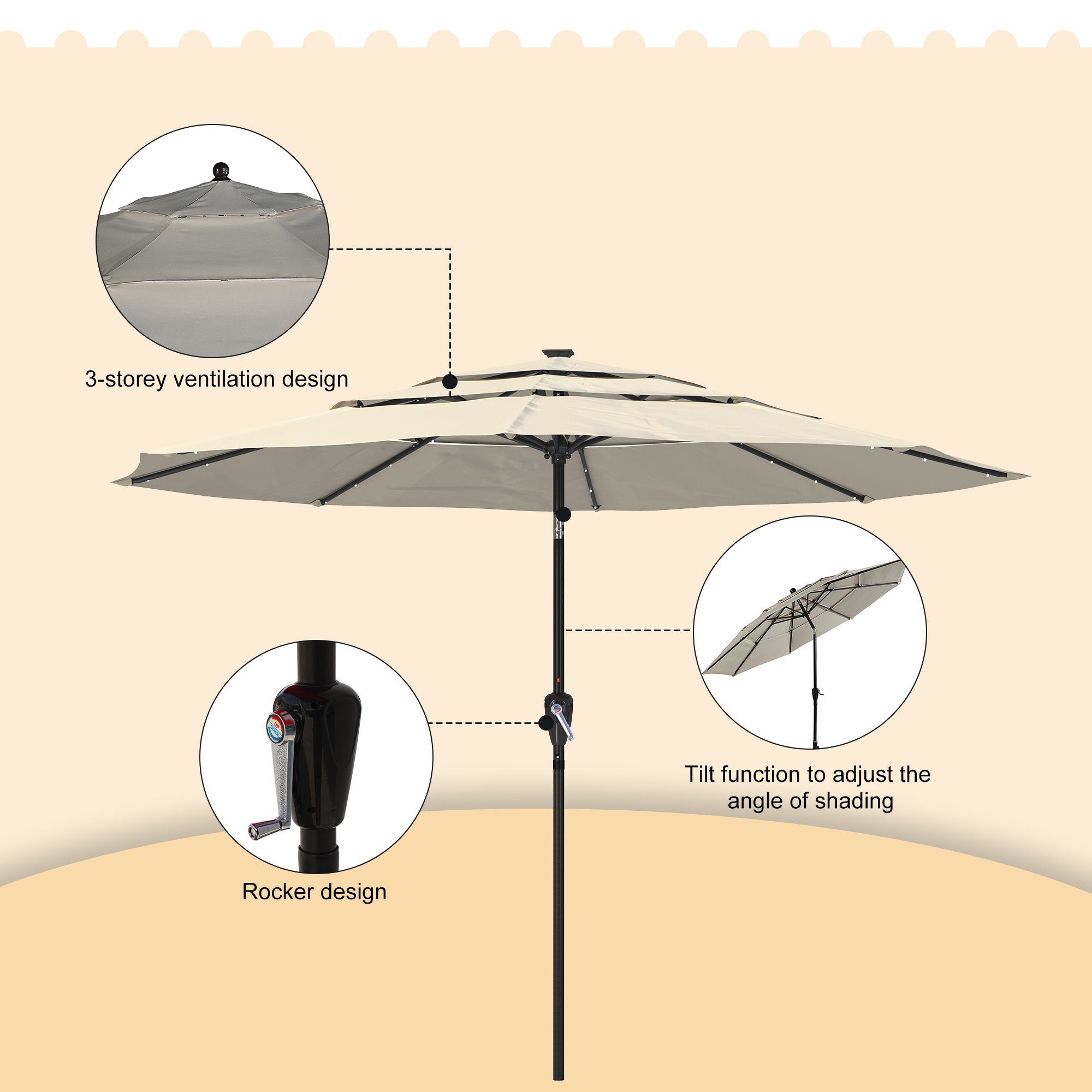 - The numerous vents will let hot air or wind to pass through rapidly, strengthening your parasol against wind and keeping the underside cooler.