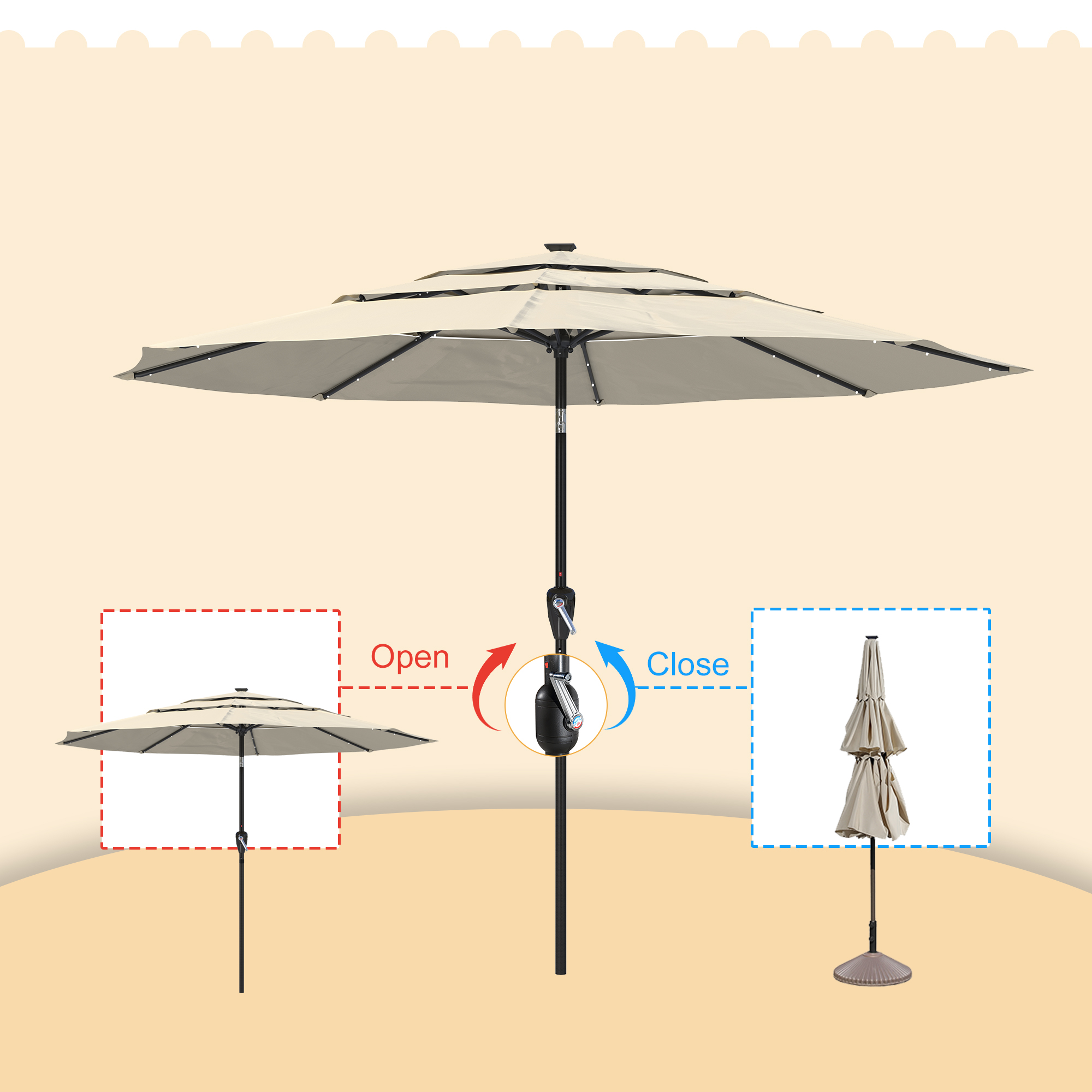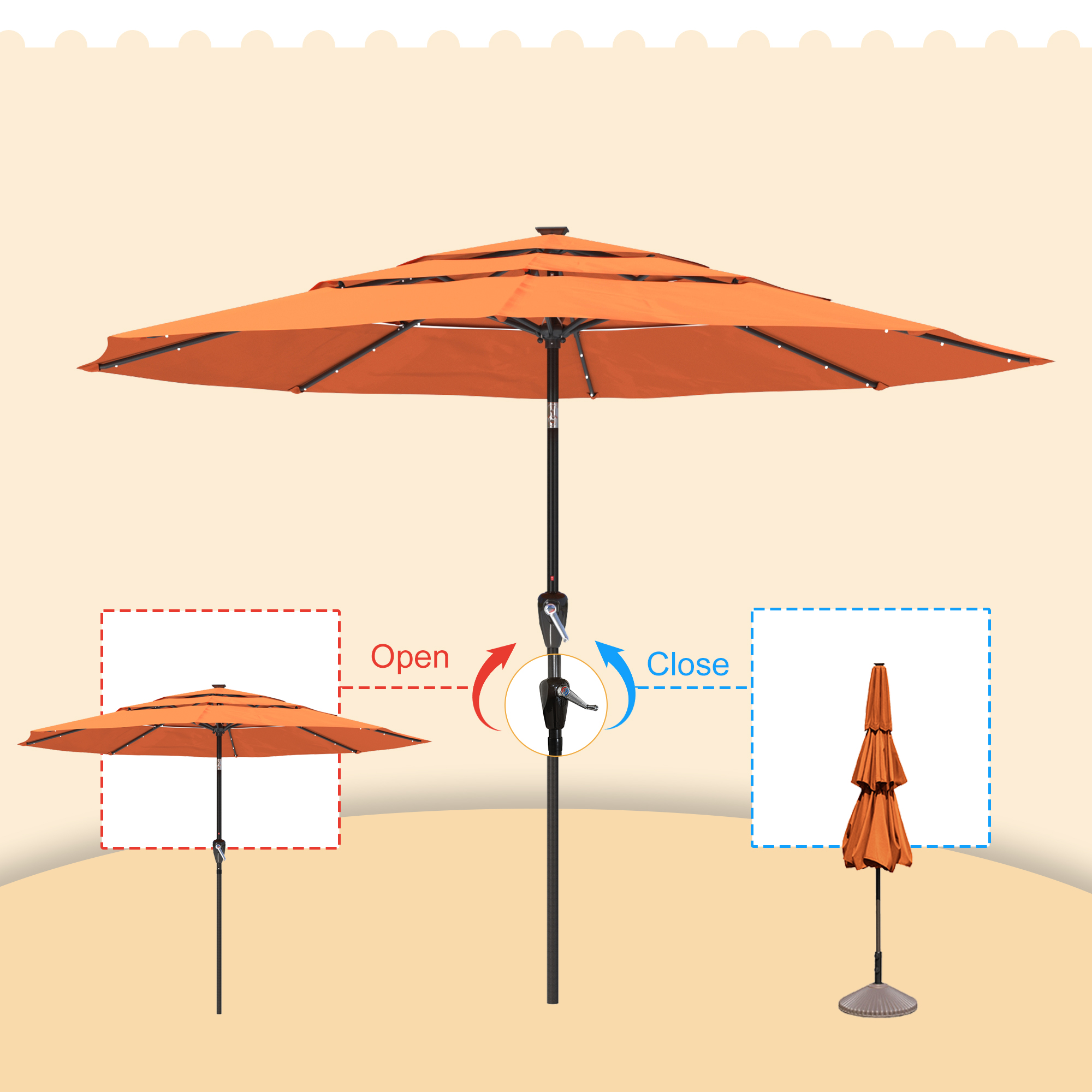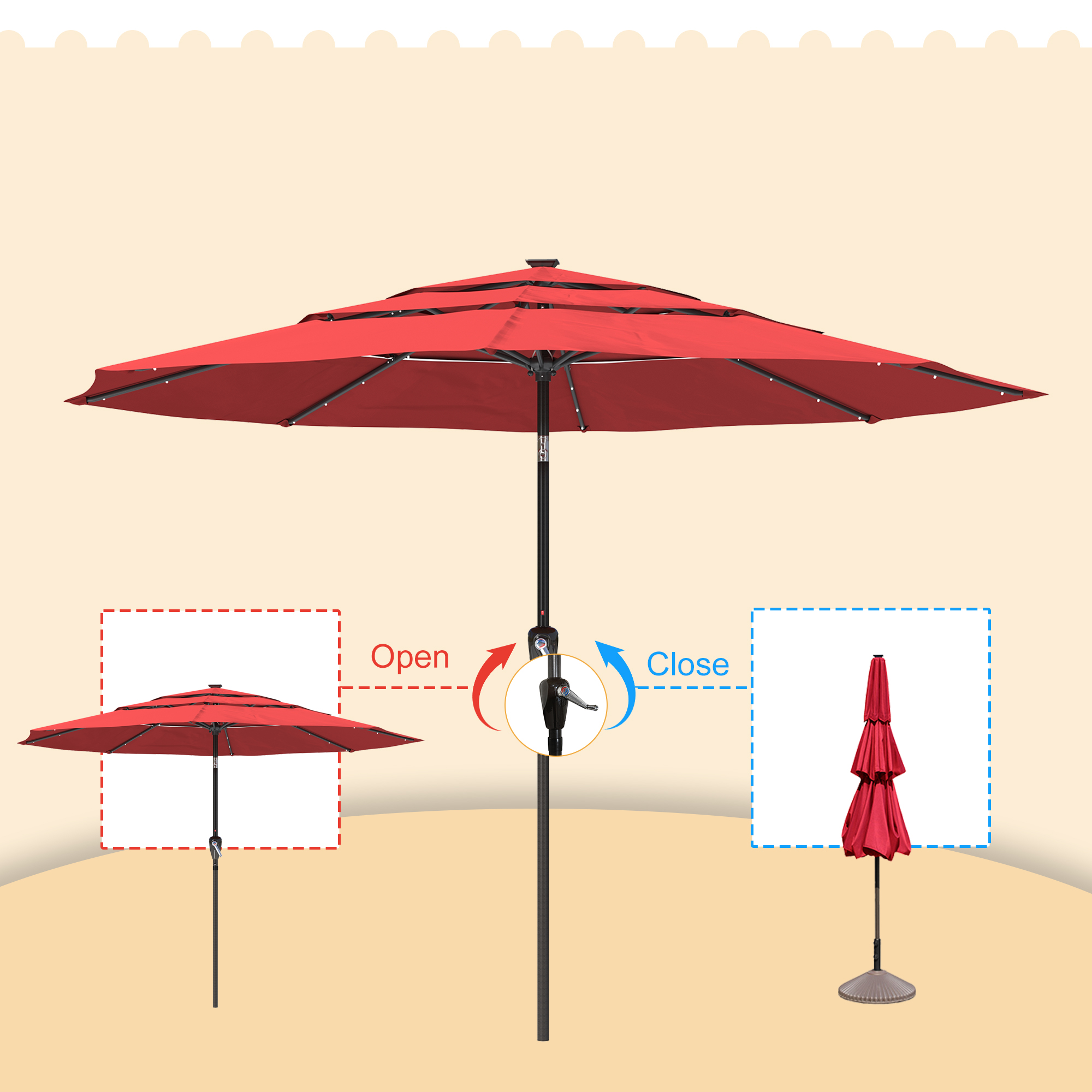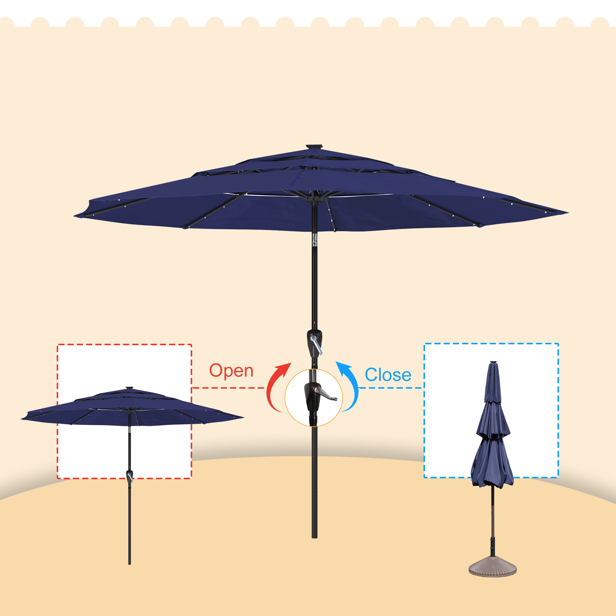 Utilize the umbrella in the evening to prolong your time spent outside. this 11-foot patio solar LED umbrella provides a whole shade area. This umbrella opens quickly and effortlessly with a crank. One base is absent from the umbrella.